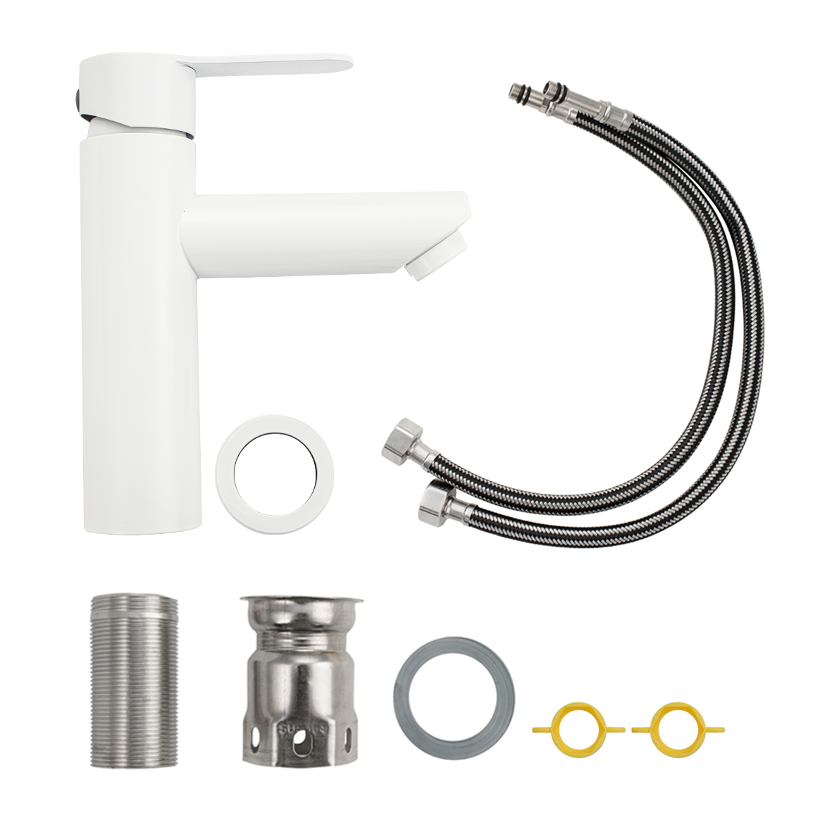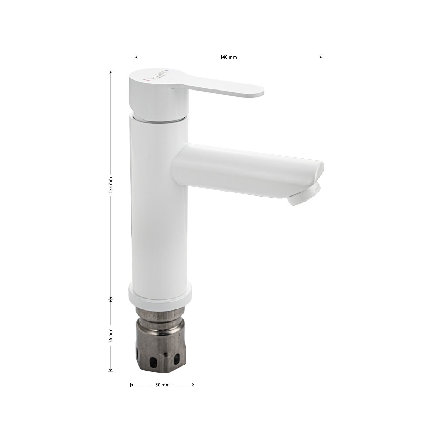 Смеситель для раковины, матовый литой корпус белого цвета, из нержавеющей стали марки 201, с коротким литым изливом, литая ручка, шаровый. Крепление резьба - гайка, картридж d = 35 мм. Аэратор для экономии воды. Такая модель может использоваться на домашней кухне, на даче, в медицинских учреждениях и общественных местах. Габаритные размеры: высота 175 мм, длина 140 мм, диаметр посадочного седла 50 мм, длина резьбы 55 мм, длина подводки 450 мм. Вес - 0.8 кг, объём - 0.002 м3. В комплекте паспорт, корпус, подводка 1/2, крепеж, набор прокладок.
