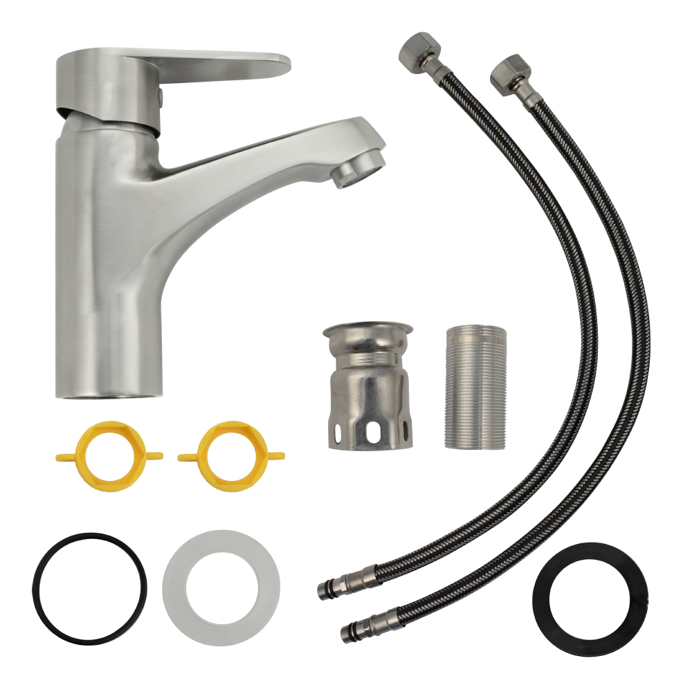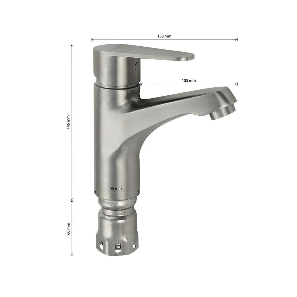 Смеситель для раковины, матовый литой корпус, из нержавеющей стали марки 304, с коротким литым изливом, литая ручка, шаровый. Крепление резьба - гайка, картридж d = 35 мм. Аэратор для экономии воды. Такая модель может использоваться на домашней кухне, на даче, в медицинских учреждениях и общественных местах. Габаритные размеры: высота 145 мм, длина 150 мм, длина излива 105 мм, диаметр посадочного седла 45 мм, длина резьбы 60 мм, длина подводки 450 мм. Вес - 1,750 кг, объём - 0,00237 м3. В комплекте паспорт, корпус, подводка 1/2, крепеж, набор прокладок.