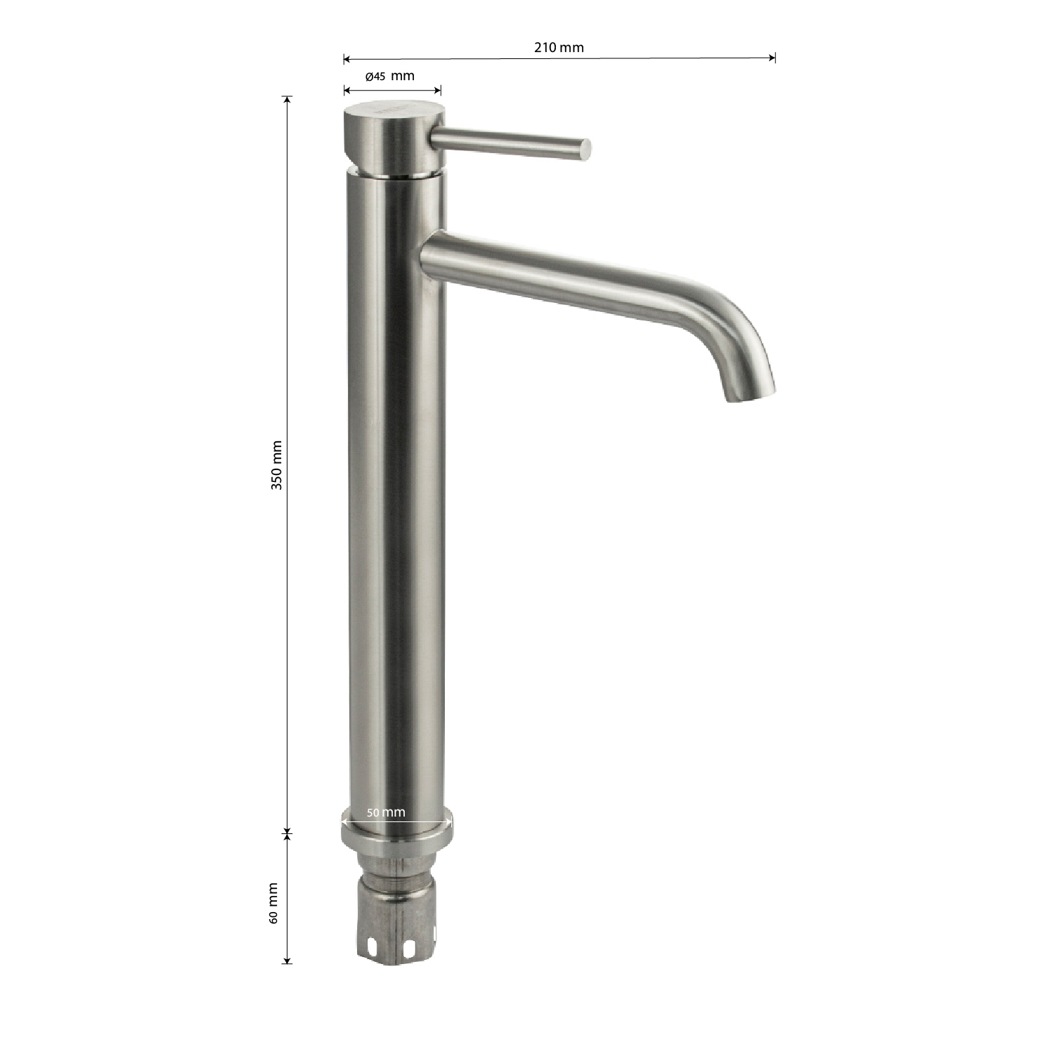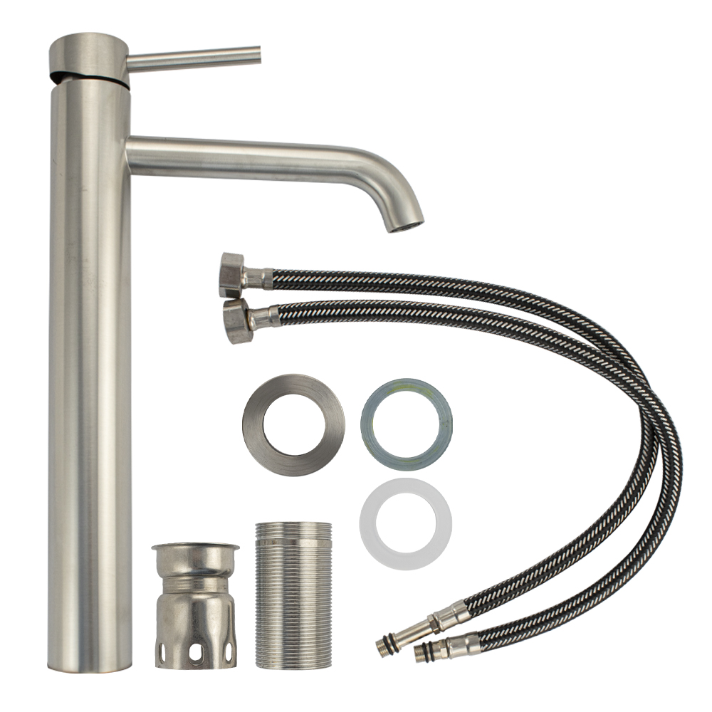 Смеситель для раковины, высокий матовый литой корпус, из нержавеющей стали марки 304, с изогнутым изливом, ручка шток, шаровый. Крепление резьба - гайка, картридж d = 35 мм. Аэратор для экономии воды. Такая модель может использоваться на домашней кухне, на даче, в медицинских учреждениях и общественных местах. Габаритные размеры: высота 350 мм, длина 210 мм, длина излива 170 мм, диаметр посадочного седла 50 мм, длина резьбы 60 мм, длина подводки 450 мм. Вес - 1,400 кг, объём - 0,00445 м3. В комплекте паспорт, корпус, подводка 1/2, крепеж, набор прокладок.