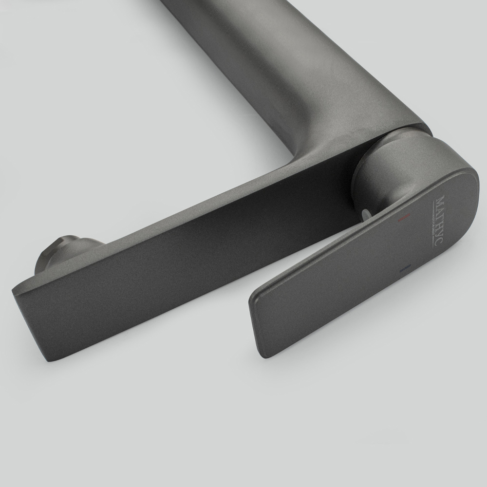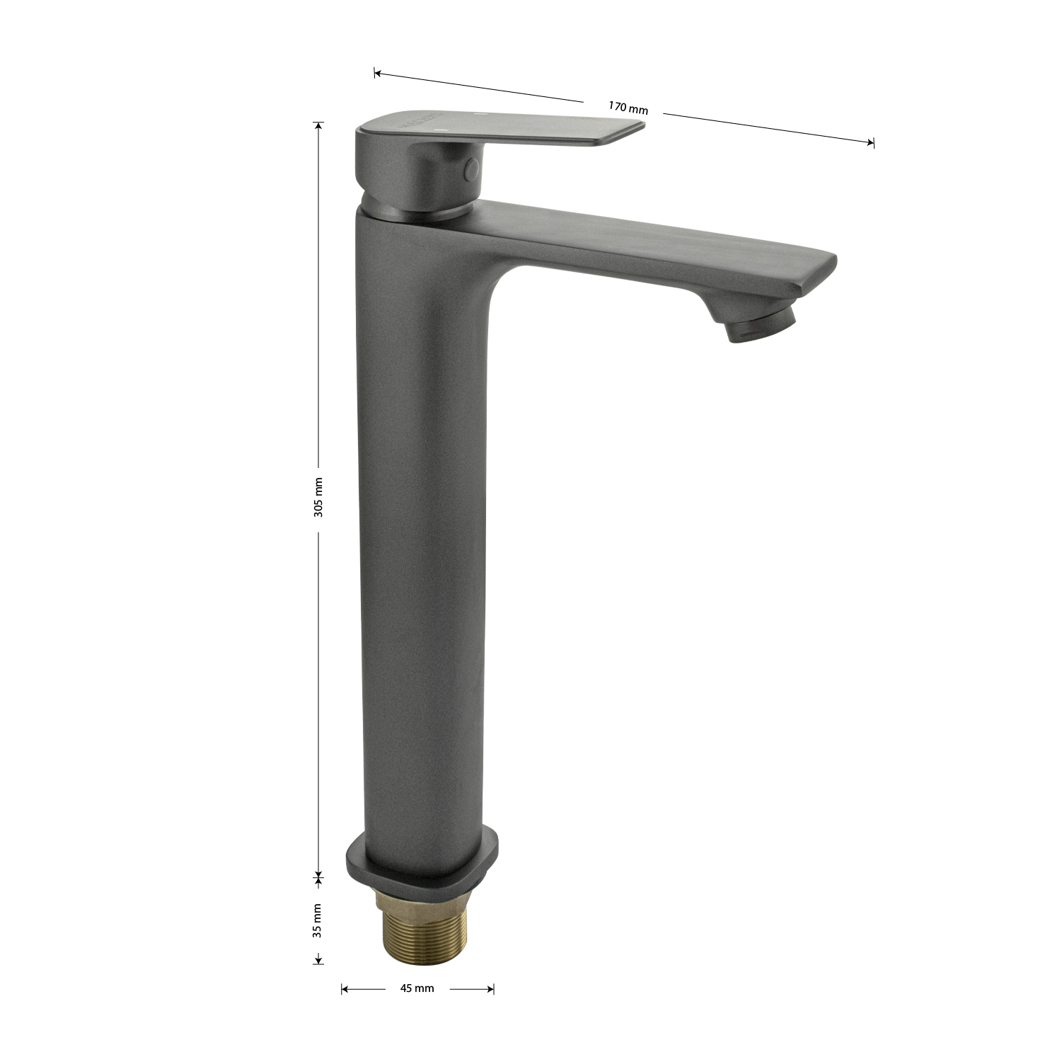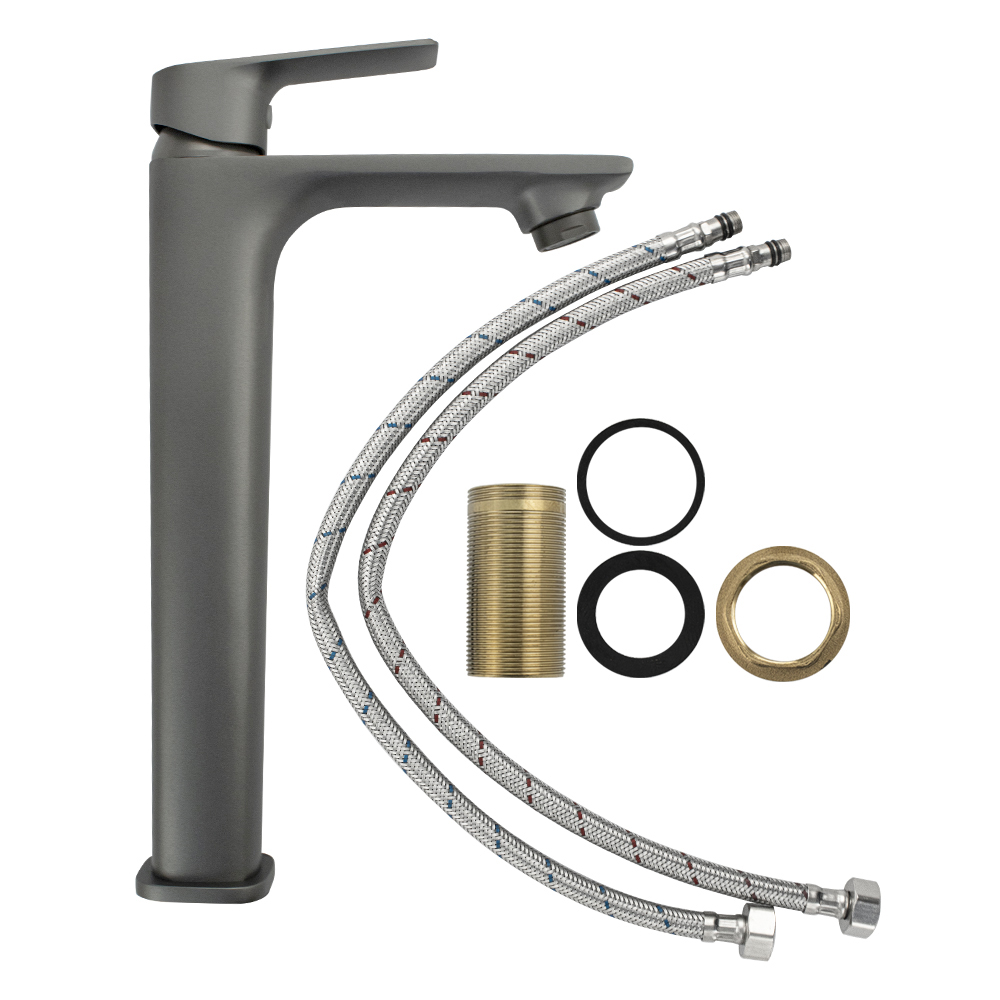 Смеситель для раковины, высокий литой корпус, цвет графит, с прямым плоским изливом, ручка литая, шаровый. Крепление резьба - гайка, картридж d = 35 мм. Аэратор для экономии воды. Такая модель может использоваться на домашней кухне, на даче, в медицинских учреждениях и общественных местах. Габаритные размеры: высота 305 мм, длина 170 мм, посадочное седло 45*45 мм, длина резьбы 35 мм, длина подводки 500 мм. Вес - 1,500 кг, объём - 0,00546 м3. В комплекте паспорт, корпус, подводка 1/2, крепеж, набор прокладок.