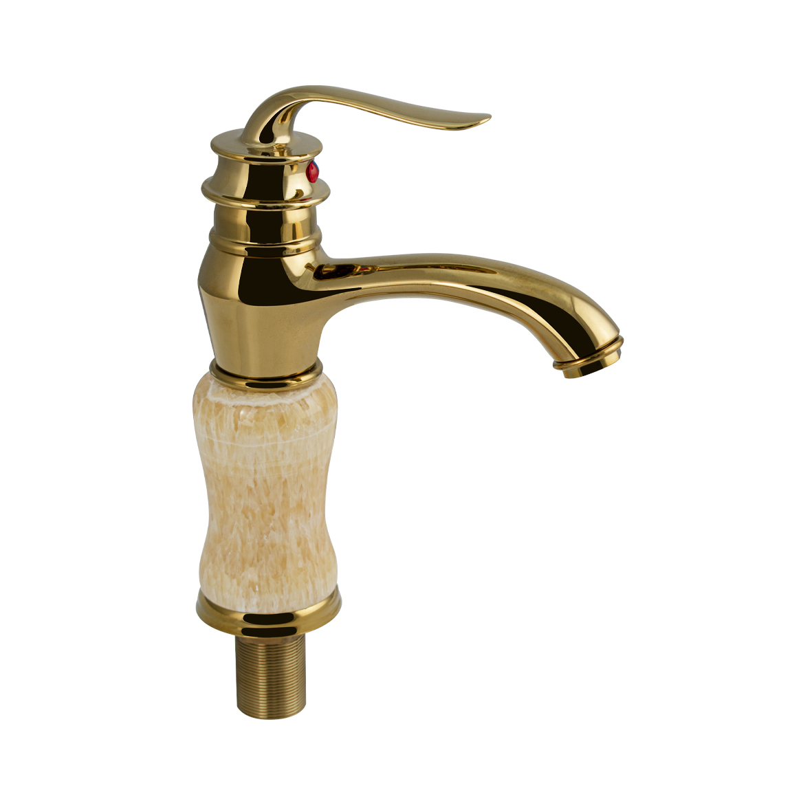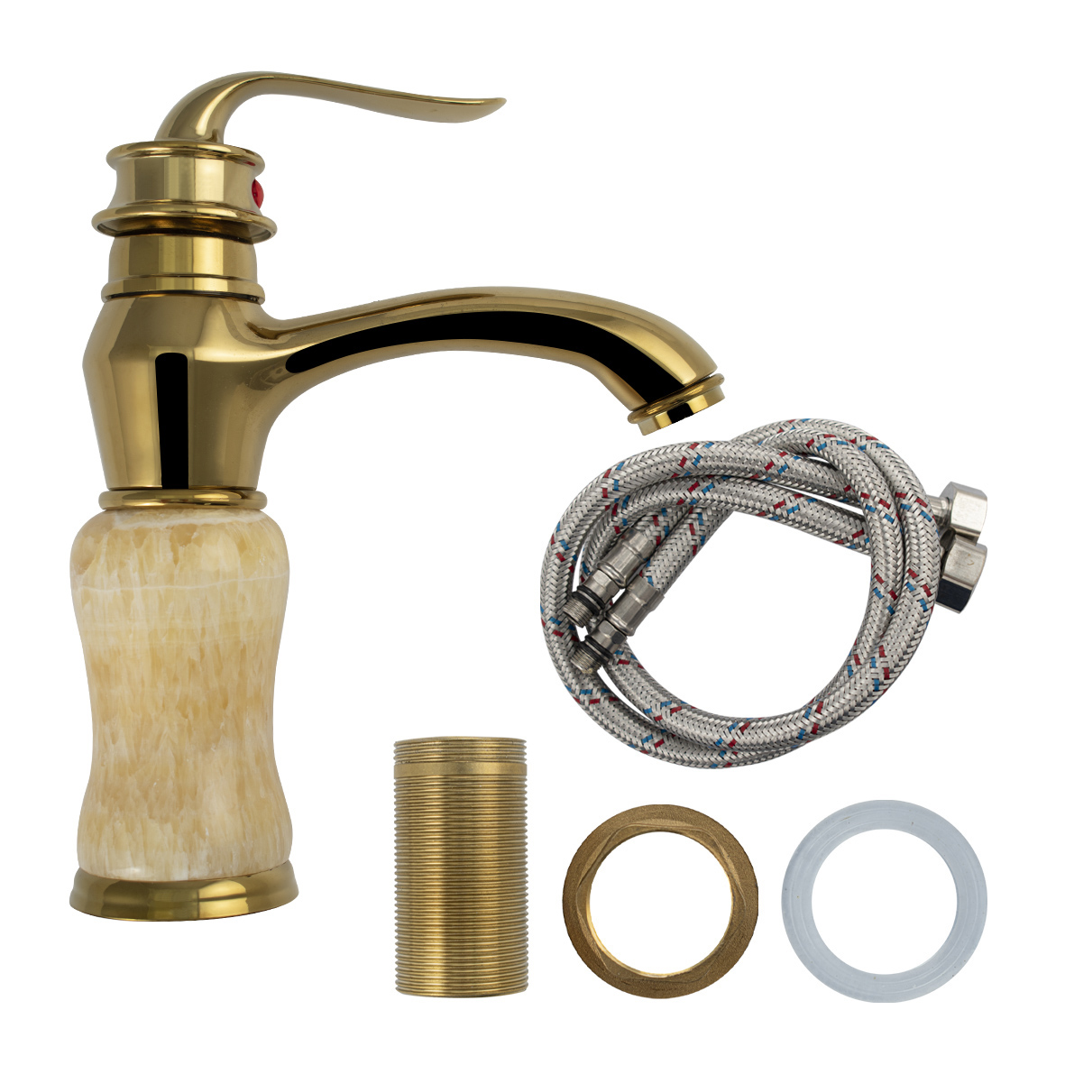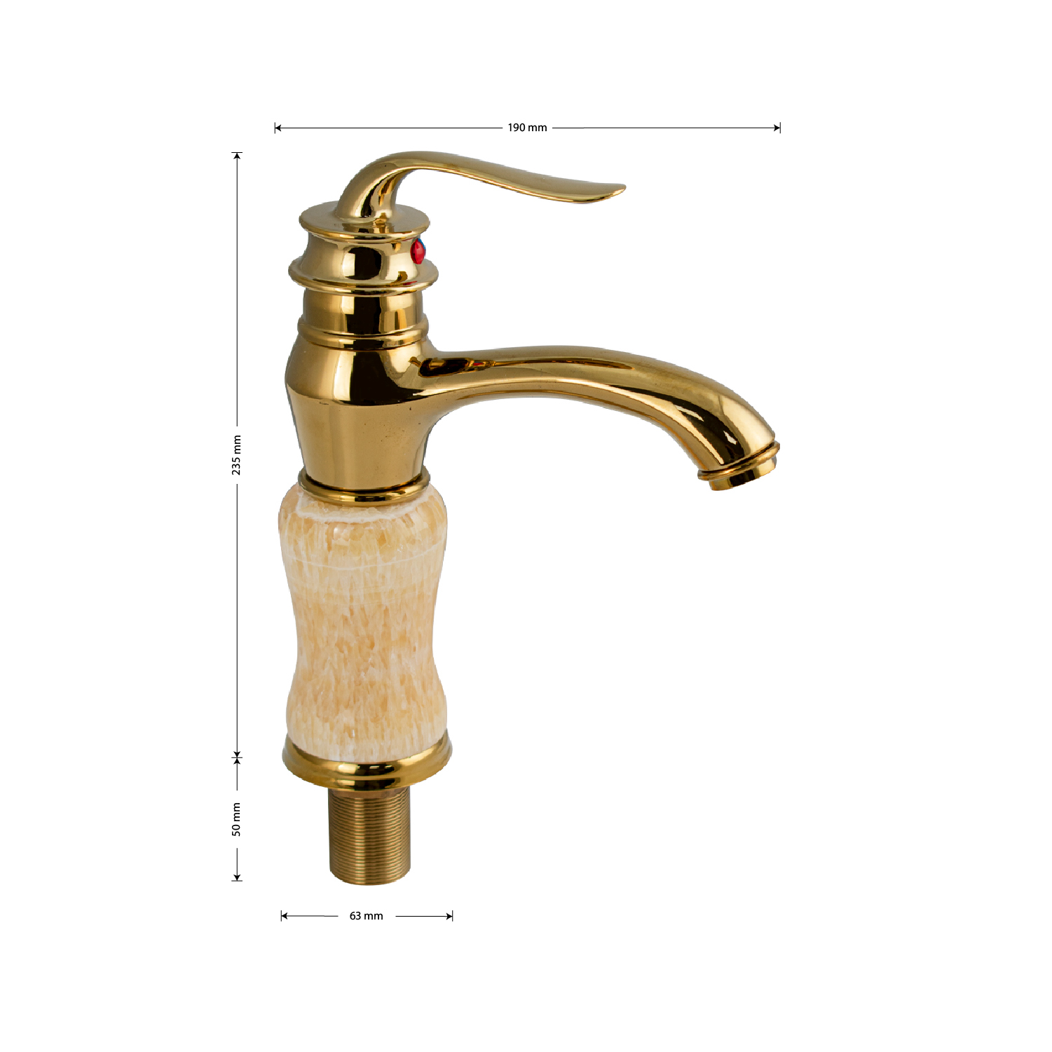 Смеситель для раковины, корпус желтый мрамор с разводами и элементами золота, с коротким литым изливом, литой корпус, литая ручка, шаровый. Материал изготовления — пластик АБС + латунь. Крепление резьба - гайка, картридж d = 40 мм. Аэратор для экономии воды. Габаритные размеры: высота 235 мм, длина 190 мм, диаметр посадочного седла 63 мм, длина резьбы 45 мм, длина подводки 500 мм. Вес - 1,17 кг, объём - 0,0055 м3. В комплекте паспорт, корпус, подводка 1/2, крепеж, набор прокладок.