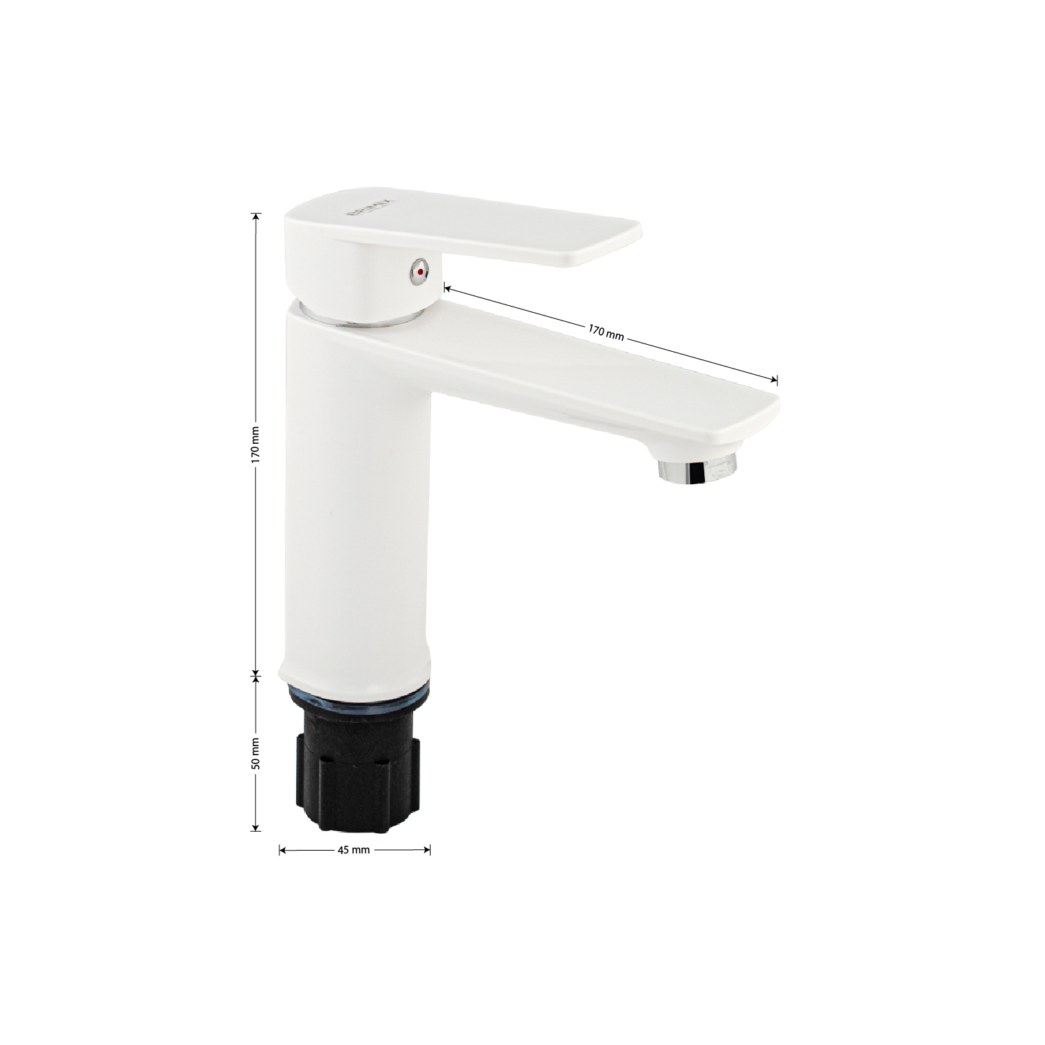 Смеситель для раковины, из высокопрочного пластика АБС, БЕЛЫЙ с коротким изливом, литой корпус, литая ручка, шаровый. Крепление резьба - гайка, картридж d = 40 мм. хромированный аэратор для экономии воды. Габаритные размеры: высота 170 мм, длина 170 мм, диаметр посадочного седла 45 мм, длина резьбы 50 мм, длина подводки 450 мм. Вес - кг, объём - м3. В комплекте паспорт, корпус, пластиковая подводка с латунными штуцерами 1/2, крепеж, набор прокладок.