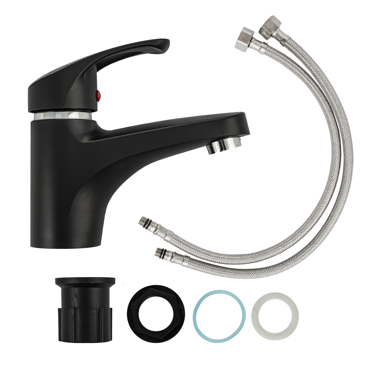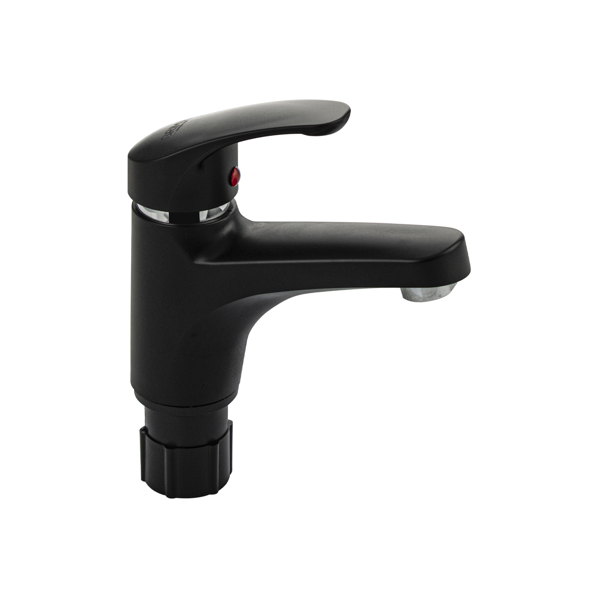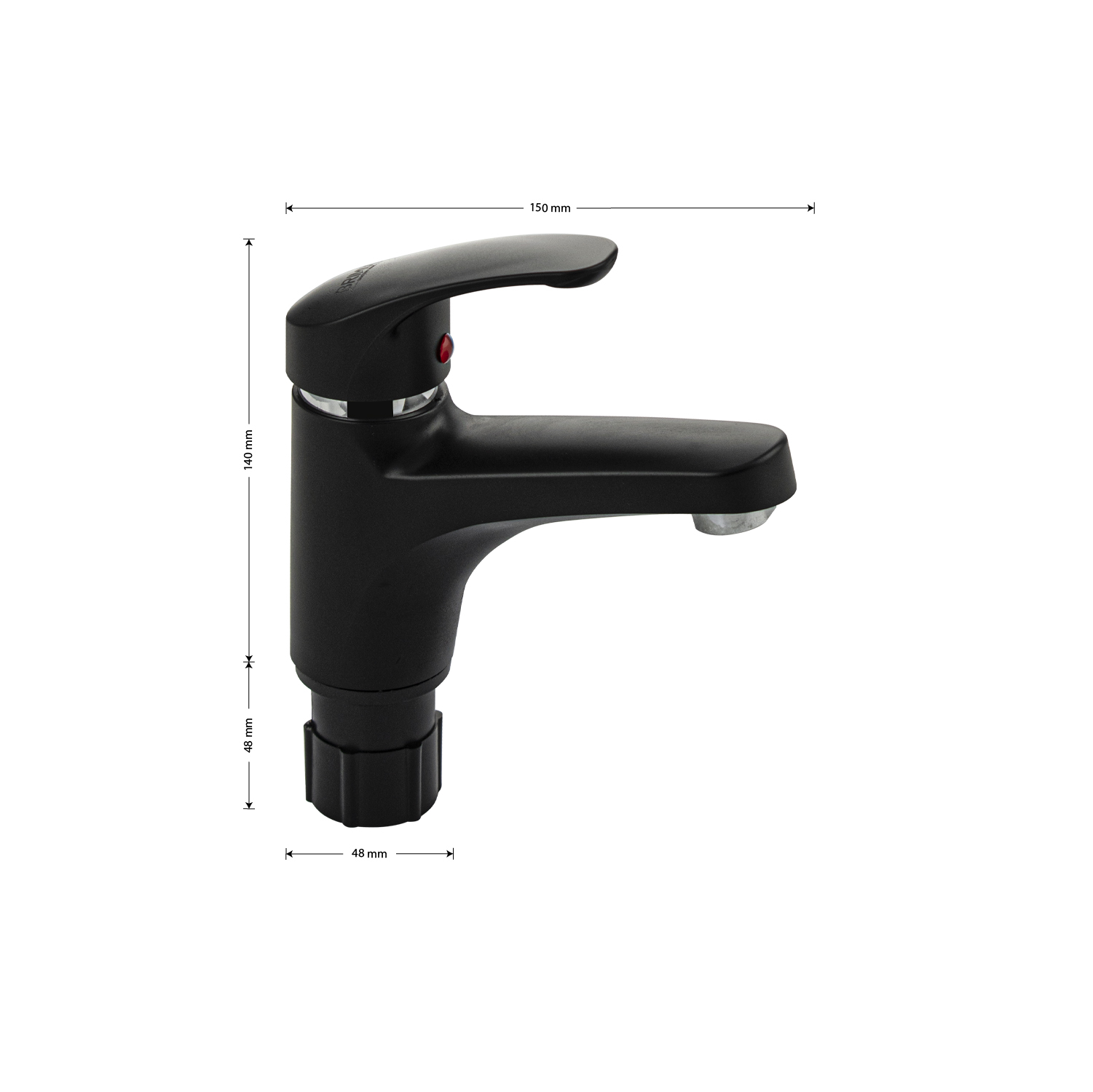 Смеситель для раковины, из высокопрочного пластика АБС, ЧЕРНЫЙ с коротким изливом, литой корпус, литая ручка, шаровый. Крепление резьба - гайка, картридж d = 40 мм. хромированный аэратор для экономии воды. Габаритные размеры: высота 140 мм, длина 150 мм, длина, диаметр посадочного седла 48 мм, длина резьбы 48 мм, длина подводки 450 мм. Вес - 0.62 кг, объём - 0.0995 м3. В комплекте паспорт, корпус, пластиковая подводка с латунными штуцерами 1/2, крепеж, набор прокладок.
