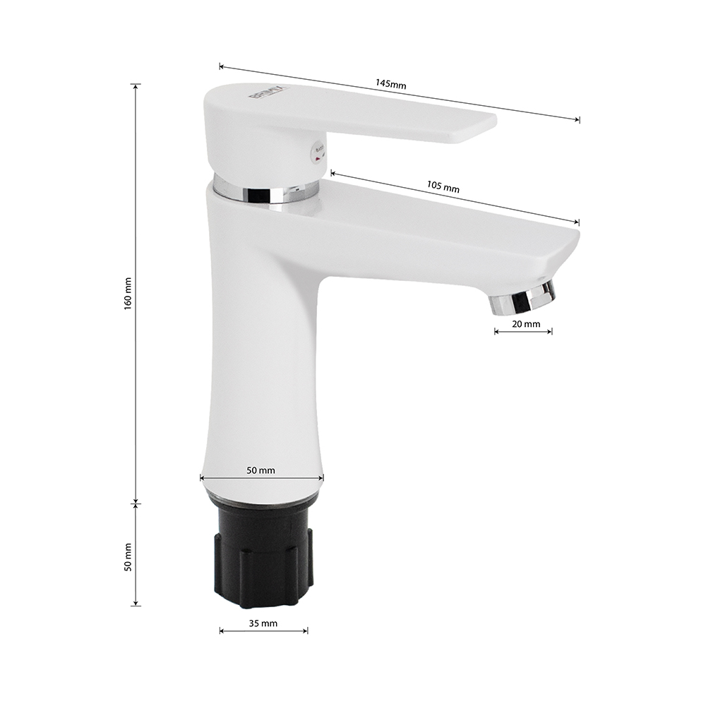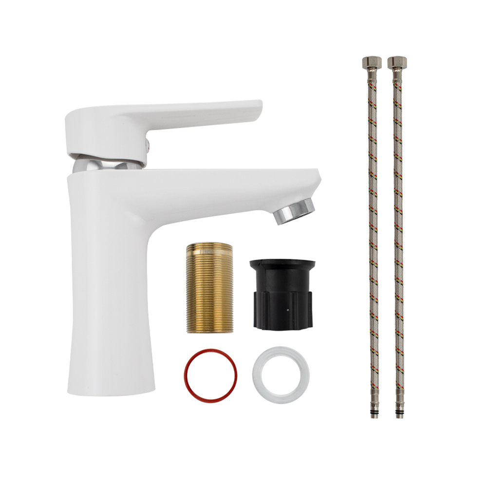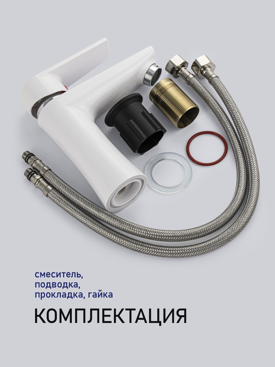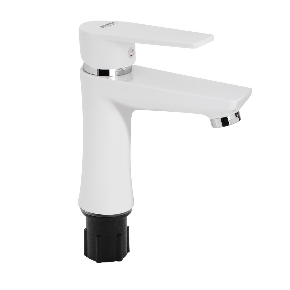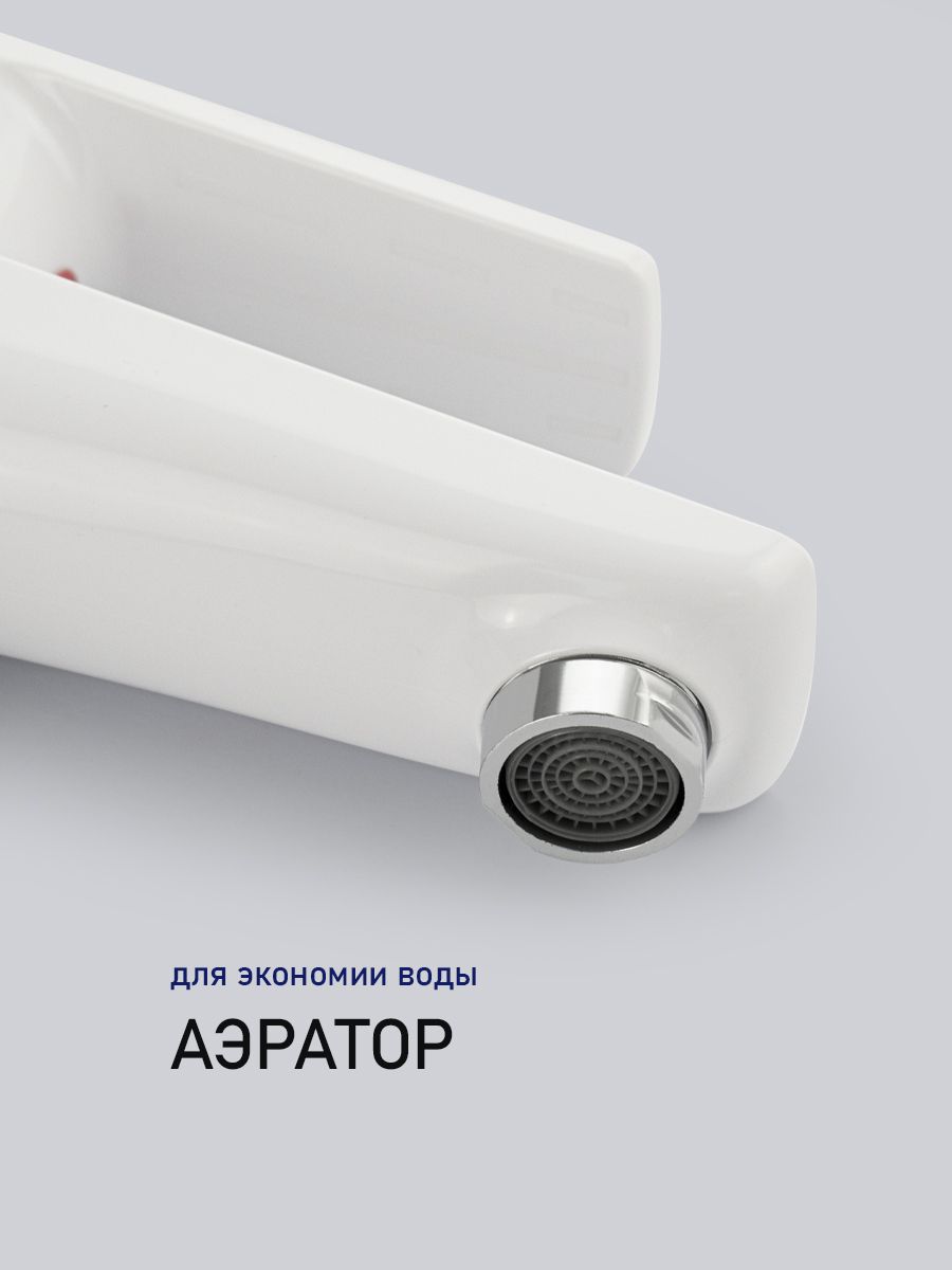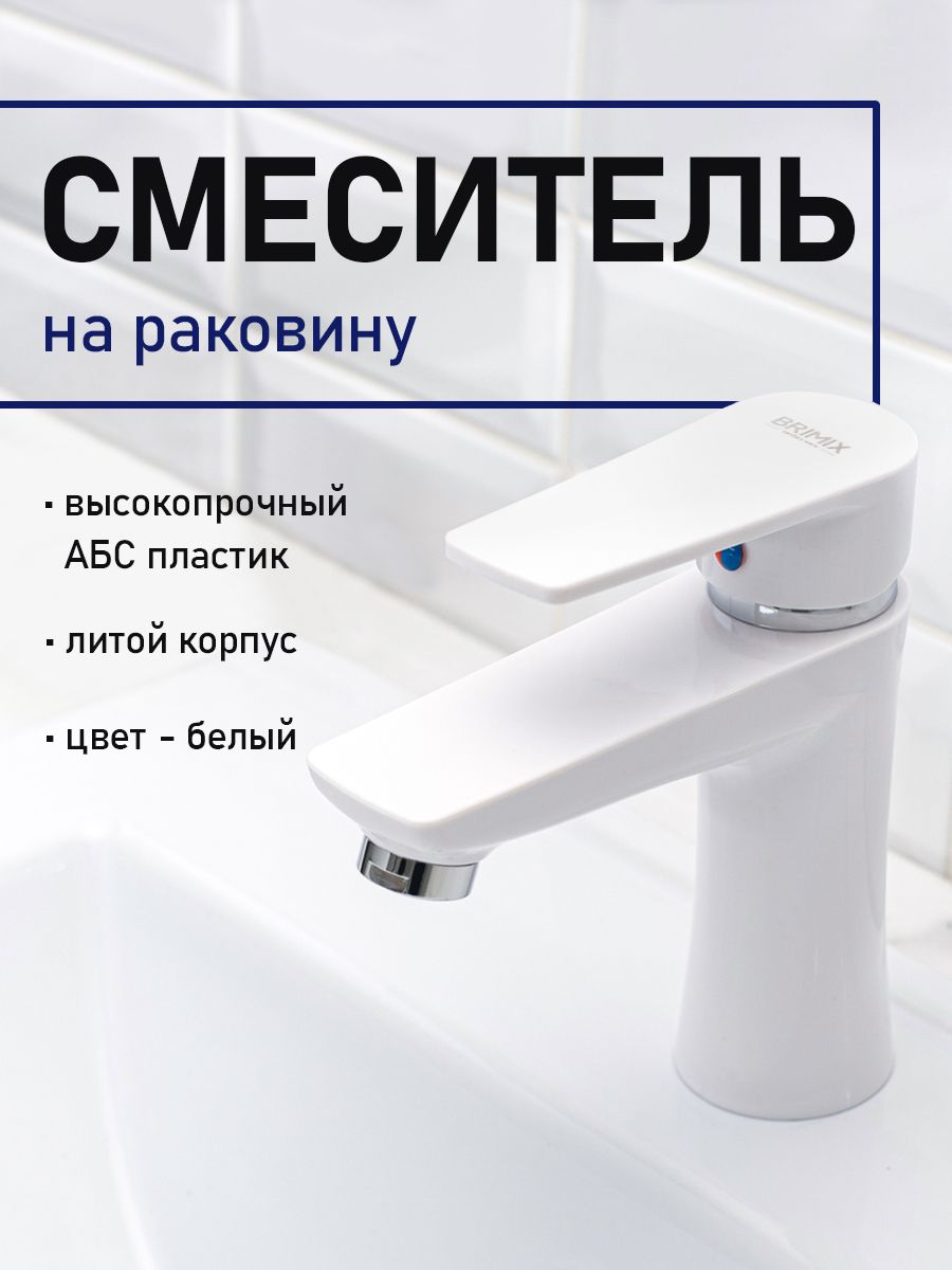 Смеситель для раковины, из высокопрочного пластика АБС, БЕЛЫЙ с коротким изливом, литой корпус, литая ручка, шаровый. Крепление резьба - гайка, картридж d = 40 мм. хромированный, аэратор для экономии воды. Габаритные размеры: высота 160 мм, длина 145 мм, длина излива 105 мм, диаметр посадочного седла 50 мм, длина резьбы 50 мм, длина подводки 400 мм. Вес - 0,600 кг, объём - 0,00417 м3. В комплекте паспорт, корпус, пластиковая подводка с латунными штуцерами 1/2, крепеж, набор прокладок.