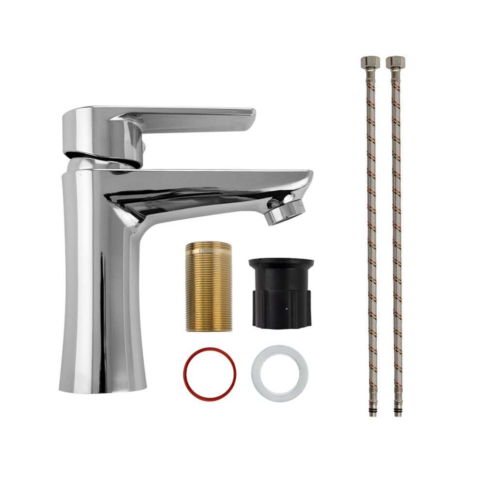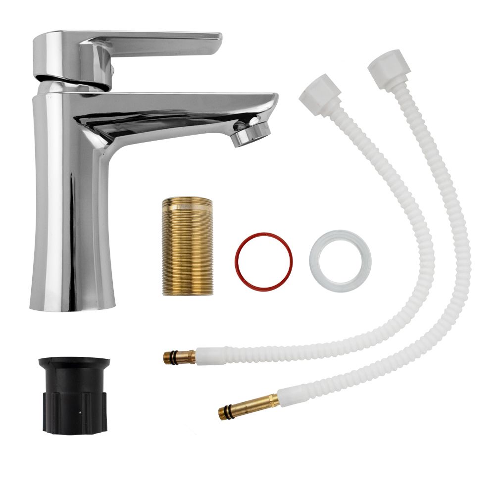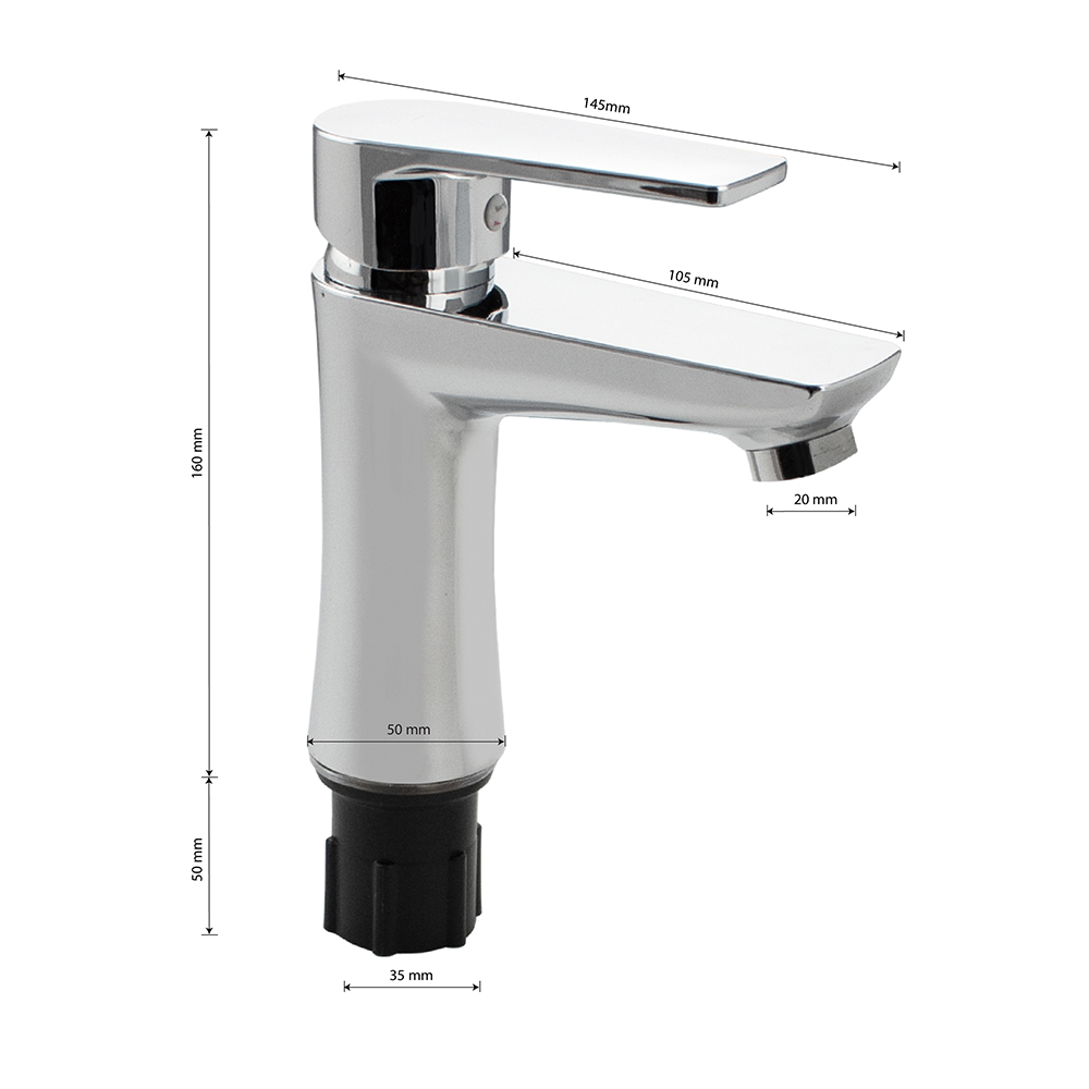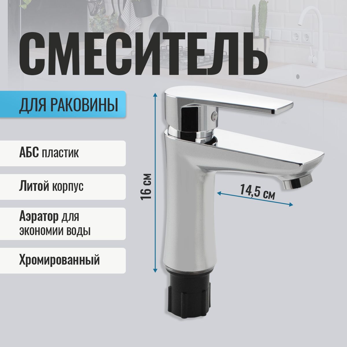 Смеситель для раковины, из высокопрочного пластика АБС, ХРОМИРОВАННЫЙ с коротким изливом, литой корпус, литая ручка, шаровый. Крепление резьба - гайка, картридж d = 40 мм, хромированный, аэратор для экономии воды. Габаритные размеры: высота 160 мм, длина 145 мм, длина излива 105 мм, диаметр посадочного седла 50 мм, длина резьбы 50 мм, длина подводки 400 мм. Вес - 0,650 кг, объём - 0,00417 м3. В комплекте паспорт, корпус, пластиковая подводка с латунными штуцерами 1/2, крепеж, набор прокладок.