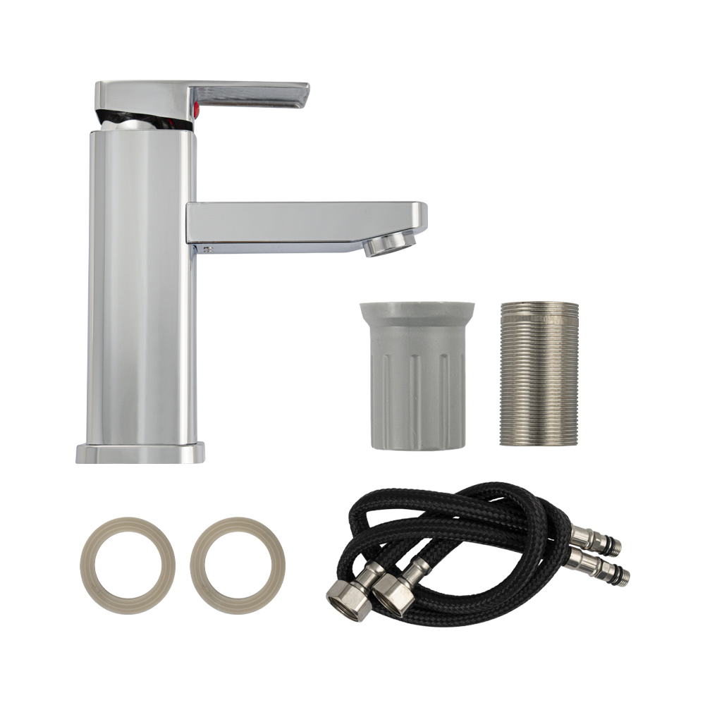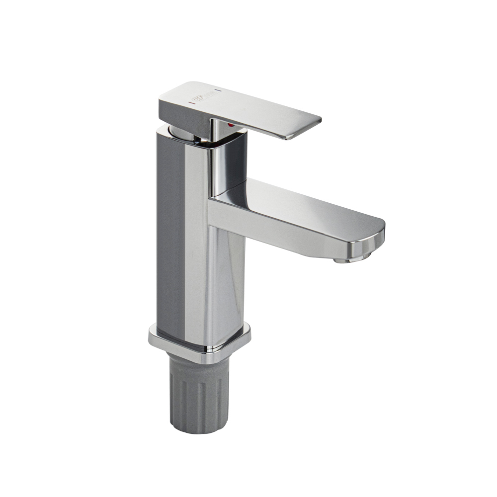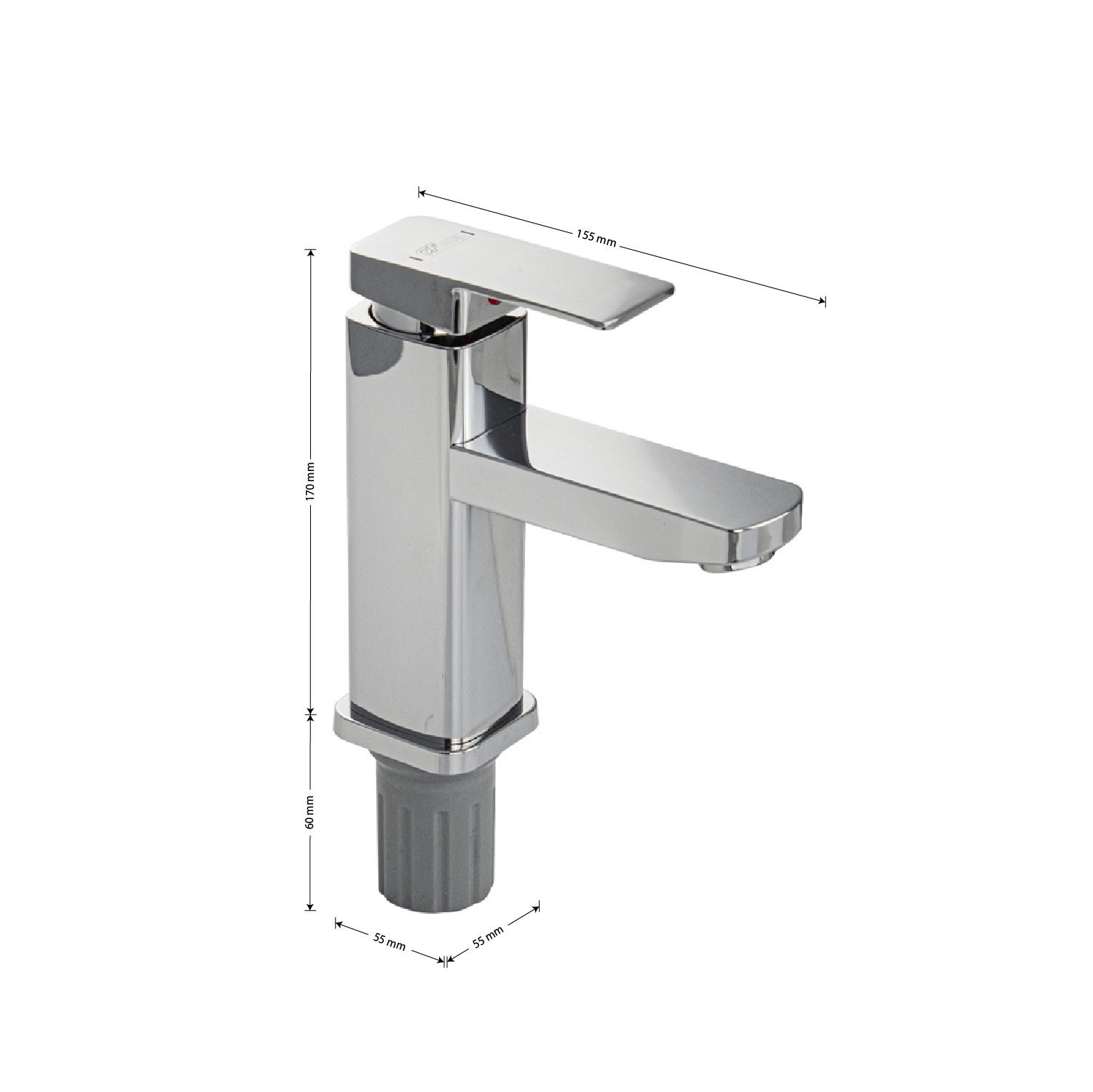 Смеситель для раковины, модель элегант, из высокопрочного пластика АБС, ХРОМ с коротким изливом, литой квадратный корпус, литая ручка, шаровый. Крепление резьба - гайка, картридж d = 40 мм. хромированный аэратор для экономии воды. Габаритные размеры: высота 170 мм, длина 155 мм, посадочное седло 55*55 мм, длина резьбы 60 мм, длина подводки 450 мм. Вес - 0.92 кг, объём - 0.00273 м3. В комплекте паспорт, корпус, пластиковая подводка с латунными штуцерами 1/2, крепеж, набор прокладок.
