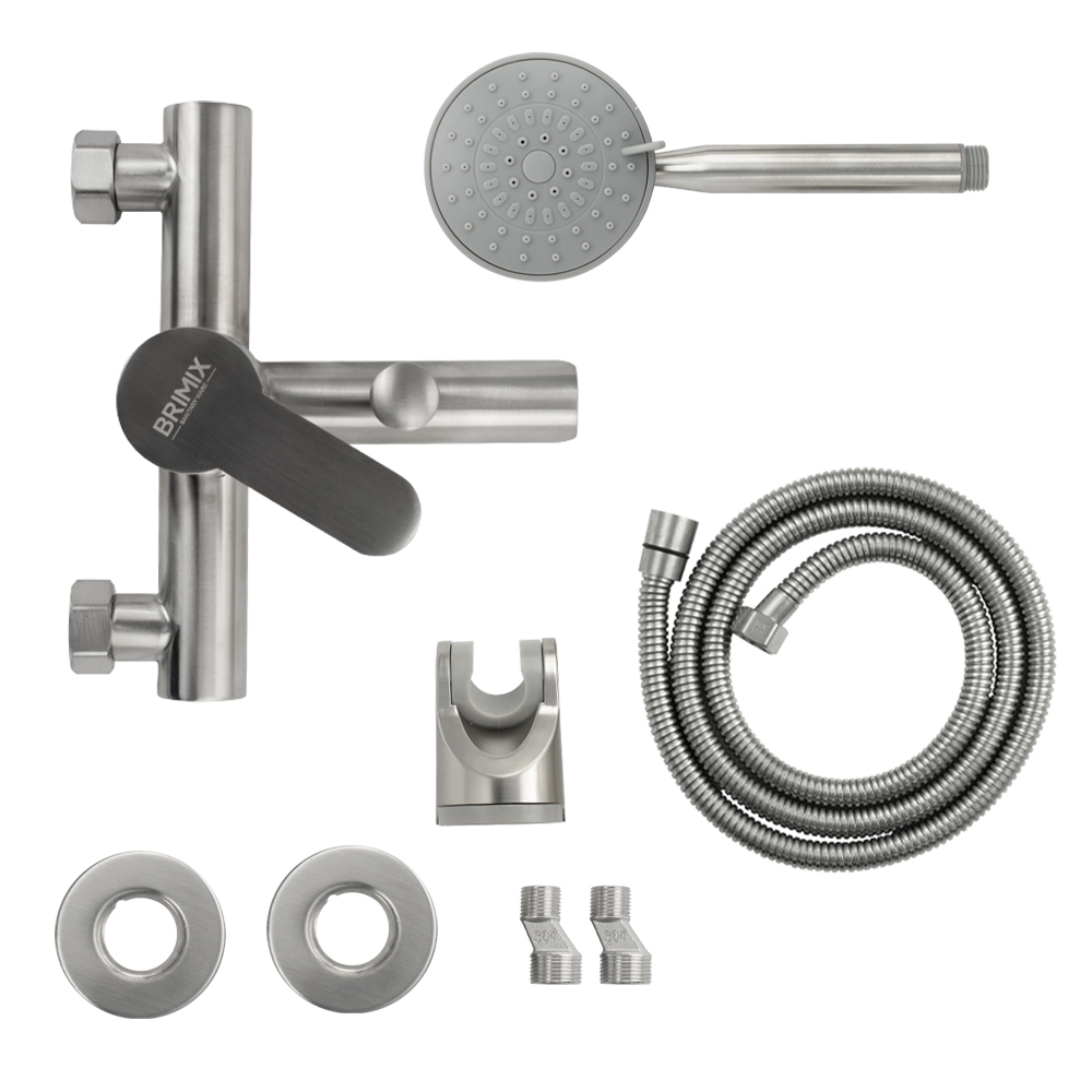 Смеситель матовый из нержавеющей стали марки 304 в ванную / душевую комнату, с коротким литым изливом. Картридж d = 35 мм, ручка литая. Дутый, большой корпус с дивертором м/к на корпусе, аэратор для экономии воды, чашки нержавеющая сталь, гайки и эксцентрики из нержавеющей стали. Габаритные размеры: ширина 150 мм, высота 75 мм, длина излива 105 мм, диаметр чашки 60 мм, длина шланга 150 см, лейка d = 100 мм. Вес - 1,81 кг, объём - 0,00600 м3. В комплекте корпус с изливом, дивертор, кронштейн, паспорт, крепёж, прокладки, лейка, шланг.