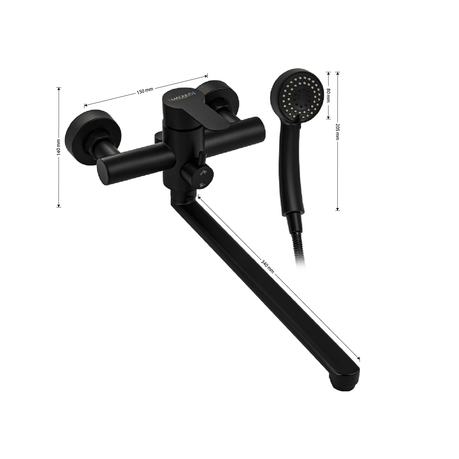 Смеситель цвет черный, из нержавеющей стали марки 304 в ванную / душевую комнату, с поворотным длинным плоским изливом. Картридж d = мм, ручка литая. Дутый, большой круглый корпус с дивертором м/к на корпусе, аэратор для экономии воды, чашки, гайки и эксцентрики из нержавеющей стали. Габаритные размеры: ширина 150 мм, высота 140 мм, длина излива 340 мм, диаметр чашки 60 мм, длина шланга 150 см, лейка d = 80 мм. Вес - 1.89 кг, объём - 0.00757 м3. В комплекте корпус с изливом, дивертор, кронштейн, паспорт, крепёж, прокладки, лейка, шланг.