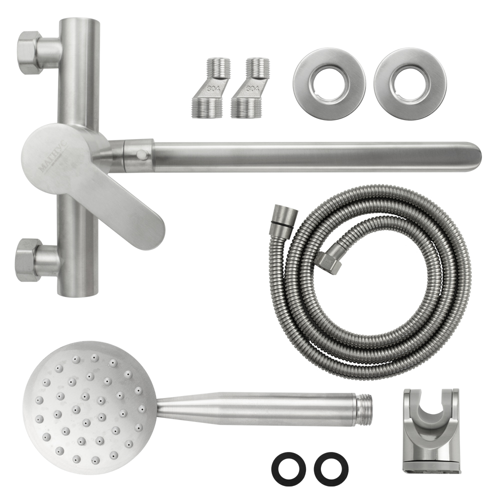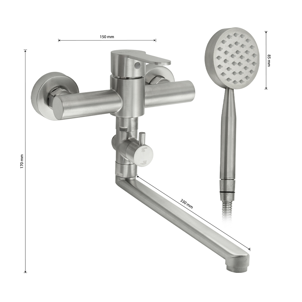 Смеситель матовый, из нержавеющей стали марки 304, в ванную / душевую комнату, с поворотным длинным плоским изливом. Картридж d = 40 мм, ручка литая. Дутый, большой круглый корпус с дивертором м/к, аэратор для экономии воды, чашки, гайки и эксцентрики из нержавеющей стали. Габаритные размеры: ширина 150 мм, высота 170 мм, длина излива 330 мм, диаметр чашки 60 мм, длина шланга 150 см, лейка d = 85 мм. Вес - 2,100 кг, объём - 0,00620 м3. В комплекте корпус с изливом, дивертор, паспорт, крепёж, кронштейн, прокладки, лейка, шланг.