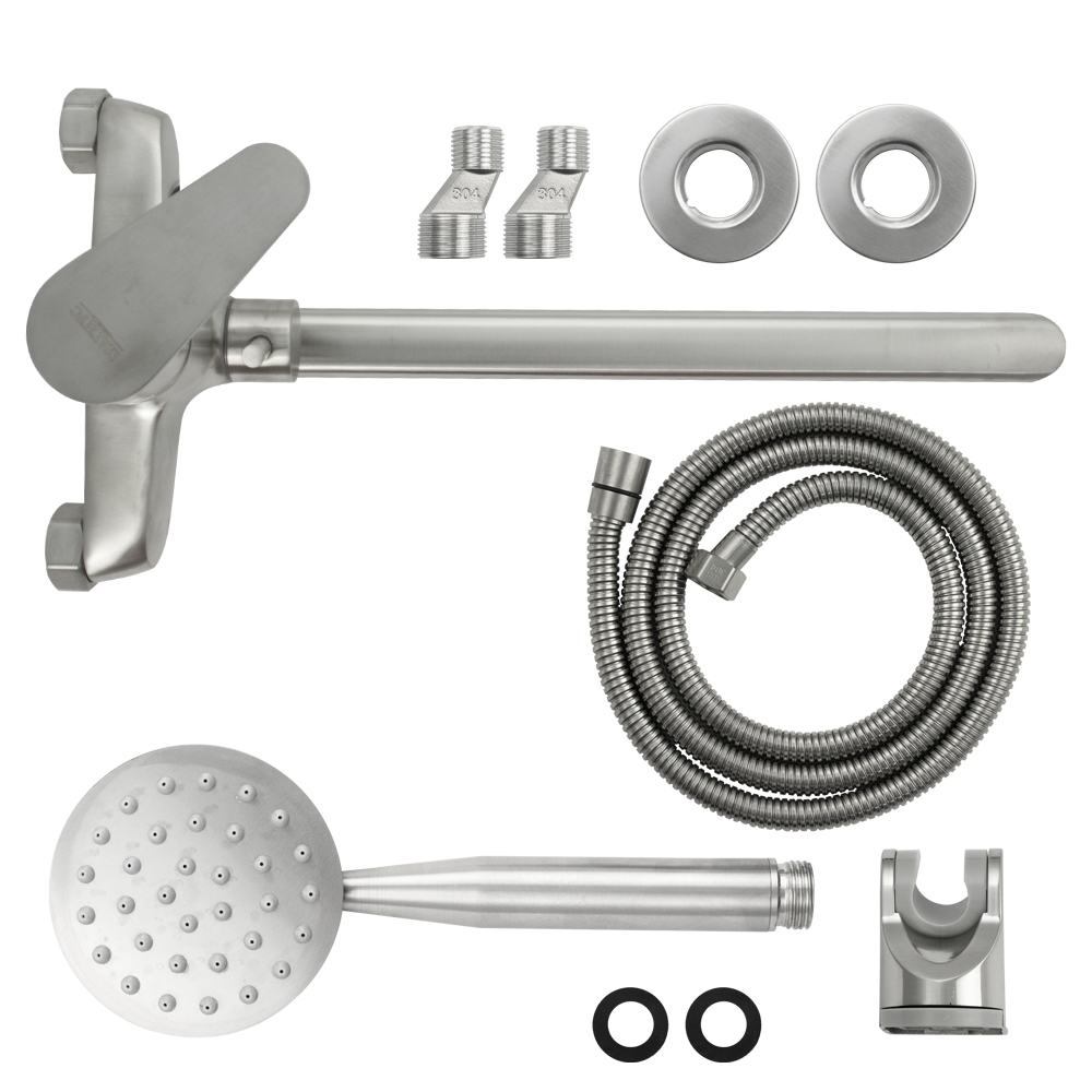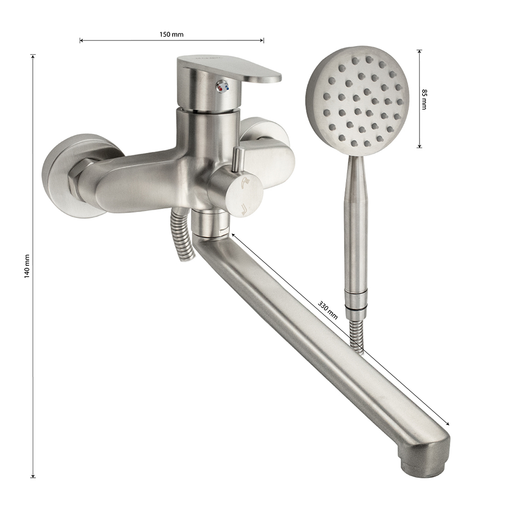 Смеситель матовый, из нержавеющей стали марки 304 в ванную / душевую комнату, с поворотным длинным плоским изливом. Картридж d = 40 мм, ручка литая. Дутый, большой корпус с дивертором м/к на корпусе, аэратор для экономии воды, чашки, гайки и эксцентрики из нержавеющей стали. Габаритные размеры: ширина 150 мм, высота 140 мм, длина излива 330 мм, диаметр чашки 60 мм, длина шланга 150 см, лейка d = 85 мм. Вес - 2,200 кг, объём - 0,00865 м3. В комплекте корпус с изливом, дивертор, кронштейн, паспорт, крепёж, прокладки, лейка, шланг.