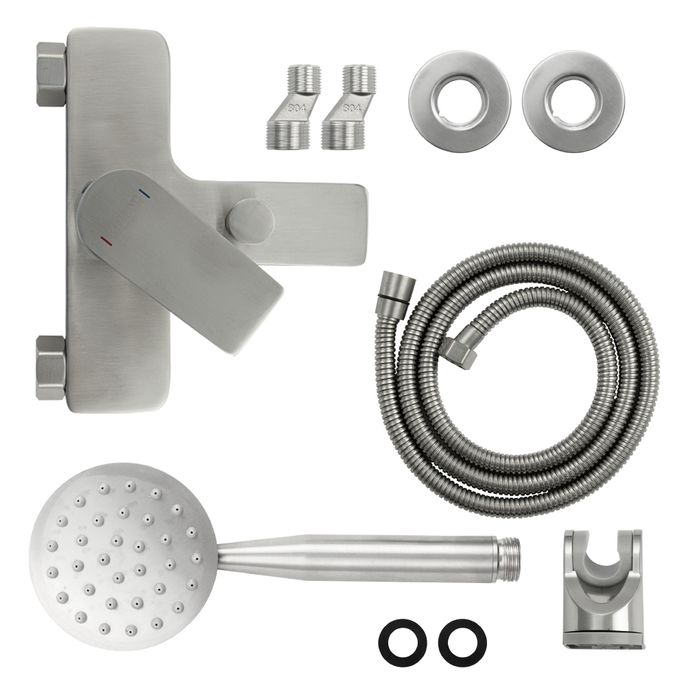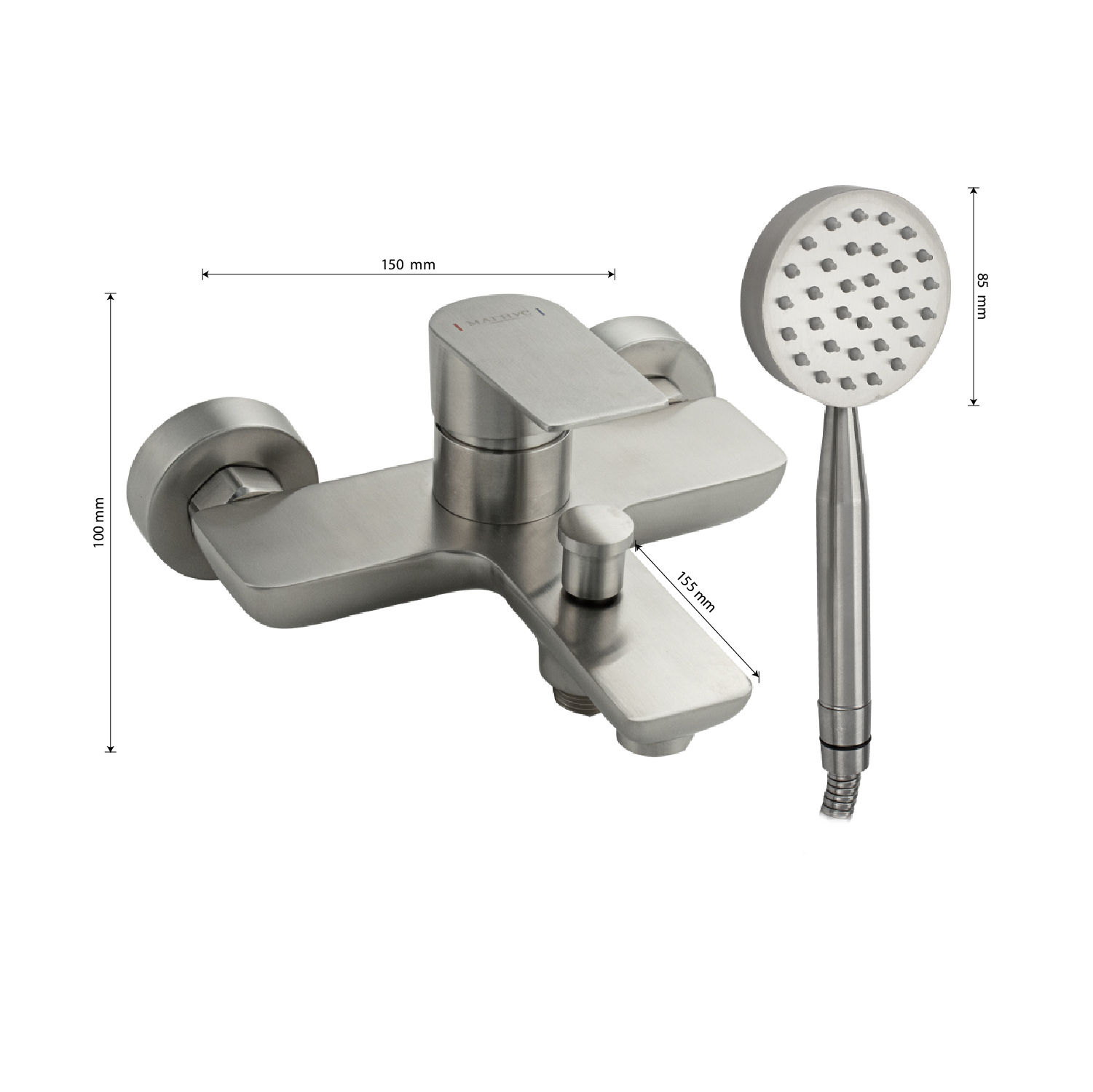 Смеситель матовый, из нержавеющей стали марки 304 в ванную / душевую комнату, с коротким литым изливом. Картридж d = 40 мм, ручка литая. Дутый, большой корпус с дивертором м/к на корпусе, аэратор для экономии воды, чашки, гайки и эксцентрики из нержавеющей стали. Габаритные размеры: ширина 150 мм, высота 100 мм, длина излива 155 мм, диаметр чашки 60 мм, длина шланга 150 см, лейка d = 85 мм. Вес - 2,200 кг, объём - 0,00800 м3. В комплекте корпус с изливом, дивертор, кронштейн, паспорт, крепёж, прокладки, лейка, шланг.