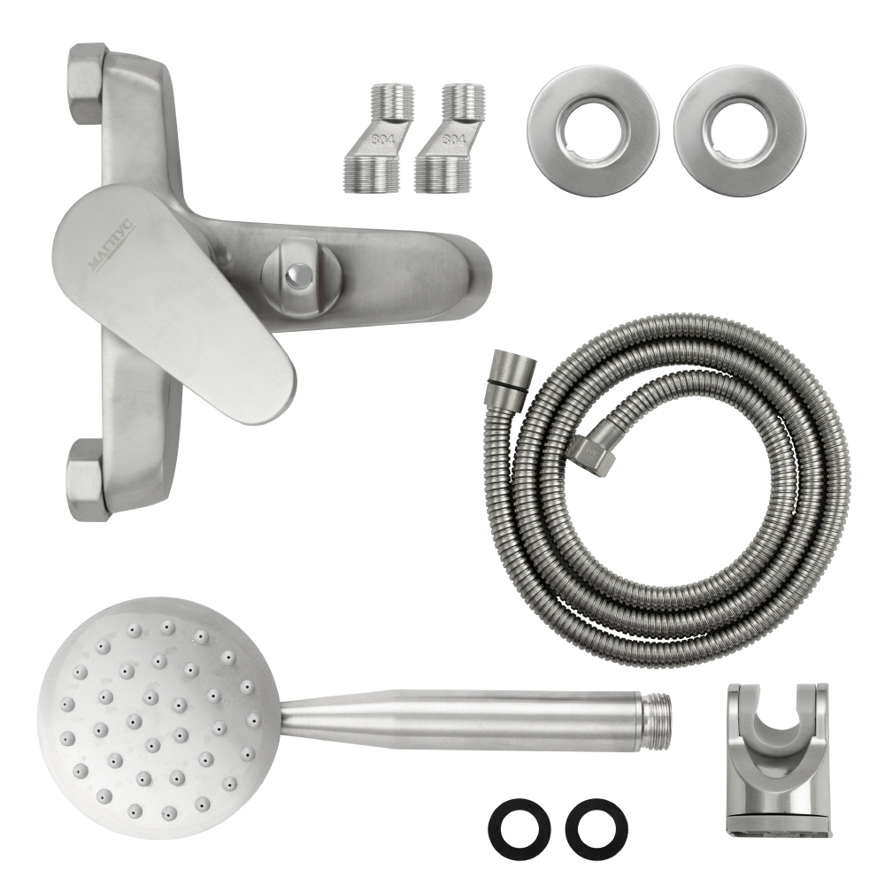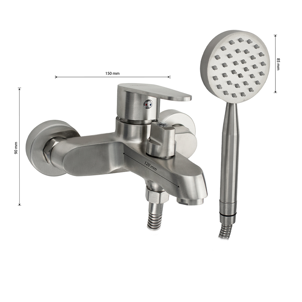 Смеситель матовый, из нержавеющей стали марки 304 в ванную / душевую комнату, с коротким литым изливом. Картридж d = 40 мм, ручка литая. Дутый, большой корпус с дивертором м/к на корпусе, аэратор для экономии воды, чашки, гайки и эксцентрики из нержавеющей стали. Габаритные размеры: ширина 150 мм, высота 90 мм, длина излива 120 мм, диаметр чашки 60 мм, длина шланга 150 см, лейка d = 85 мм. Вес - 2,000 кг, объём - 0,00800 м3. В комплекте корпус с изливом, дивертор, кронштейн, паспорт, крепёж, прокладки, лейка, шланг.