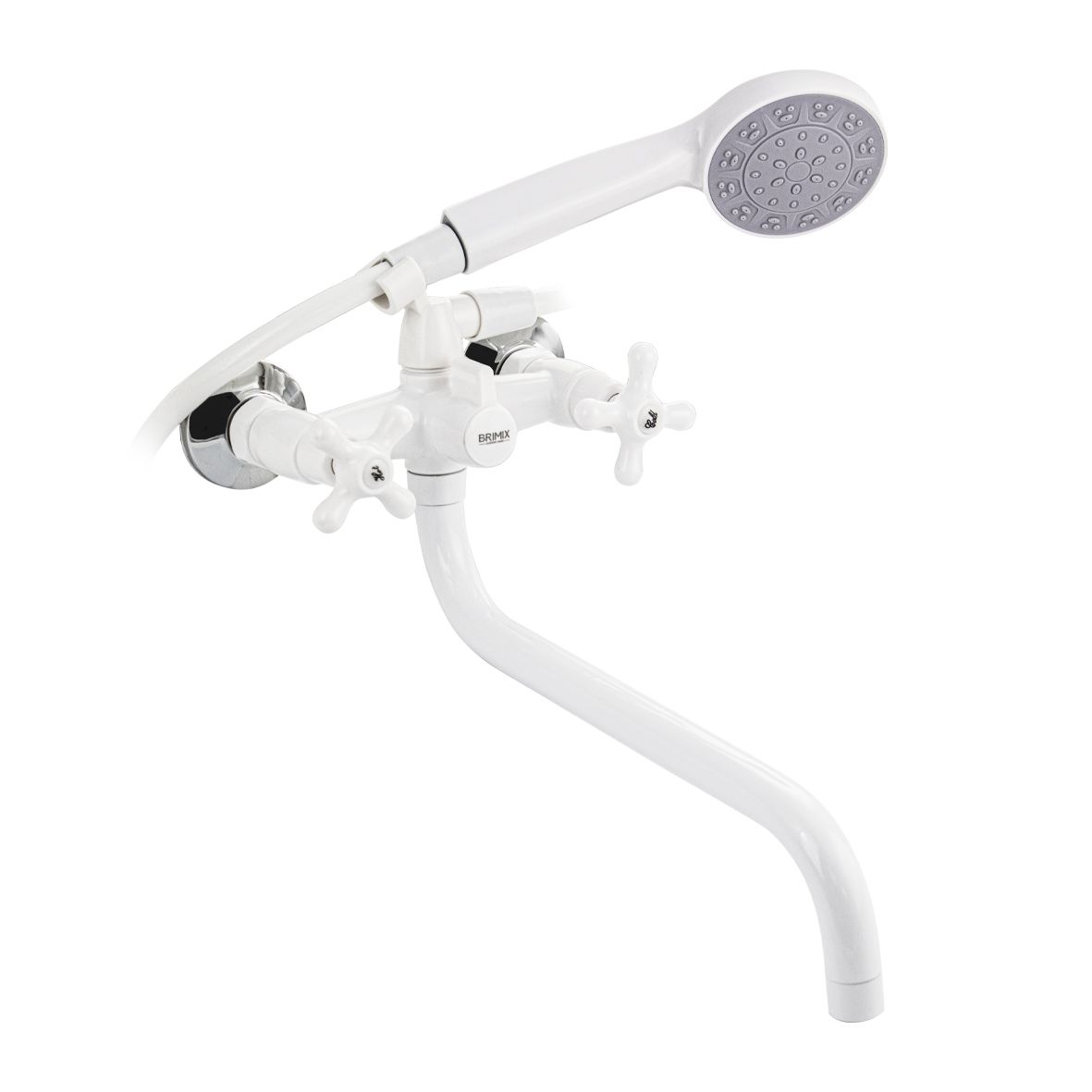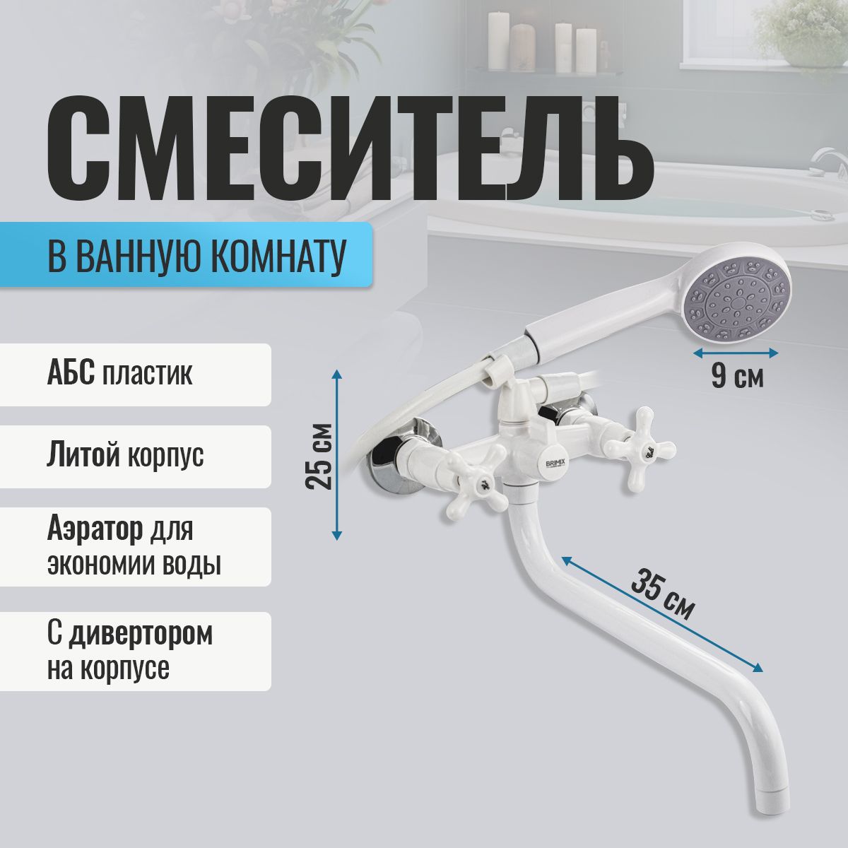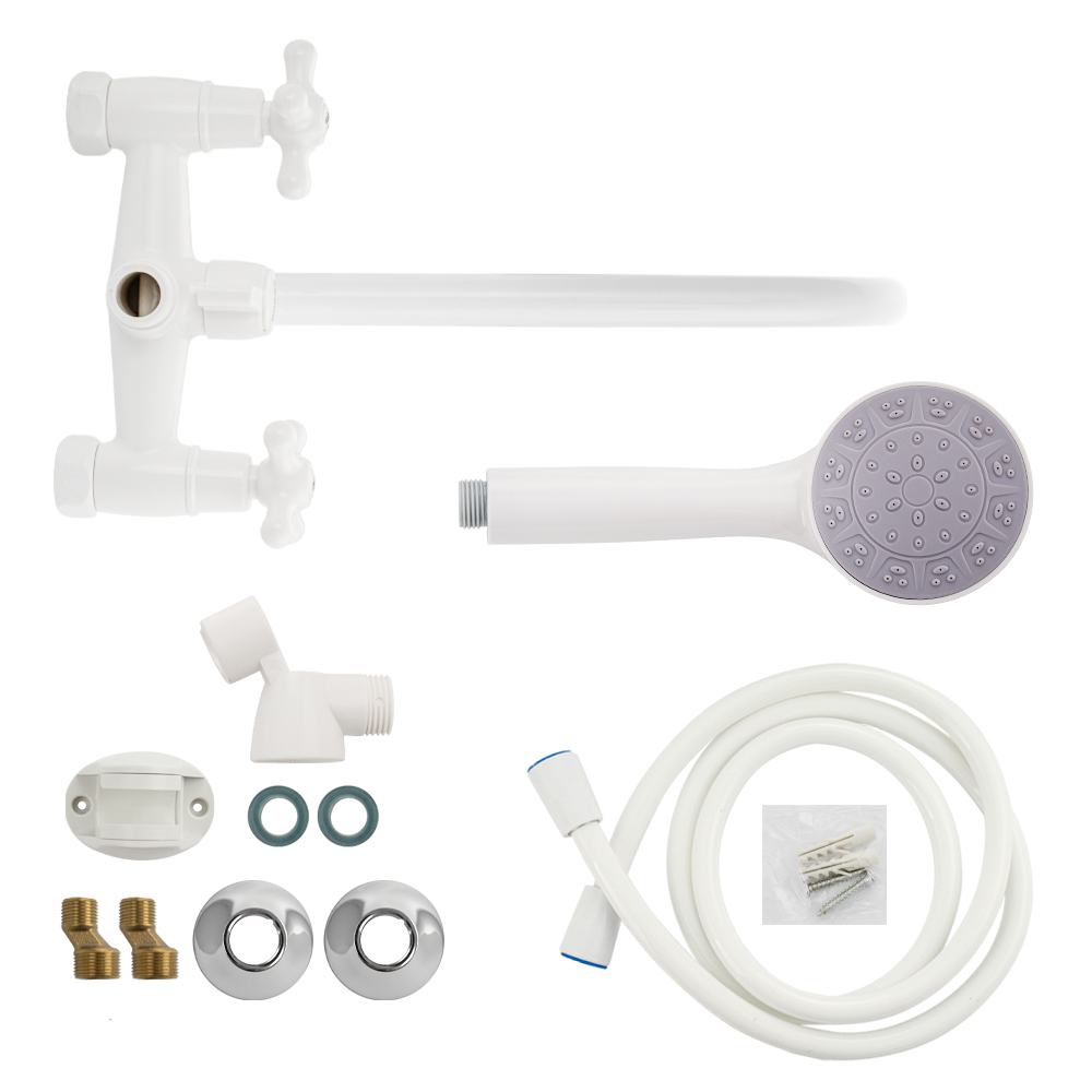 Смеситель из высокопрочного пластика АБС - белый, в ванную/душевую комнату, с длинным, круглым изливом, литой корпус, металлокерамика, с дивертором м/к на корпусе. Материал изготовления — пластик. Кранбуксы металлокерамика 1/2, ручки крест поворот на 90˚, аэратор для экономии воды, чашки и эксцентрики. Габаритные размеры: ширина 150 мм, высота корпуса 250 мм, длина излива 350 мм, душевая лейка d = 90 мм, шланг 150 см, диаметр чашки 65 мм. Вес - 1,12 кг, объём - 0,0045 м3. В комплекте паспорт, корпус с изливом, дивертор, душевая лейка, шланг, кронштейн, комплект крепежа и прокладок.