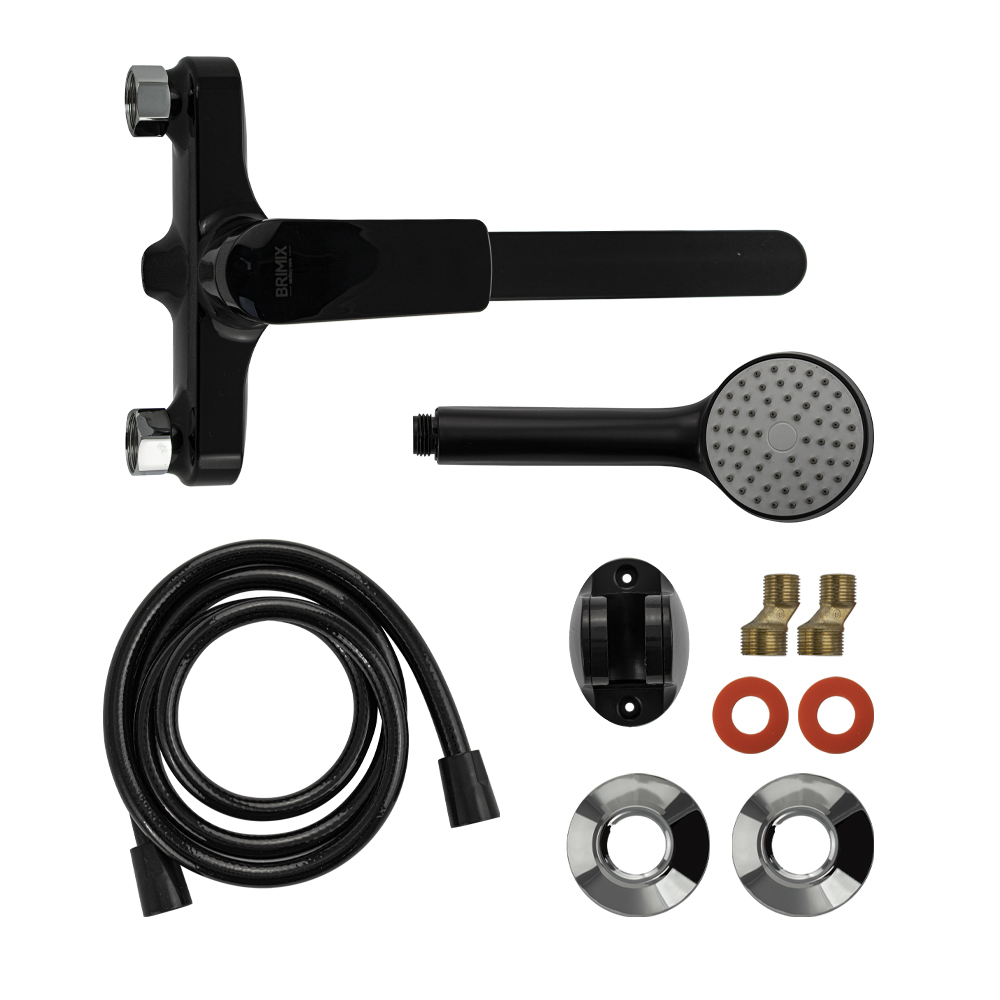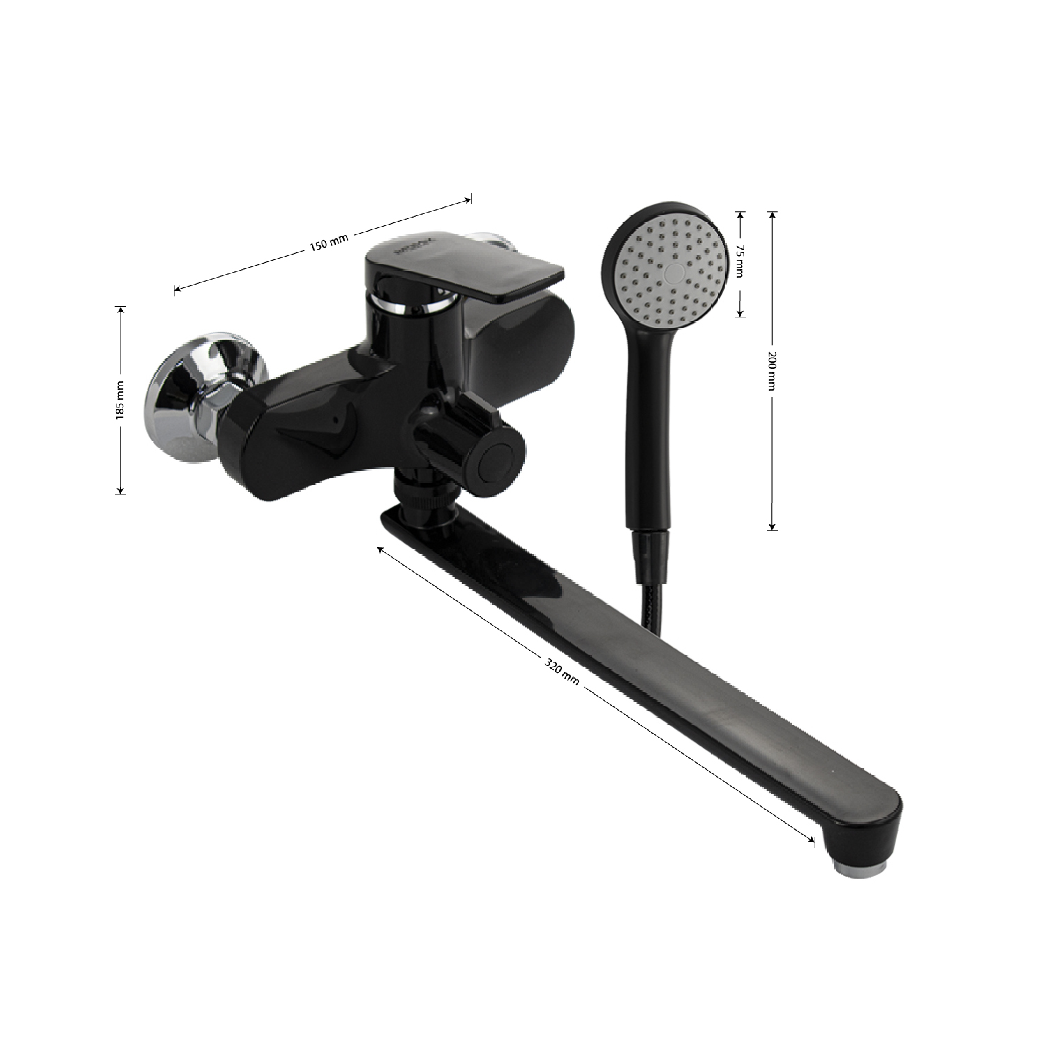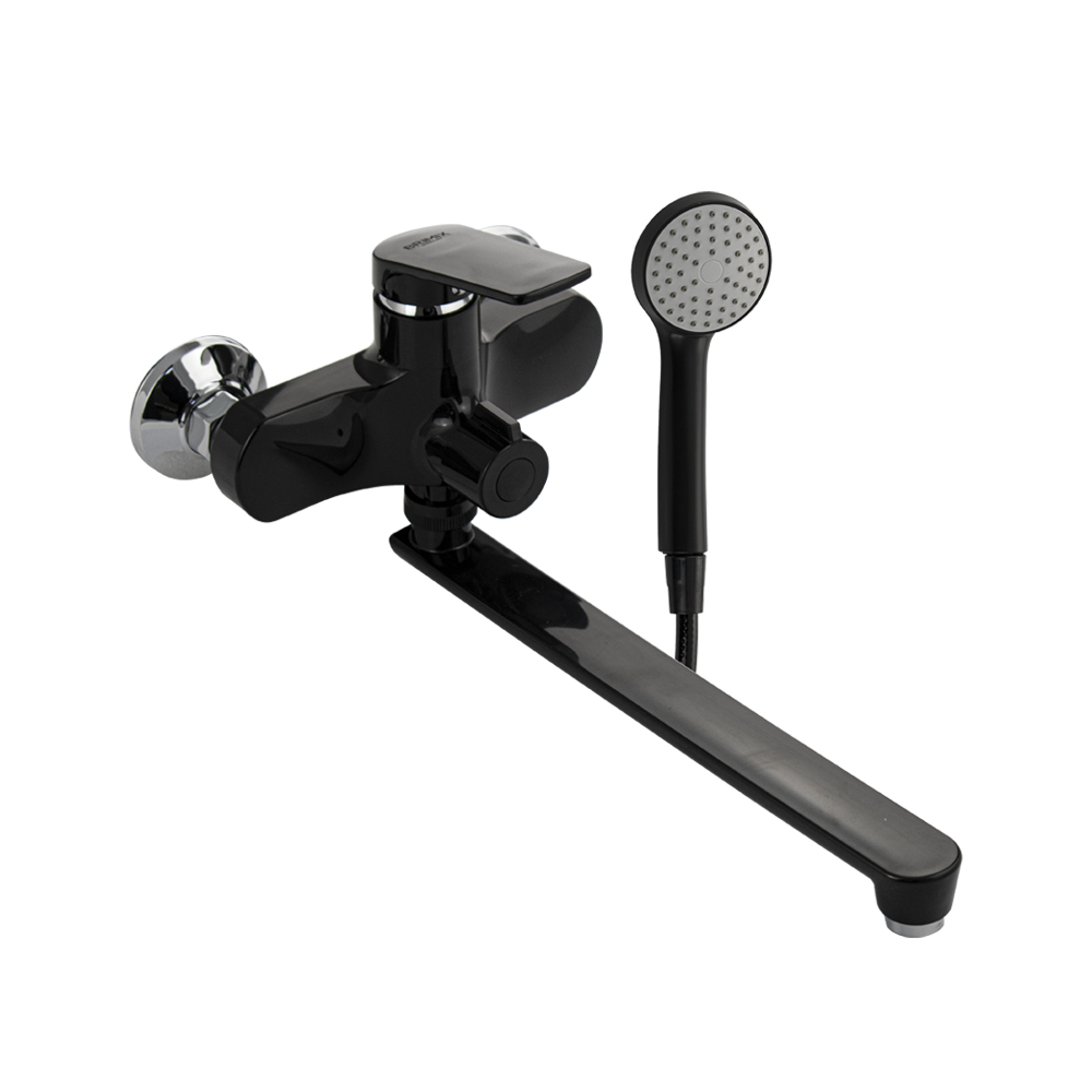 Смеситель из высокопрочного пластика АБС, черного цвета в ванную / душевую комнату с длинным, плоским изливом, литой корпус, шаровый с дивертором м/к на корпусе. Картридж d = мм, литая ручка, хромированный, аэратор для экономии воды, хромированные чашки и эксцентрики. Габаритные размеры: ширина 150 мм, высота корпуса 185 мм, длина излива 320 мм, душевая лейка d = 75 мм, шланг 150 см. Вес - 1.32 кг, объём - 0.0085 м3. В комплекте паспорт, корпус с изливом, дивертор, душевая лейка, шланг, кронштейн, комплект крепежа и прокладок.