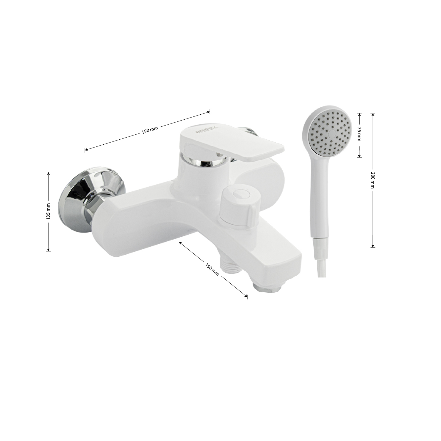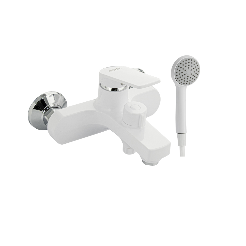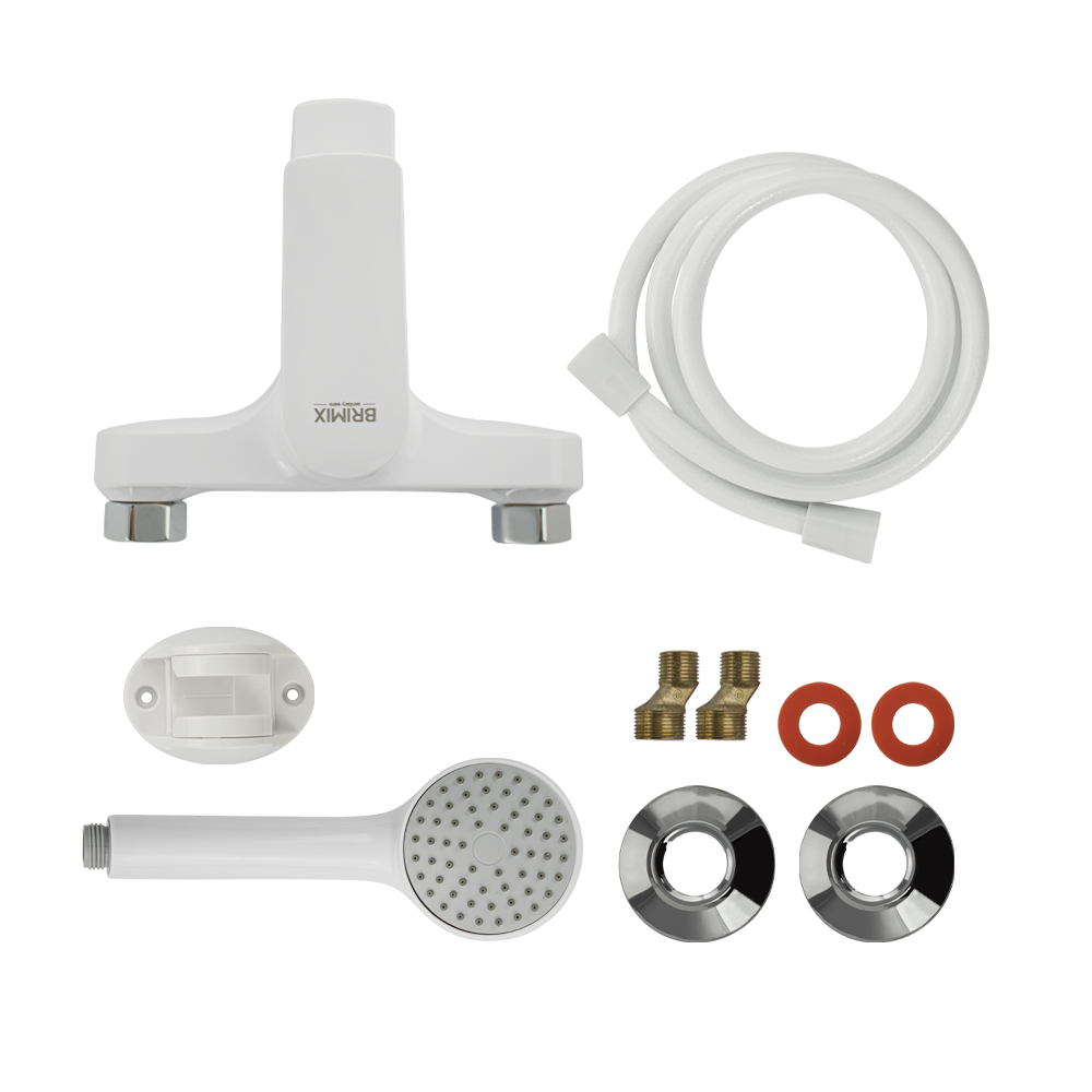 Смеситель из высокопрочного пластика АБС, БЕЛЫЙ в ванную / душевую комнату с коротким изливом, литой корпус, шаровый, с дивертором м/к на корпусе. Картридж d = мм, литая ручка, хромированный аэратор для экономии воды, хромированные чашки и эксцентрики. Габаритные размеры: ширина 150 мм, высота корпуса 135 мм, длина излива 150 мм, душевая лейка d = 75 мм, шланг 150 см. Вес - 1.27 кг, объём - 0.007 м3. В комплекте паспорт, корпус с изливом, дивертор, душевая лейка, шланг, кронштейн, комплект крепежа и прокладок.