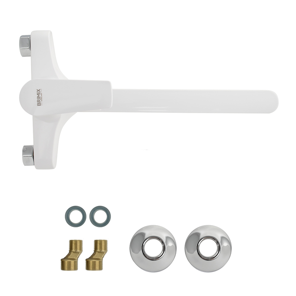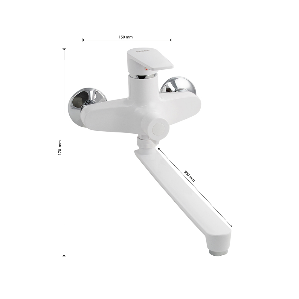 Смеситель из высокопрочного пластика АБС, БЕЛЫЙ в ванную / душевую комнату с длинным, плоским изливом, литой корпус, шаровый с дивертором м/к на корпусе. Картридж d = 40 мм, литая ручка, хромированный, аэратор для экономии воды, хромированные чашки и эксцентрики. Габаритные размеры: ширина 150 мм, высота корпуса 170 мм, длина излива 300 мм. Вес - 0,97 кг, объём - 0,00520 м3. В комплекте паспорт, корпус с изливом, комплект эксцентриков и прокладок.