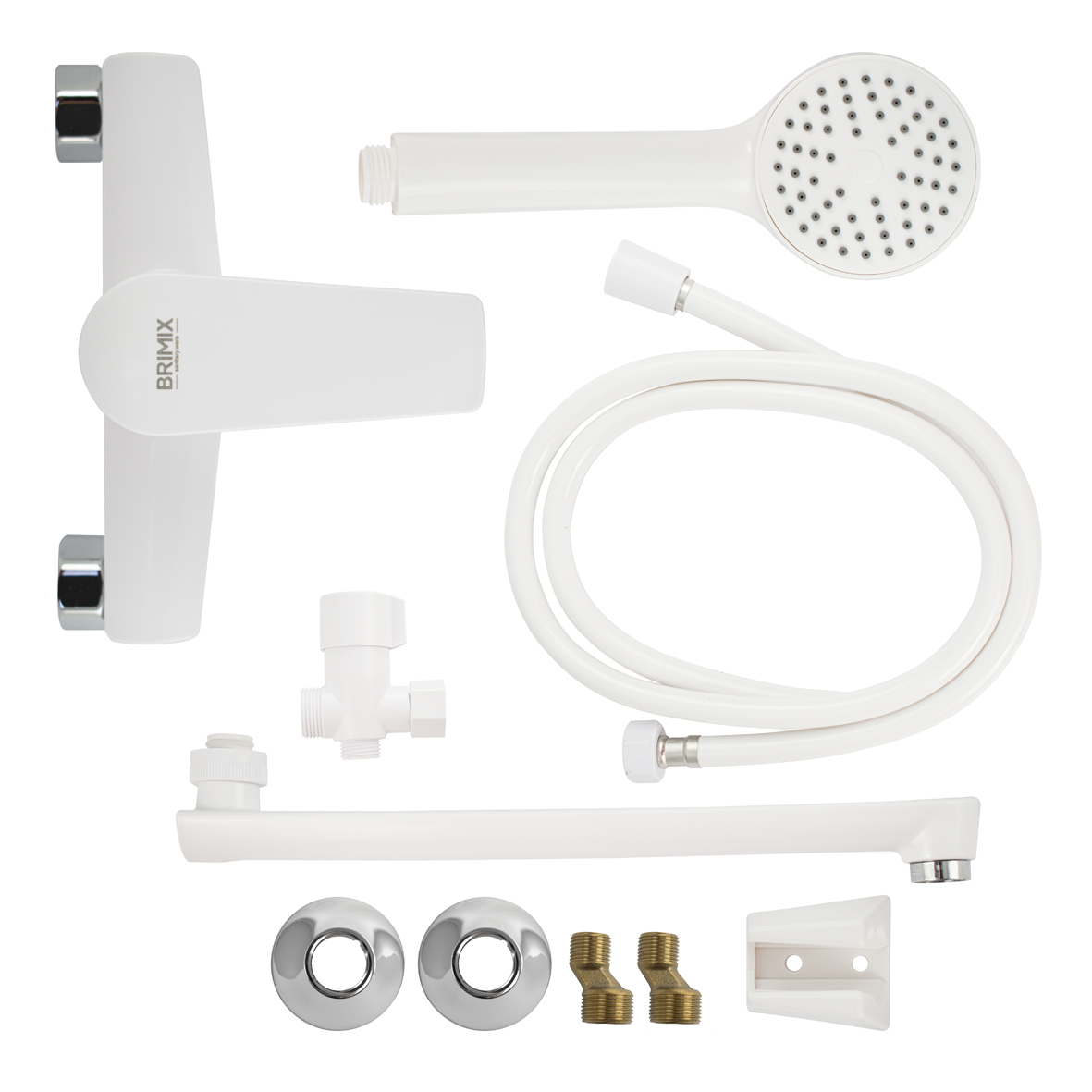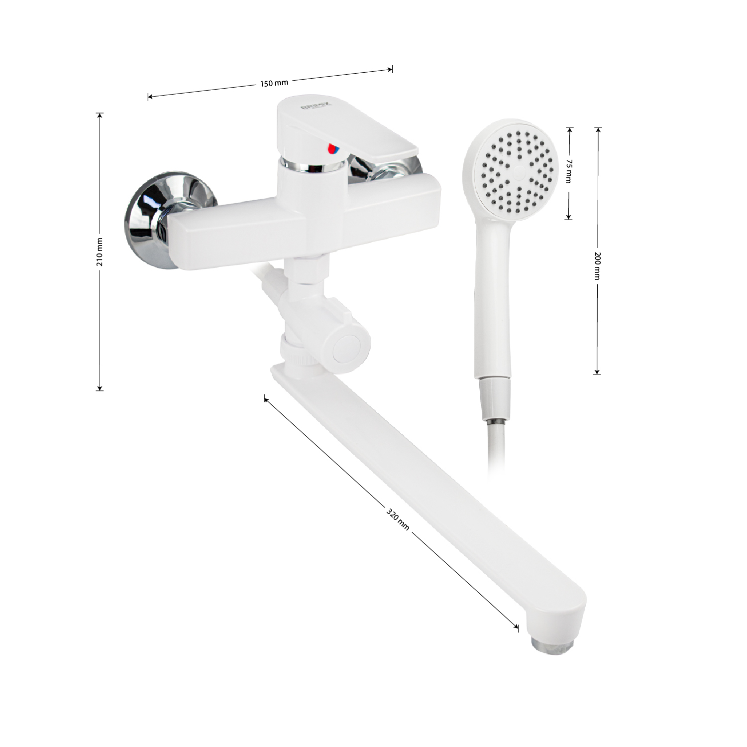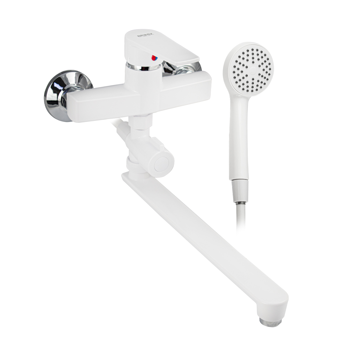 Смеситель из высокопрочного пластика АБС, БЕЛЫЙ в ванную / душевую комнату с длинным, плоским изливом, литой корпус, шаровый с дивертором м/к . Картридж d = 40 мм, литая ручка, хромированный, аэратор для экономии воды, хромированные чашки и эксцентрики. Габаритные размеры: ширина 150 мм, высота корпуса 210 мм, длина излива 320 мм, душевая лейка d = 80 мм, шланг 150 см. Вес - 1,300 кг, объём - 0 00700 м3. В комплекте паспорт, корпус с изливом, дивертор, душевая лейка, шланг, кронштейн, комплект крепежа и прокладок.