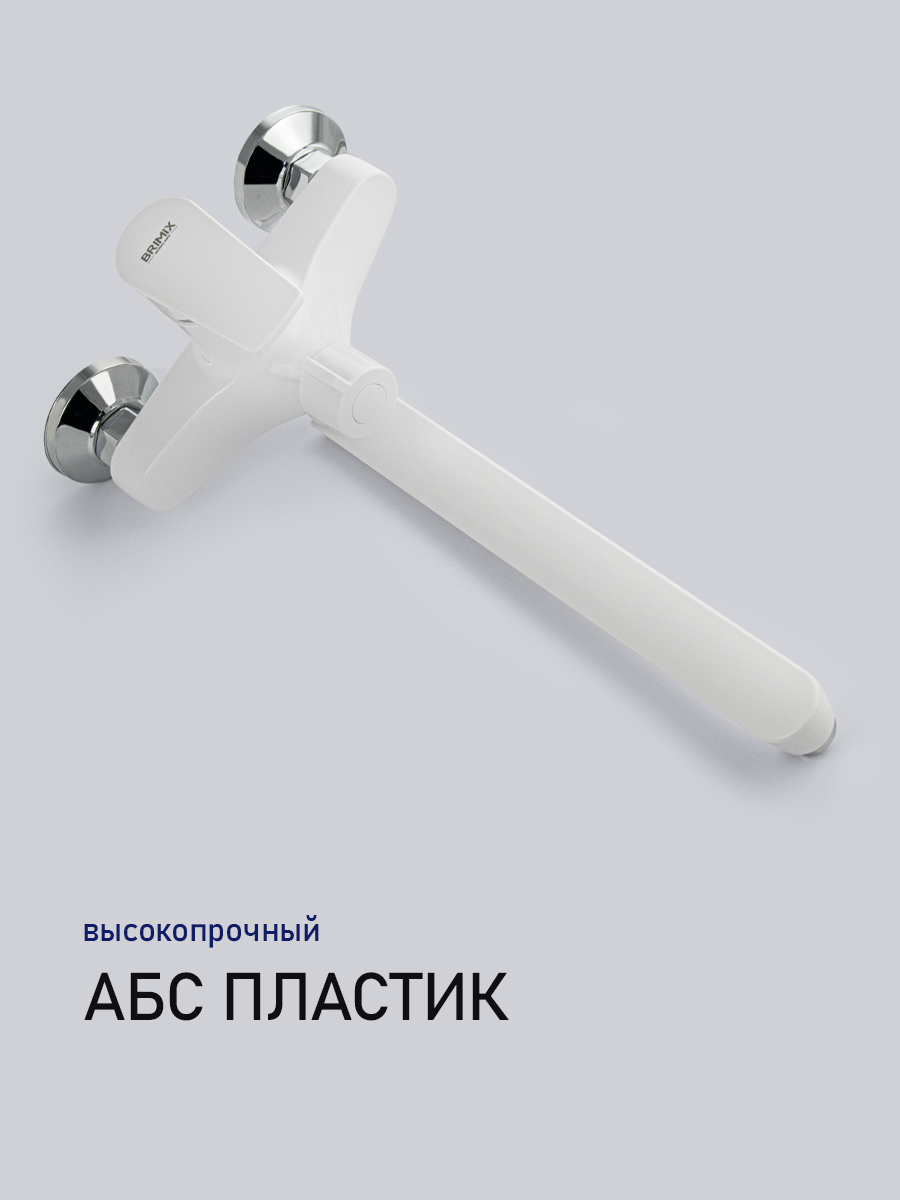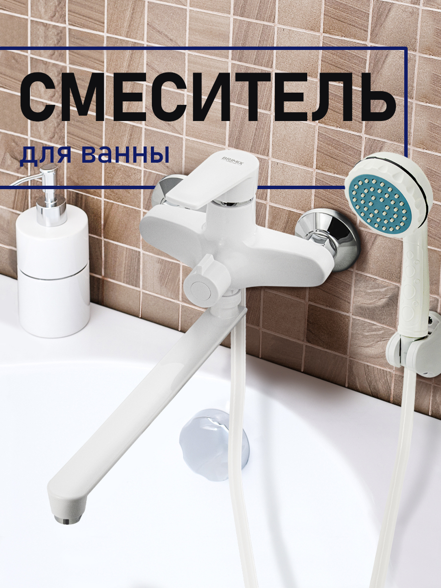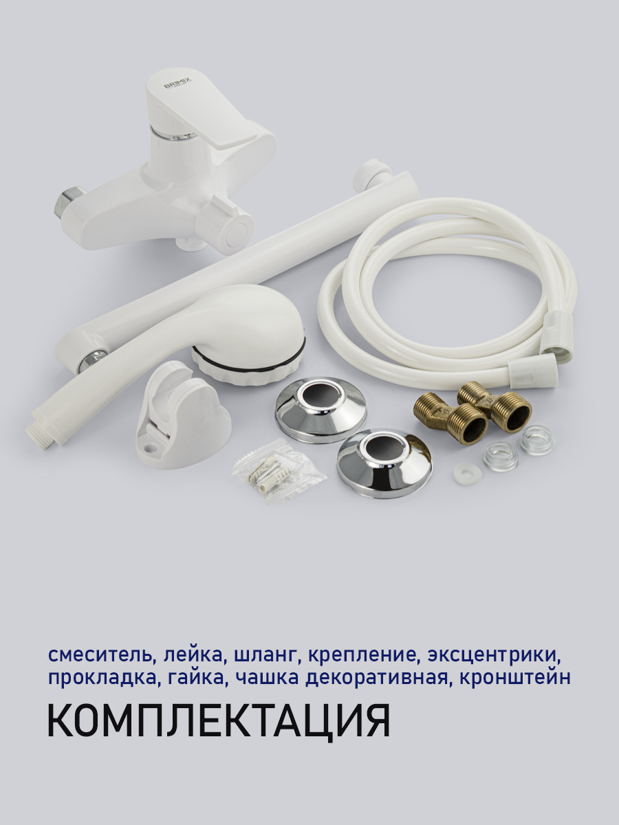 Смеситель из высокопрочного пластика АБС, БЕЛЫЙ в ванную / душевую комнату с длинным, плоским изливом, литой корпус, шаровый с дивертором м/к на корпусе. Картридж d = 40 мм, литая ручка, хромированный, аэратор для экономии воды, хромированные чашки и эксцентрики. Габаритные размеры: ширина 150 мм, высота корпуса 170 мм, длина излива 300 мм, душевая лейка d = 80 мм, шланг 150 см. Вес - 1 350 кг, объём - 0 00700 м3. В комплекте паспорт, корпус с изливом, дивертор, душевая лейка, шланг, кронштейн, комплект крепежа и прокладок.