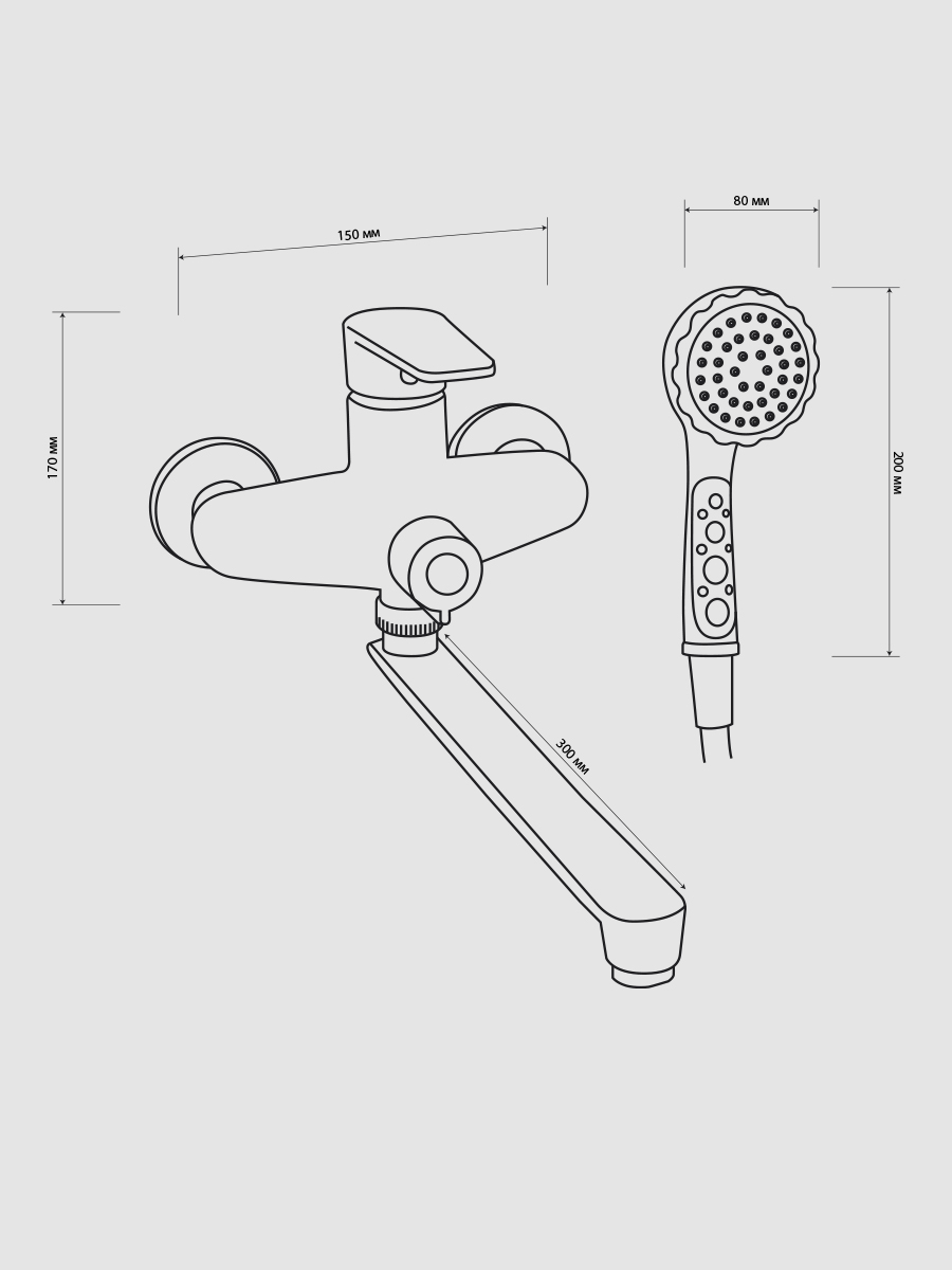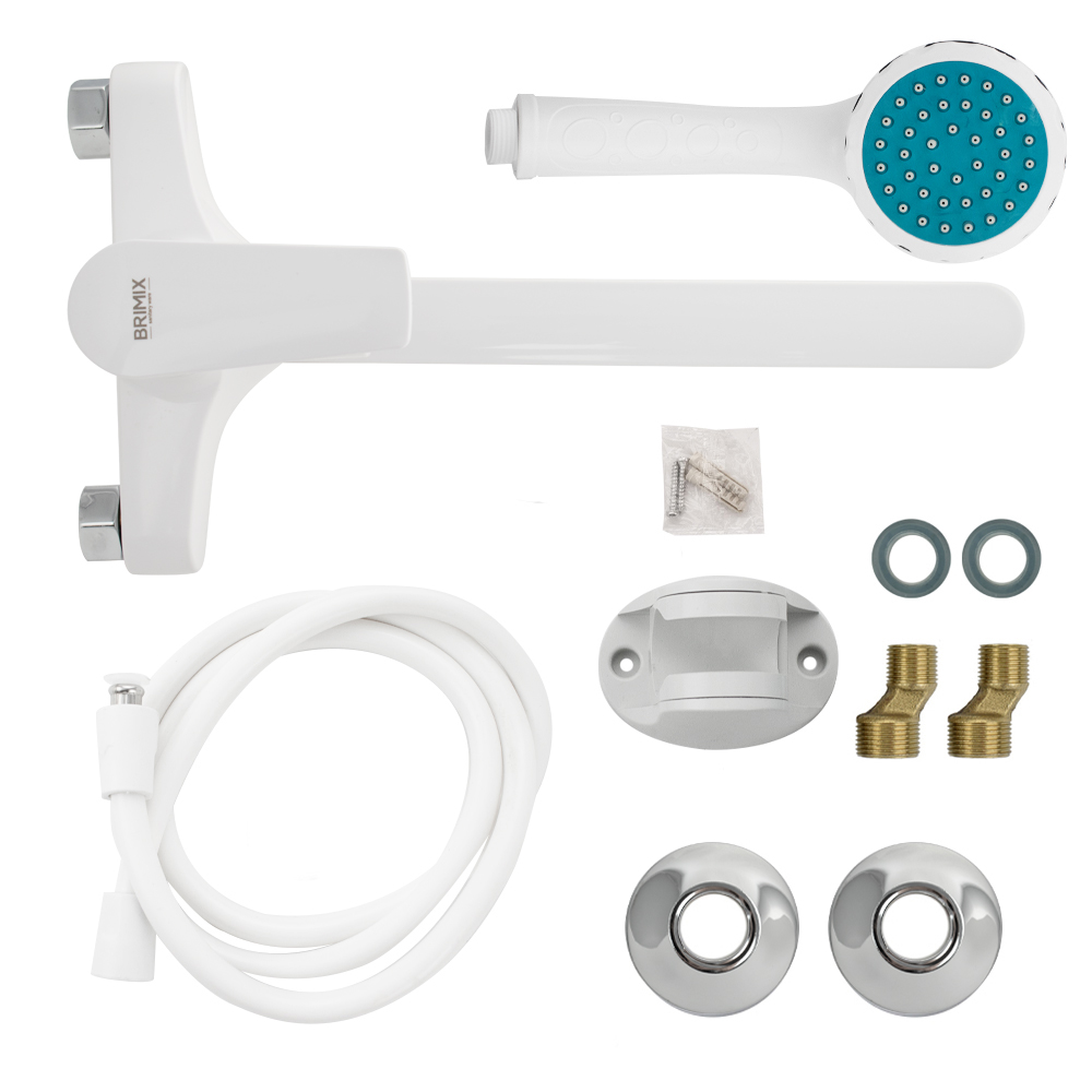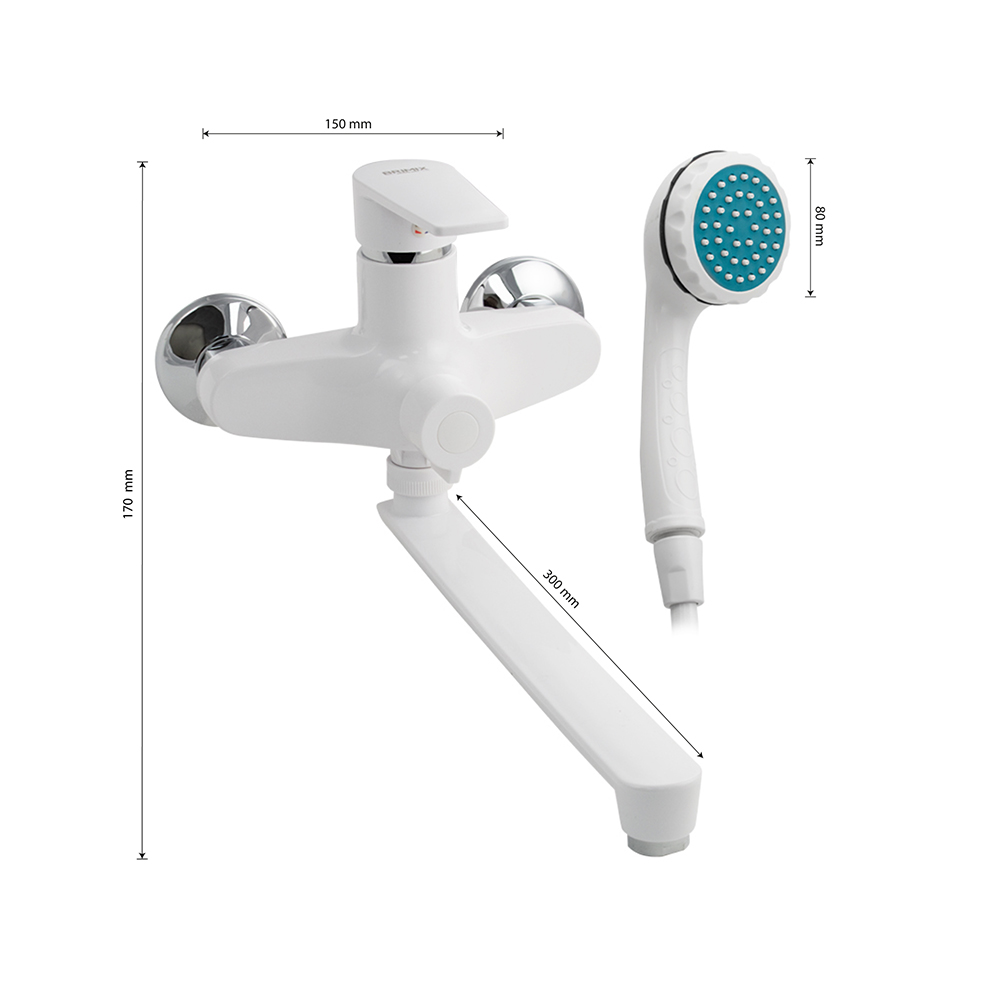 Смеситель из высокопрочного пластика АБС, БЕЛЫЙ в ванную / душевую комнату с длинным, плоским изливом, литой корпус, шаровый с дивертором м/к на корпусе. Картридж d = 40 мм, литая ручка, хромированный, аэратор для экономии воды, хромированные чашки и эксцентрики. Габаритные размеры: ширина 150 мм, высота корпуса 170 мм, длина излива 300 мм, душевая лейка d = 80 мм, шланг 150 см. Вес - 1 350 кг, объём - 0 00700 м3. В комплекте паспорт, корпус с изливом, дивертор, душевая лейка, шланг, кронштейн, комплект крепежа и прокладок.
