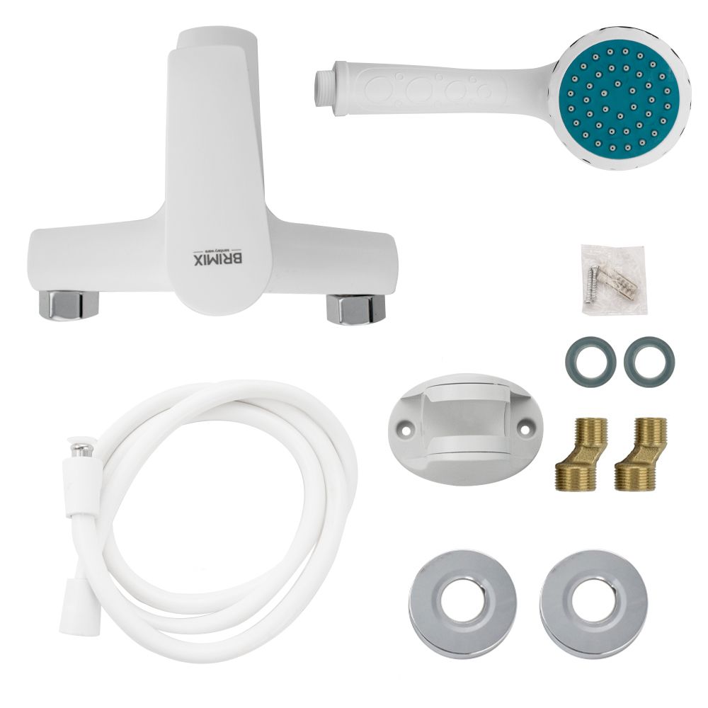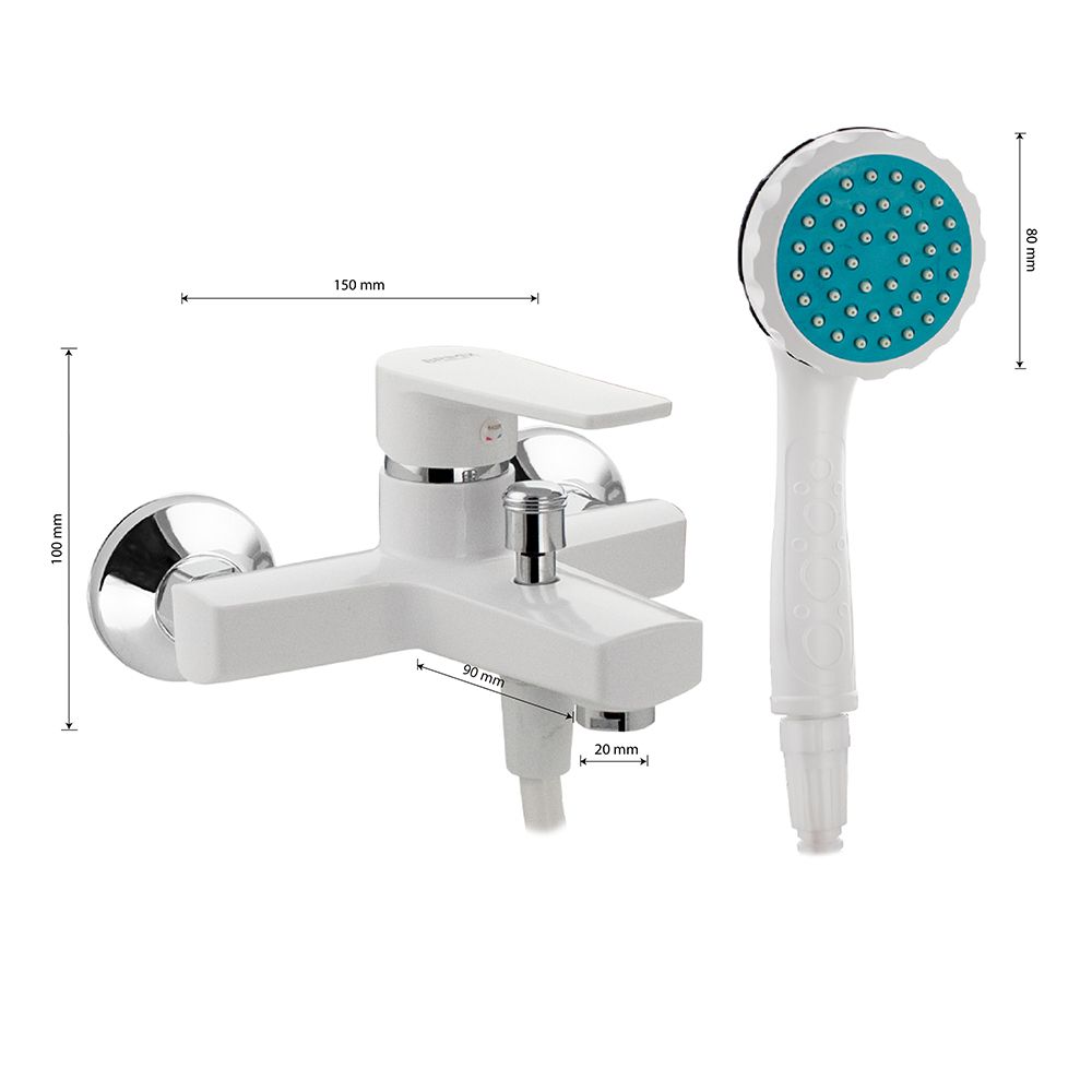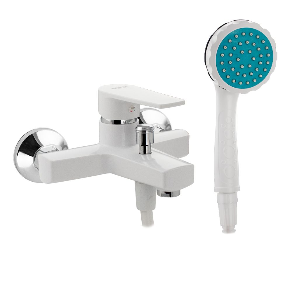 Смеситель из высокопрочного пластика АБС, БЕЛЫЙ в ванную / душевую комнату с коротким изливом, литой корпус, шаровый, с дивертором м/к на корпусе. Картридж d = 40 мм, литая ручка, хромированный аэратор для экономии воды, хромированные чашки и эксцентрики. Габаритные размеры: ширина 150 мм, высота корпуса 100 мм, длина излива 90 мм, душевая лейка d = 80 мм, шланг 150 см. Вес - 1,200 кг, объём - 0,00500 м3. В комплекте паспорт, корпус с изливом, дивертор, душевая лейка, шланг, кронштейн, комплект крепежа и прокладок.