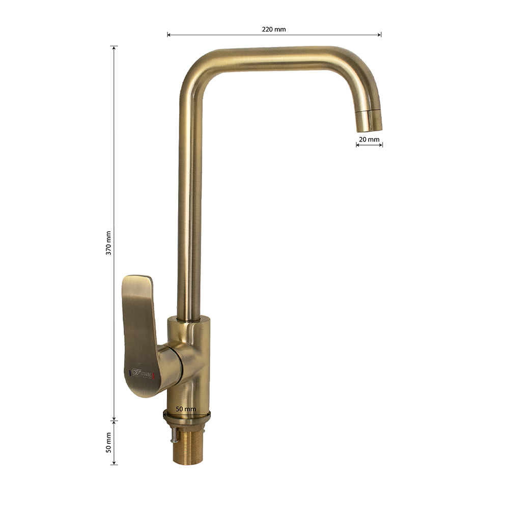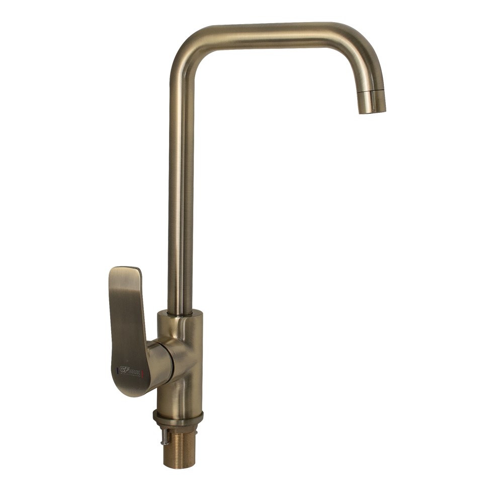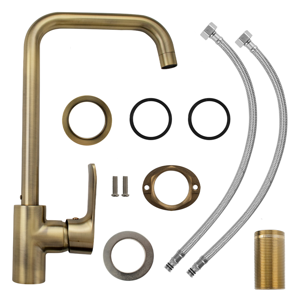 Смеситель для кухонной мойки и раковин, латунный корпус под цвет состаренной БРОНЗЫ, боковой, с высоким Г-образным изливом, шаровый. Крепление резьба - гайка, картридж d = 35 мм, литая ручка. Аэратор для экономии воды. Габаритные размеры: высота 370 мм, длина 220 мм, диаметр посадочного седла 50 мм, длина резьбы 50 мм, длина подводки 500 мм. Вес - 1,800 кг, объём - 0,00520 м3. В комплекте паспорт, корпус с изливом, подводка 1/2, крепеж, набор прокладок.