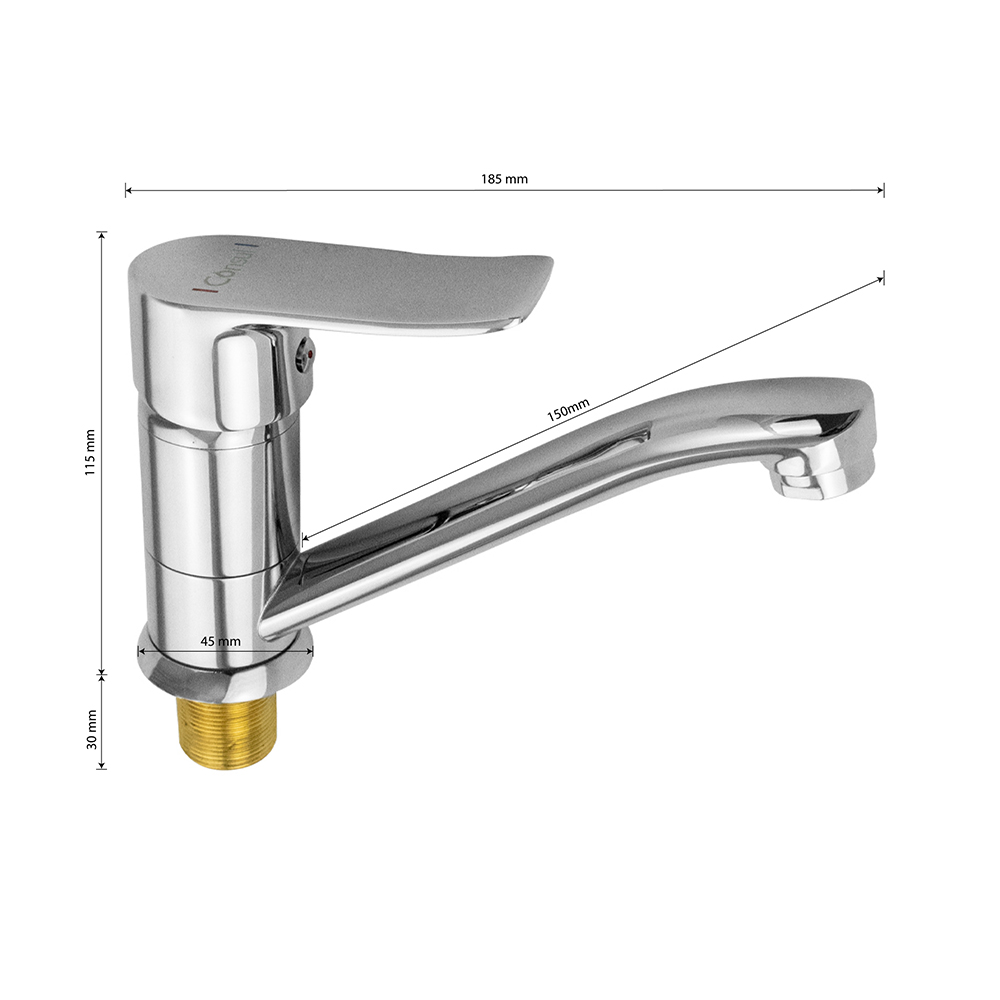 Смеситель для кухонной мойки и раковины, хромированный, с коротким, поворотным изливом, шаровый, литая ручка. Материал изготовления — ЦАМ (цинк-алюминий-медь). Крепление резьба - гайка, картридж d = 35 мм. Аэратор для экономии воды. Габаритные размеры: высота 115 мм, длина 185 мм, длина излива 150 мм, диаметр посадочного седла 45 мм, длина резьбы 30 мм, длина подводки 400 мм. Вес - 1,000 кг, объём - 0,00350 м3. В комплекте паспорт, корпус, подводка 1/2, крепеж, набор прокладок.
