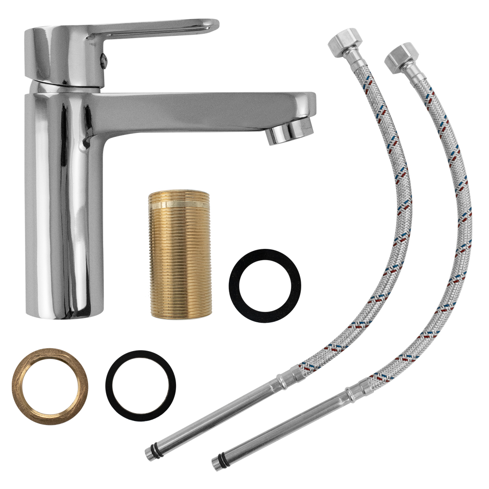 Смеситель для раковины, хромированный, с коротким изливом, литой корпус, ручка с прорезью, шаровый. Материал изготовления — ЦАМ (цинк-алюминий-медь) + нержавеющая сталь. Крепление резьба - гайка, картридж d = 35 мм. Аэратор для экономии воды. Габаритные размеры: высота 155 мм, длина 155 мм, длина излива 115 мм, диаметр посадочного седла 50 мм, длина резьбы 50 мм, длина подводки 400 мм. Вес - 1,000 кг, объём - 0,00295 м3. В комплекте паспорт, корпус, подводка 1/2, крепеж, набор прокладок. Габаритные размеры коробки: ширина 200 мм, высота 80 мм, глубина 150 мм.