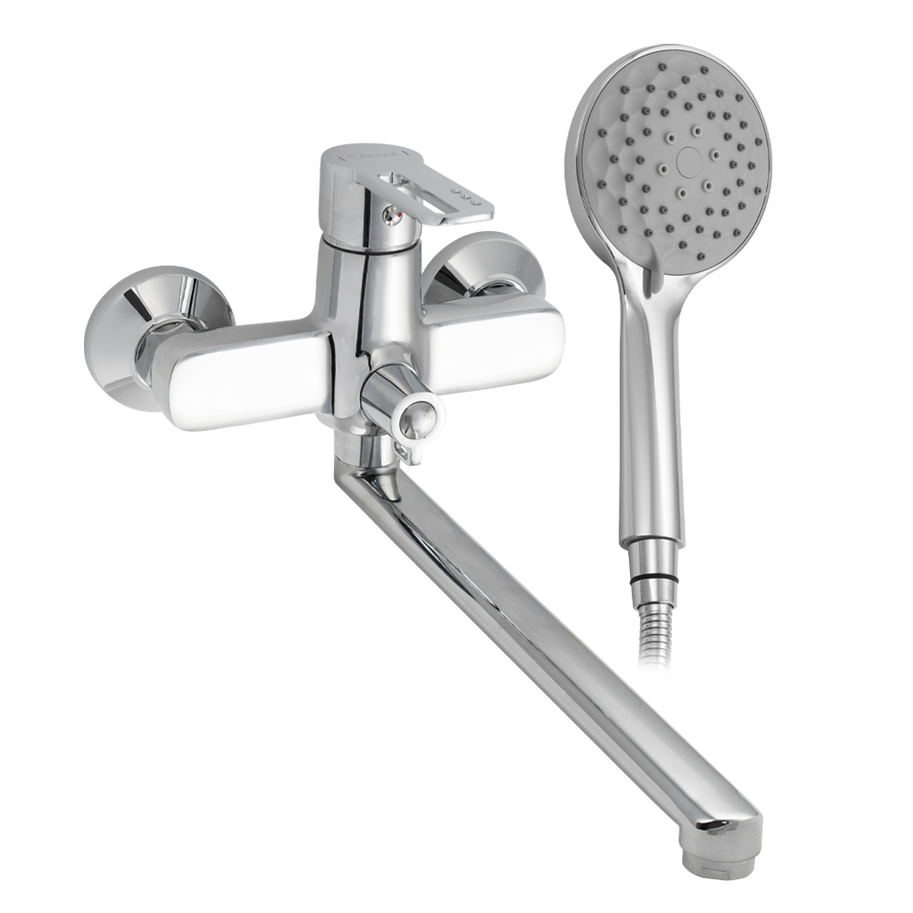 Смеситель хромированный в ванную / душевую комнату с длинным, плоским изливом, тяжёлый, массивный корпус, шаровый с дивертором м/к на корпусе. Материал изготовления — ЦАМ (цинк-алюминий-медь) + нержавеющая сталь. Картридж d = 35 мм, ручка с прорезью, аэратор для экономии воды, чашки и эксцентрики из нержавеющей стали. Габаритные размеры: ширина 150 мм, высота корпуса 140 мм, длина излива 330 мм, двухрежимная душевая лейка d = 105 мм, шланг 150 см. Вес - 1,900 кг, объём - 0,00740 м3. В комплекте паспорт, корпус с изливом, дивертор, душевая лейка, шланг, кронштейн, комплект крепежа и прокладок. Габаритные размеры коробки: ширина 395 мм, высота 105 мм, глубина 170 мм.