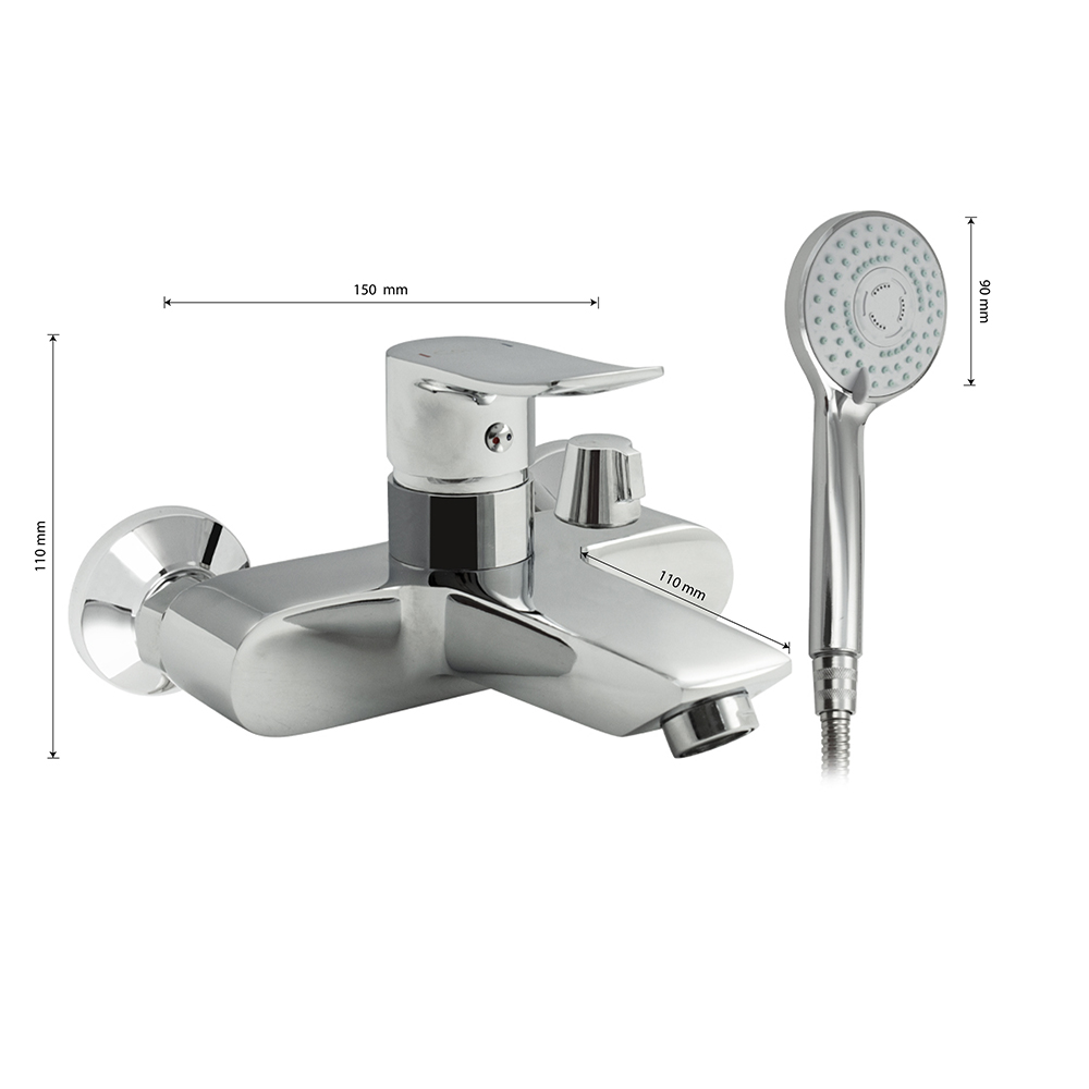 Смеситель в ванную / душевую комнату, хромированный, с коротким изливом, литой корпус, шаровый, с поворотным дивертором м/к на корпусе. Материал изготовления — ЦАМ (цинк-алюминий-медь). Картридж d = 35 мм, литая ручка, аэратор для экономии воды, чашки и эксцентрики из нержавеющей стали. Габаритные размеры: ширина 150 мм, высота корпуса 110 мм, длина излива 110 мм, круглая трёхрежимная душевая лейка d = 90 мм, шланг 150 см. Вес - 2,100 кг, объём - 0,00630 м3. В комплекте паспорт, корпус с изливом, дивертор, душевая лейка, шланг, кронштейн, комплект крепежа и прокладок.