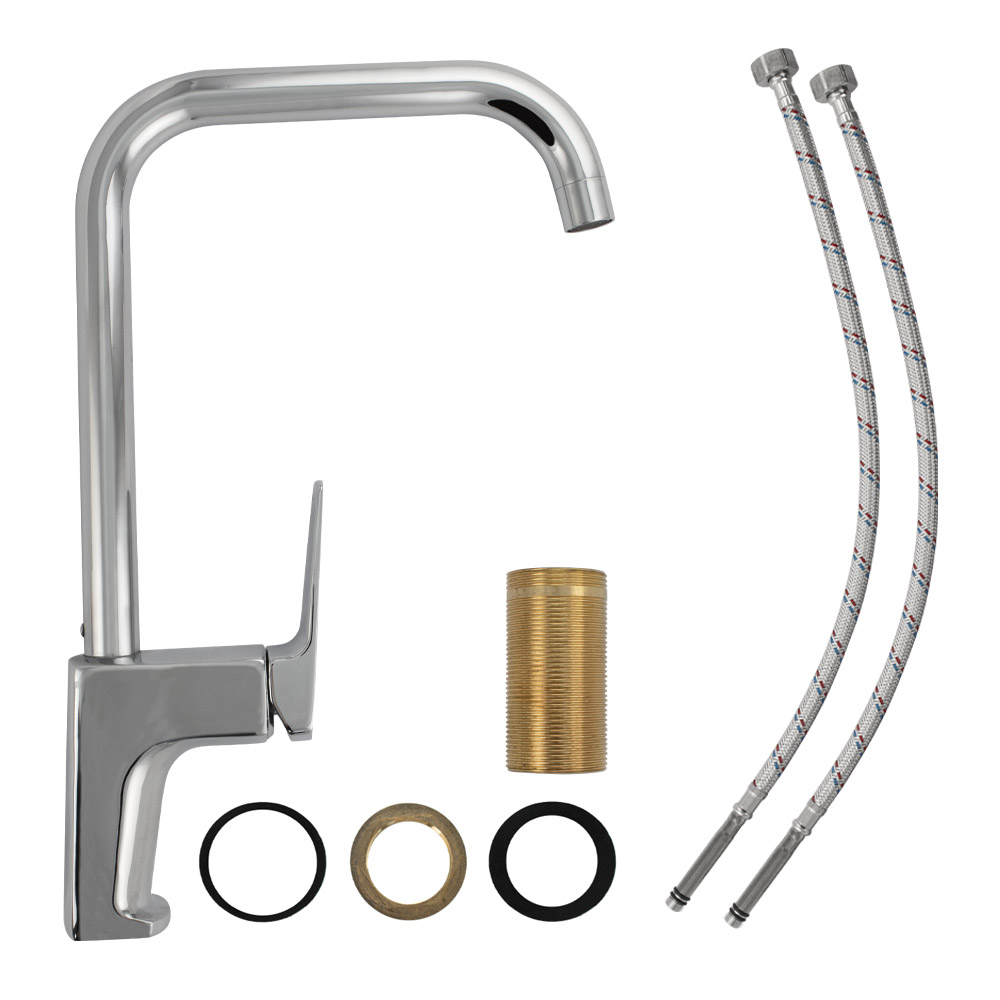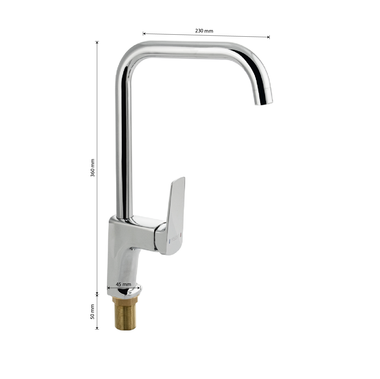 Смеситель для кухонной мойки и раковин, латунный квадратный корпус, хромированный, боковой, с высоким С-образным изливом, шаровый. Крепление резьба - гайка, картридж d = 40 мм, литая ручка. Аэратор для экономии воды. Габаритные размеры: высота 360 мм, длина 230 мм, размер посадочного седла 45 мм, длина резьбы 50 мм, длина подводки 500 мм. Вес - 1,400 кг, объём - 0,00800 м3. В комплекте паспорт, корпус с изливом, подводка 1/2, крепеж, набор прокладок.
