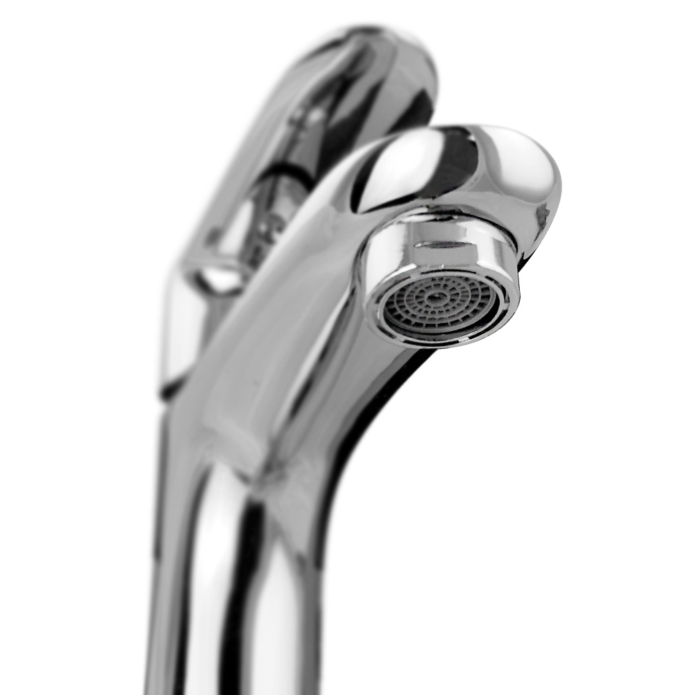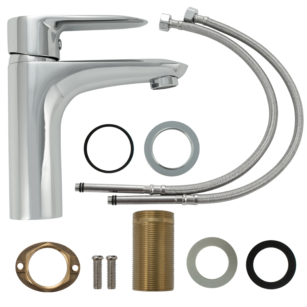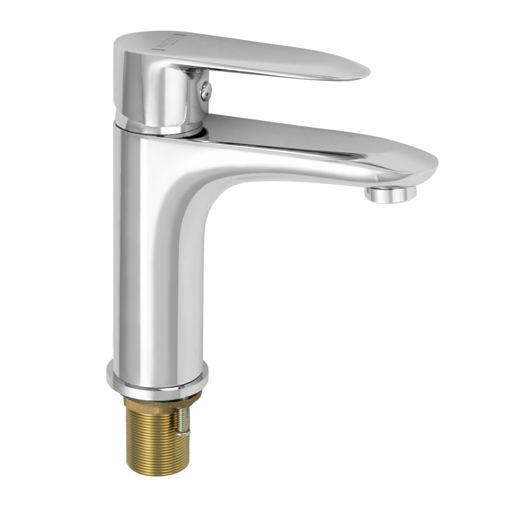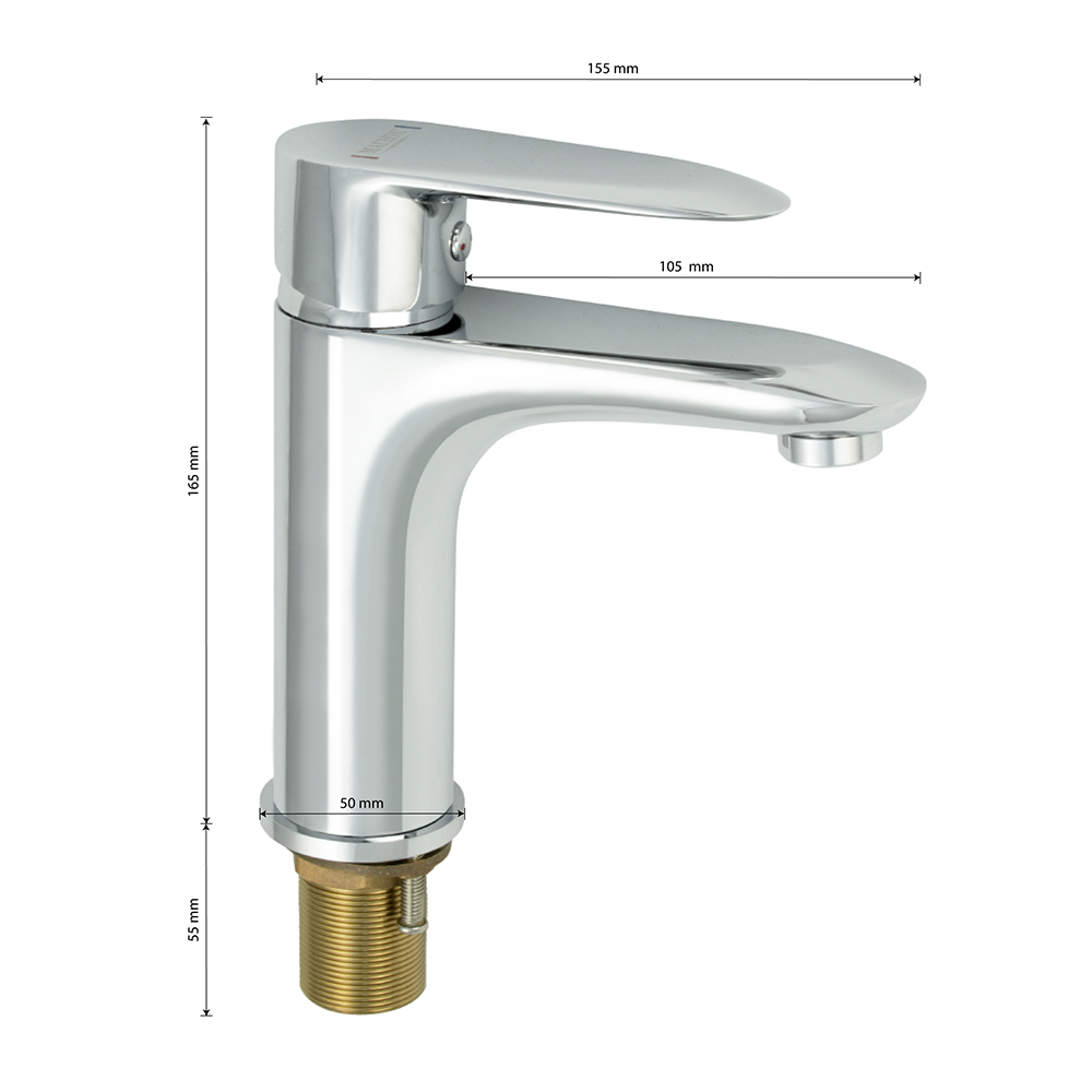 Смеситель для раковины, латунный корпус, хромированный, с коротким изливом, литой корпус, литая ручка, шаровый. Крепление резьба - гайка, картридж d = 35 мм. Аэратор для экономии воды. Габаритные размеры: высота 165 мм, длина 155 мм, длина излива 105 мм, диаметр посадочного седла 50 мм, длина резьбы 55 мм, длина подводки 500 мм. Вес - 1,300 кг, объём - 0,00278 м3. В комплекте паспорт, корпус, подводка 1/2, крепеж, набор прокладок.