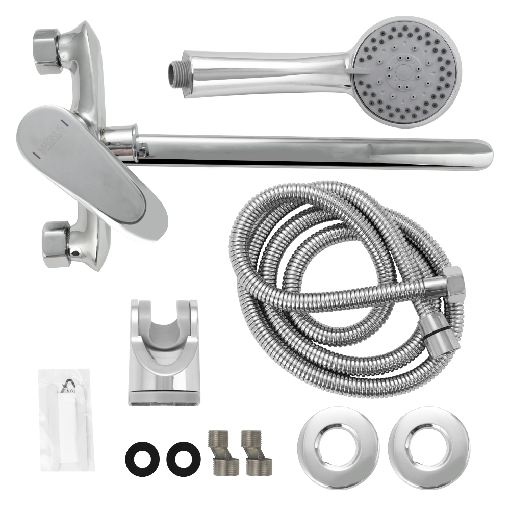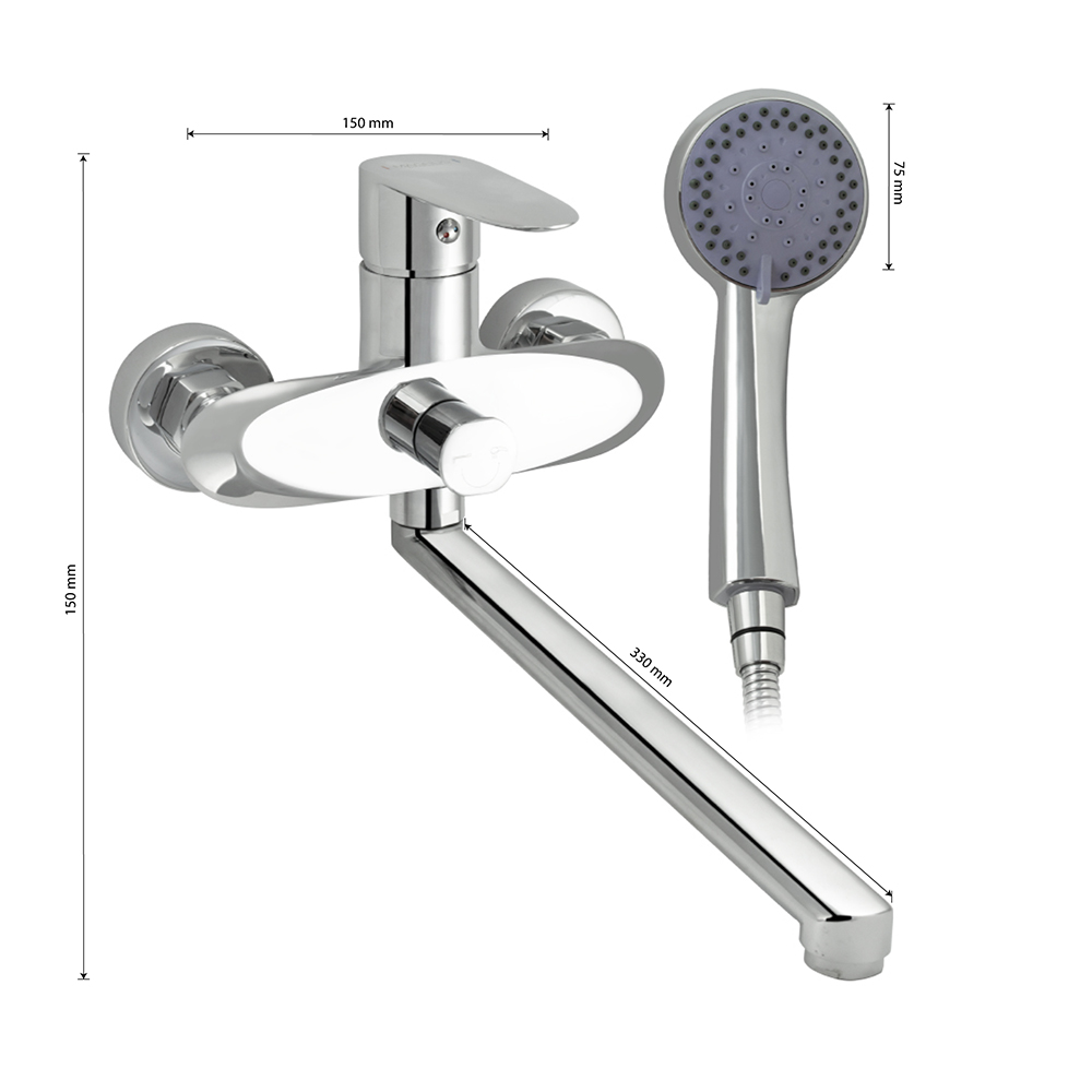 Смеситель в ванную / душевую комнату, латунный корпус, хромированный, с длинным плоским изливом, шаровый с дивертором м/к на корпусе. Картридж d = 35 мм, литая ручка, аэратор для экономии воды, чашки и эксцентрики. Габаритные размеры: ширина 150 мм, высота корпуса 150 мм, длина излива 330 мм, круглая трёхрежимная душевая лейка d = 75 мм, шланг 150 см. Вес - 2,200 кг, объём - 0,00864 м3. В комплекте паспорт, корпус с изливом, дивертор, душевая лейка, шланг, кронштейн, комплект крепежа и прокладок.