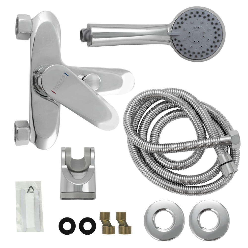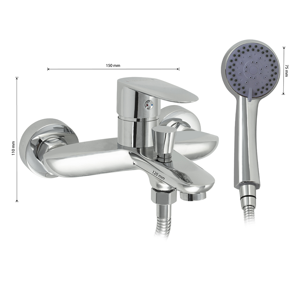 Смеситель в ванную / душевую комнату, латунный корпус, хромированный, с коротким изливом, литой корпус, шаровый, с кнопочным дивертором на корпусе. Картридж d = 35 мм, литая ручка, аэратор для экономии воды, чашки и эксцентрики. Габаритные размеры: ширина 150 мм, высота корпуса 110 мм, длина излива 120 мм, круглая трёхрежимная душевая лейка d = 75 мм, шланг 150 см. Вес - 2,200 кг, объём - 0,00616 м3. В комплекте паспорт, корпус с изливом, дивертор, душевая лейка, шланг, кронштейн, комплект крепежа и прокладок.