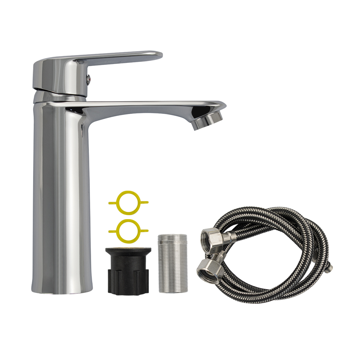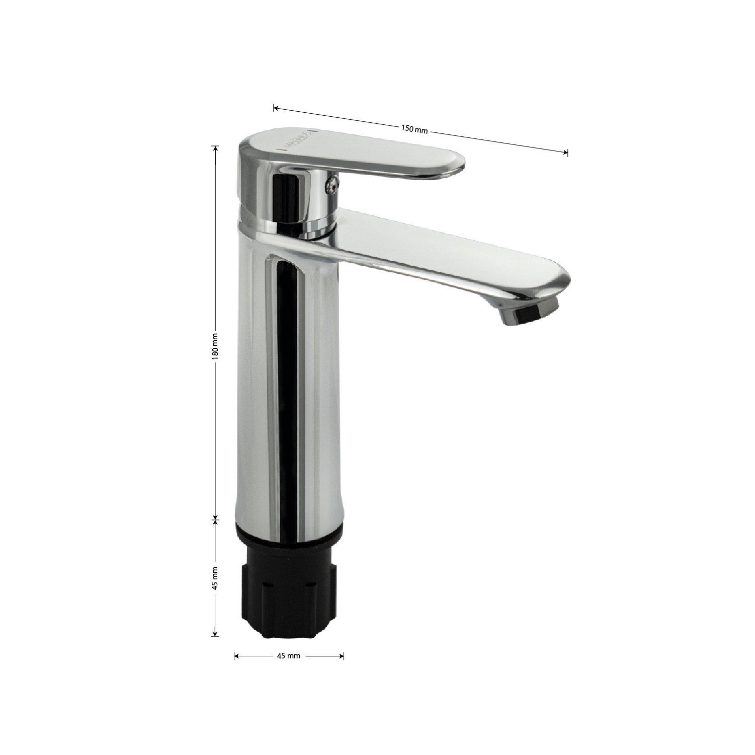 Смеситель для раковины, хромированный, с коротким изливом, литой корпус, литая ручка, шаровый. Крепление резьба - гайка, картридж d = 35 мм. Аэратор для экономии воды. Габаритные размеры: высота 180 мм, длина 150 мм, диаметр посадочного седла 45 мм, длина резьбы 45 мм, длина подводки 450 мм. Вес - 1.36 кг, объём - 0.00262 м3. В комплекте паспорт, корпус, подводка 1/2, крепеж, набор прокладок.