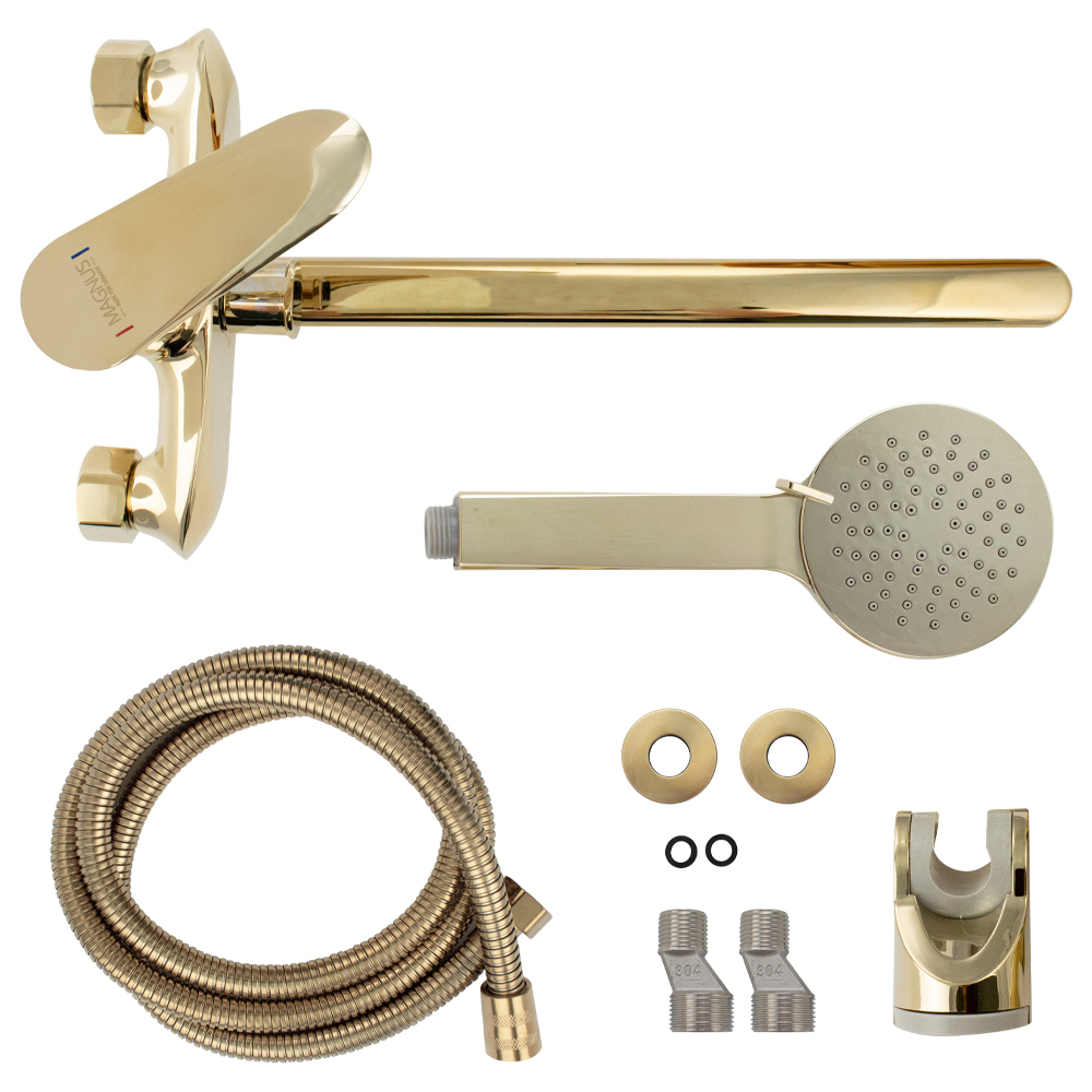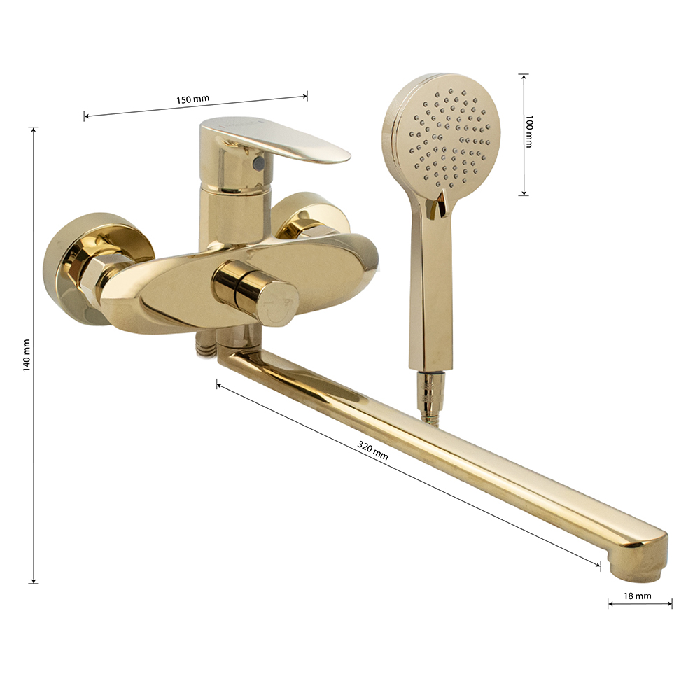 Смеситель в ванную / душевую комнату, латунный корпус под цвет ЗОЛОТА, с длинным плоским изливом, шаровый, с дивертором м/к на корпусе. Картридж d = 35 мм, литая ручка, аэратор для экономии воды, чашки и эксцентрики. Габаритные размеры: ширина 150 мм, высота корпуса 140 мм, длина излива 320 мм, круглая двухрежимная душевая лейка d = 100 мм, шланг 150 см. Вес - 2,300 кг, объём - 0,00864 м3. В комплекте паспорт, корпус с изливом, дивертор, душевая лейка, шланг, кронштейн, комплект крепежа и прокладок.