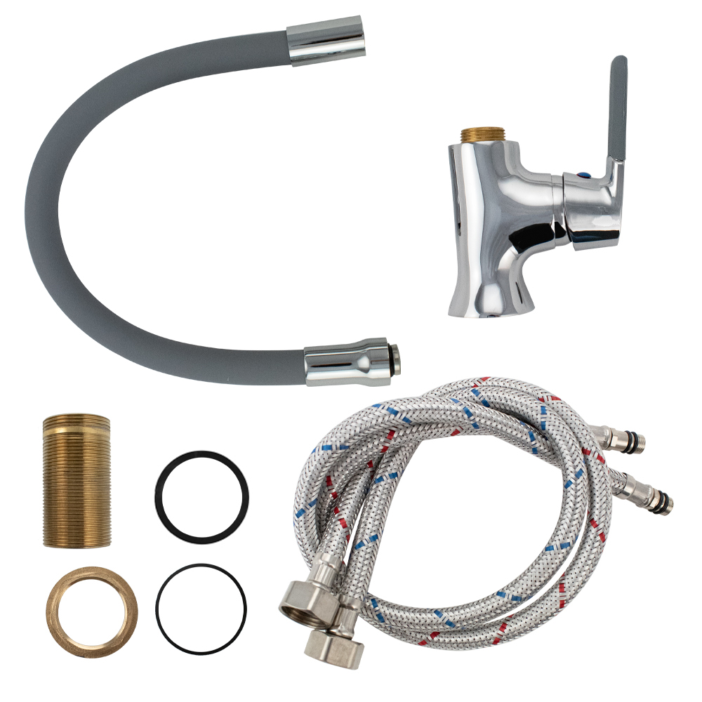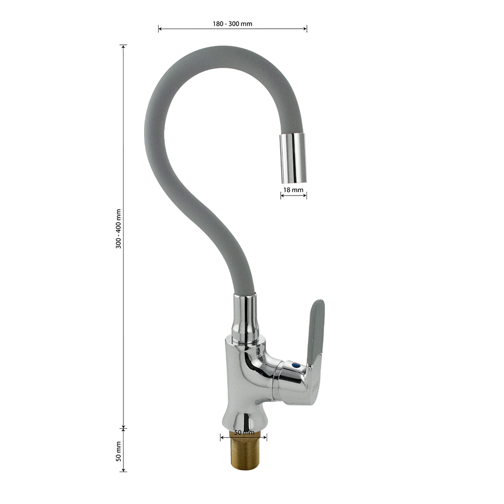 Смеситель для кухонной мойки и раковин, хромированный, боковой, шаровый d = 40 мм, массивный корпус с гибким изливом серого цвета, с аэратором для экономии воды. Материал изготовления — ЦАМ (цинк-алюминий-медь). Крепление резьба - гайка, литая ручка с силиконовой накладкой. Габаритные размеры: высота 300 - 400 мм, длина 180 - 300 мм, диаметр посадочного седла 50 мм, длина резьбы 50 мм, длина подводки 600 мм. Вес - 1,500 кг, объём - 0,00510 м3. В комплекте корпус с изливом, паспорт, подводка 1/2, крепёж. Габаритные размеры коробки: ширина 295 мм, высота 65 мм, глубина 185 мм.