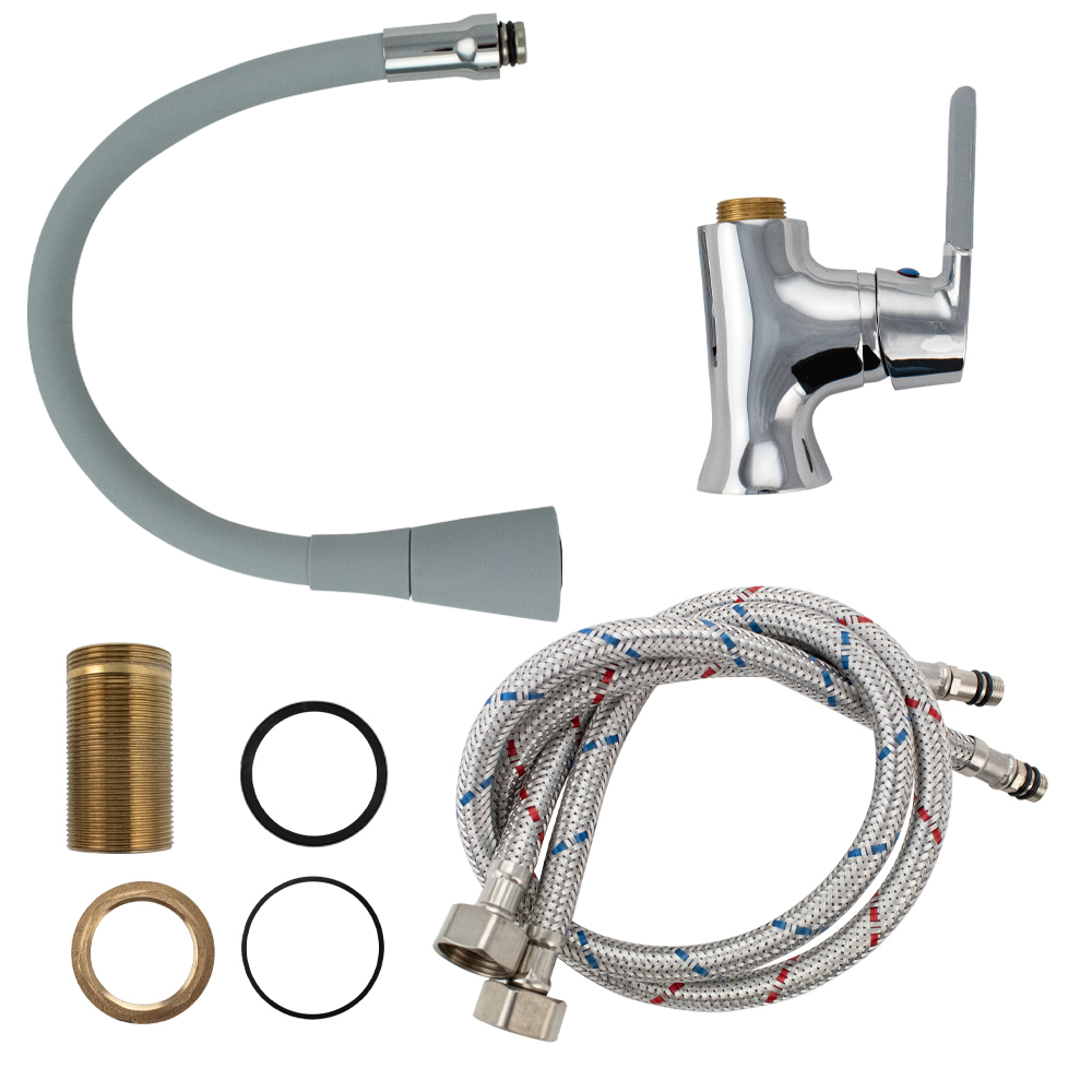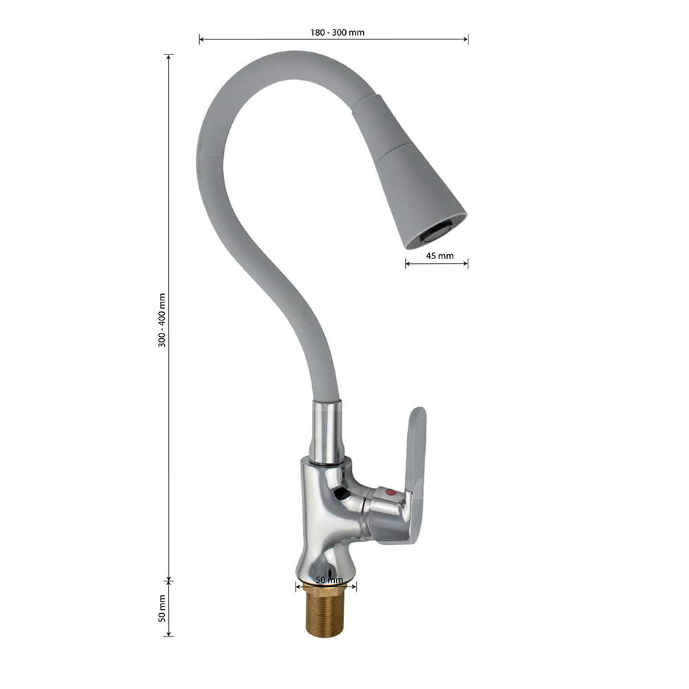 Смеситель для кухонной мойки и раковин, хромированный, боковой, шаровый d = 40 мм, массивный корпус с гибким изливом серого цвета, с большим конусным двухрежимным аэратором для экономии воды. Материал изготовления — ЦАМ (цинк-алюминий-медь). Крепление резьба - гайка, литая ручка с силиконовой накладкой. Габаритные размеры: высота 300 - 400 мм, длина 180 - 300 мм, диаметр посадочного седла 50 мм, длина резьбы 50 мм, длина подводки 600 мм. Вес - 1,500 кг, объём - 0,00510 м3. В комплекте корпус с изливом, паспорт, подводка 1/2, крепёж. Габаритные размеры коробки: ширина 295 мм, высота 65 мм, глубина 185 мм.