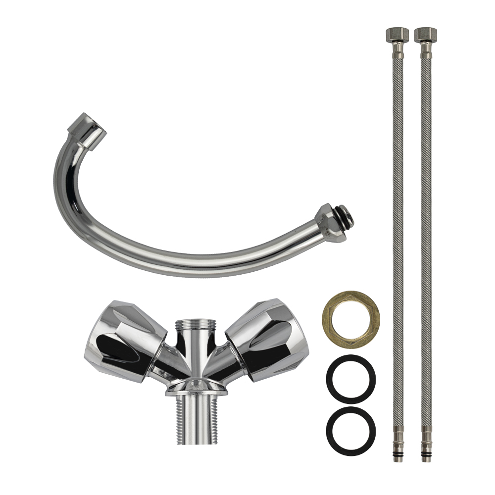 Смеситель для кухонной мойки, хромированный, с высоким изливом. Материал изготовления — ЦАМ (цинк-алюминий-медь) + нержавеющая сталь. Крепление резьба - гайка. Аэратор для экономии воды. Кранбукса м/к 1/2, ручка крест, поворот на 90˚. Габаритные размеры: высота 220 мм, длина 180 мм, диаметр посадочного седла 35 мм, длина резьбы 30 мм, длина подводки  400 мм. Вес - 0,41 кг, объём - 0,0012 м3. В комплекте паспорт, корпус с изливом, подводка 1/2, крепеж, набор прокладок.