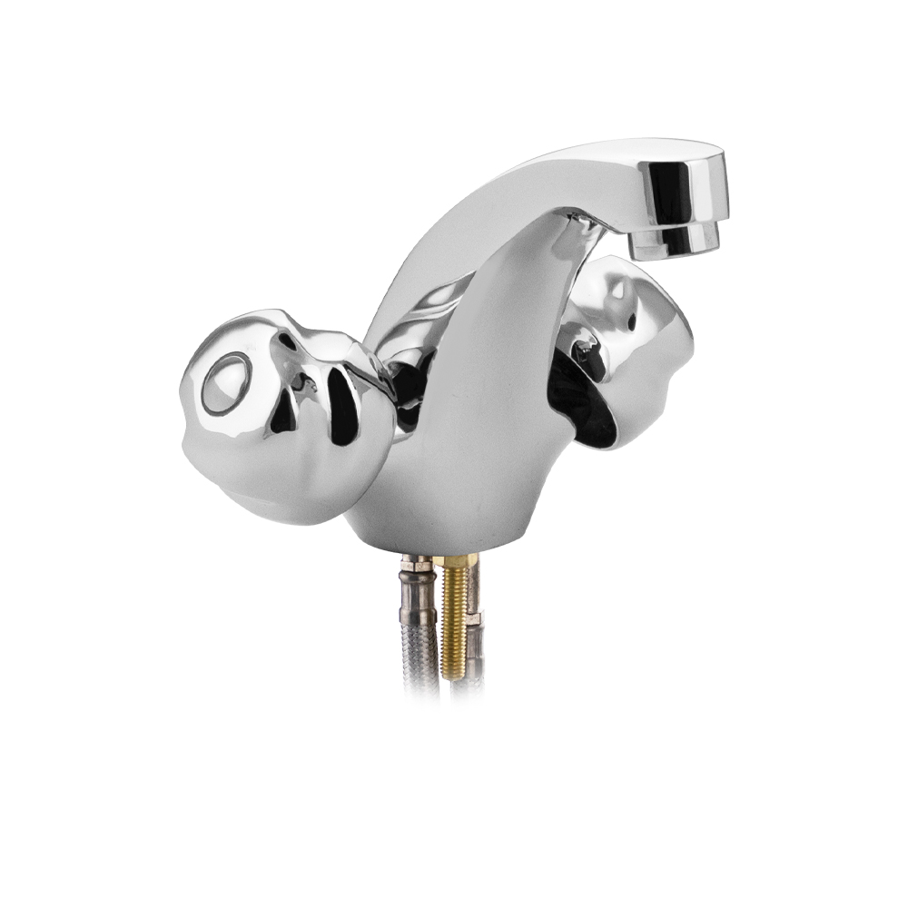 Смеситель для раковины, хромированный, с коротким литым изливом, литой массивный корпус. Материал изготовления — ЦАМ (цинк-алюминий-медь) + нержавеющая сталь. Крепление на шпильке. Кранбукса м/к, ручка круглая, поворот на 90˚. Аэратор для экономии воды. Габаритные размеры: высота 120 мм, длина излива 130 мм, диаметр посадочного седла 50 мм, длина подводки 300 мм. Вес - 1,100 кг, объём - 0,00292 м3. В комплекте паспорт, корпус, подводка 1/2, крепеж, набор прокладок.