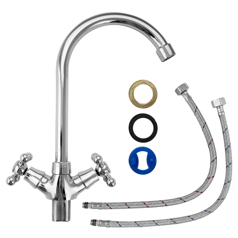 Смеситель для кухонной мойки и раковин, массивный корпус, хромированный, с высоким С-образным изливом. Материал изготовления — ЦАМ (цинк-алюминий-медь) + нержавеющая сталь. Крепление резьба - гайка. Аэратор для экономии воды. Кранбукса м/к 1/2, ручка крест, поворот на 90˚. Габаритные размеры: высота 270 мм, длина 185 мм, диаметр посадочного седла 45 мм, длина резьбы 35 мм, длина подводки 350 мм. Вес - 0,900 кг, объём - 0,00400 м3. В комплекте паспорт, корпус с изливом, подводка 1/2, крепеж, набор прокладок.