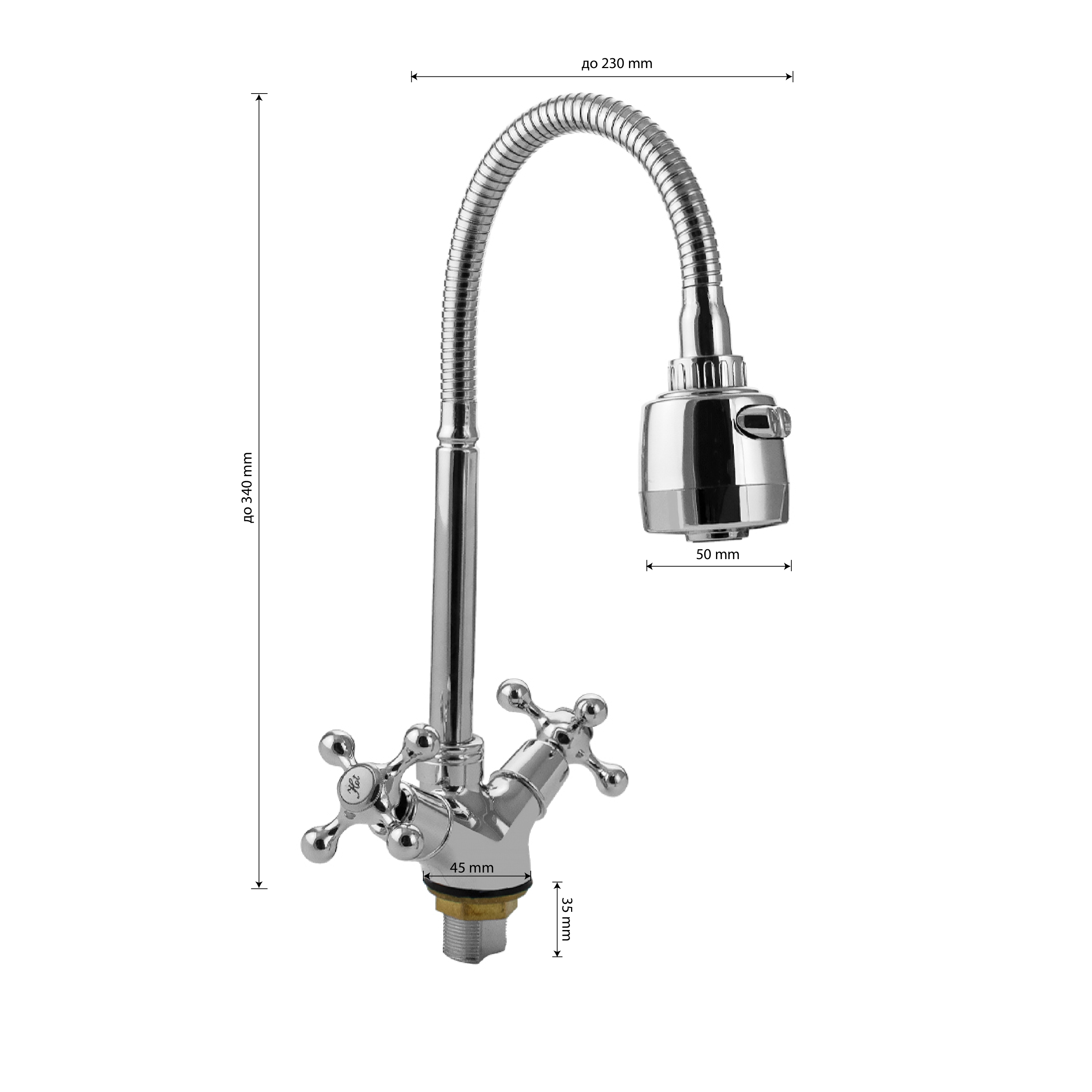 Смеситель для кухонной мойки и раковин, массивный корпус с гибким изливом, хромированный, с двухрежимным аэратором для экономии воды. Материал изготовления — ЦАМ (цинк-алюминий-медь) + нержавеющая сталь. Крепление резьба - гайка. Кранбукса м/к 1/2, ручка крест, поворот на 90˚. Габаритные размеры: высота 280 - 340 мм, длина 180 - 230 мм, диаметр посадочного седла 45 мм, длина резьбы 35 мм, длина подводки 350 мм. Вес - 1,100 кг, объём - 0,00317 м3. В комплекте корпус с изливом, паспорт, подводка 1/2, крепёж.