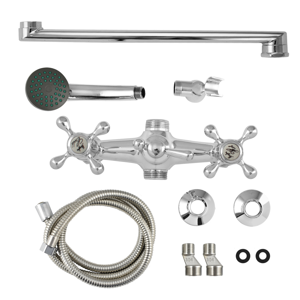 Смеситель хромированный, в ванную / душевую комнату с длинным плоским изливом. Материал изготовления — ЦАМ (цинк-алюминий-медь) + нержавеющая сталь. Кранбуксы металлокерамика 1/2, ручки крест, поворот на 90˚. Дутый, большой корпус с шаровым переключением подачи воды, аэратор для экономии воды, подставка - "рога" для лейки, чашки, гайки и эксцентрики из нержавеющей стали. Габаритные размеры: ширина 150 мм, высота 140 мм, длина излива 300 мм, диаметр чашки 60 мм, длина шланга 150 см, лейка d = 65 мм. Вес - 1,400 кг, объём - 0,00529 м3. В комплекте корпус с изливом, паспорт, крепёж, прокладки, лейка, шланг.