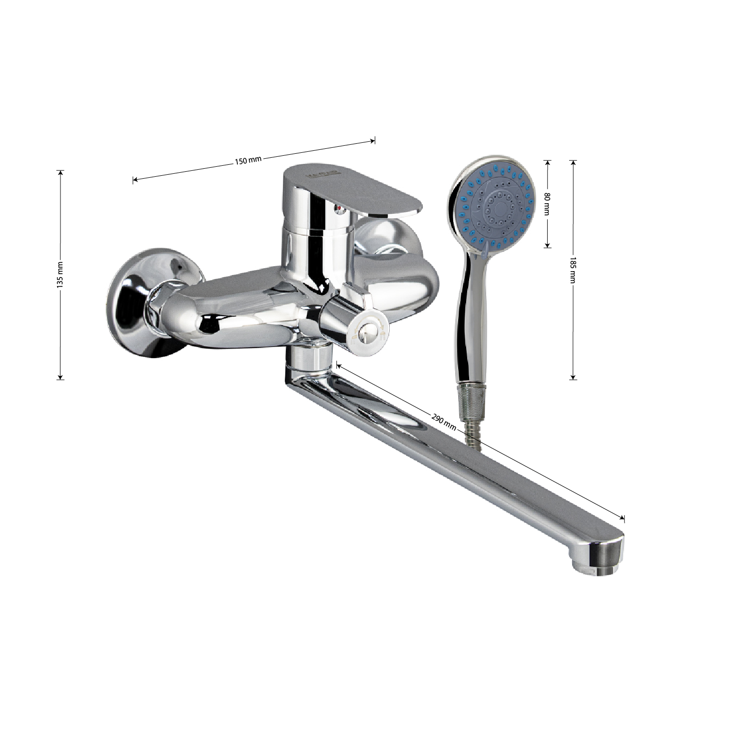 Смеситель хромированный в ванную / душевую комнату с длинным, плоским изливом, дутый корпус, шаровый, с дивертором м/к на корпусе. Материал изготовления — ЦАМ (цинк-алюминий-медь) + нержавеющая сталь. Картридж d = мм, ручка литая, аэратор для экономии воды, чашки и эксцентрики. Габаритные размеры: ширина 150 мм, высота корпуса 135 мм, длина излива 290 мм, трёхрежимная душевая лейка d = 80 мм, шланг 150 см. Вес - 1,51 кг, объём - 0,00521 м3. В комплекте паспорт, корпус с изливом, дивертор, душевая лейка, шланг, кронштейн, комплект крепежа и прокладок.