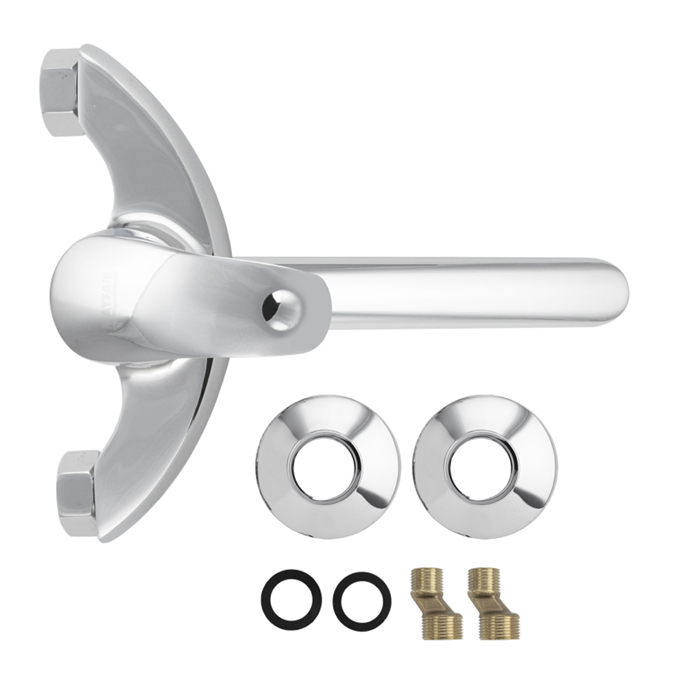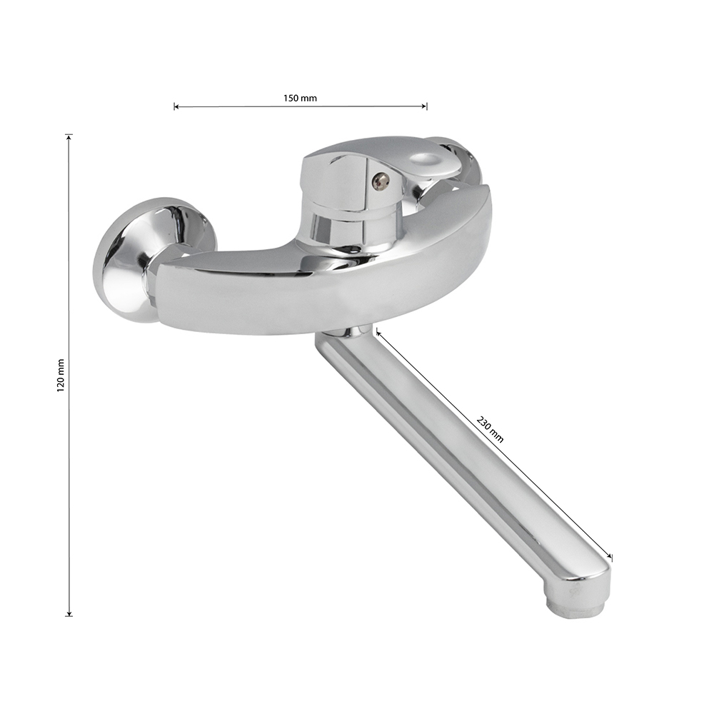 Смеситель от стены, для кухонной мойки и раковин, хромированный, изогнутый дутый корпус, шаровый, с плоским изливом, аэратором для экономии воды, картридж d = 40 мм, ручка литая. Материал изготовления — ЦАМ (цинк-алюминий-медь) + нержавеющая сталь. Габаритные размеры: ширина 150 мм, высота 120 мм, длина излива 230 мм, диаметр чашки 65 мм. Вес - 1,000 кг, объём - 0,00377 м3. В комплекте корпус с изливом, паспорт, крепёж.