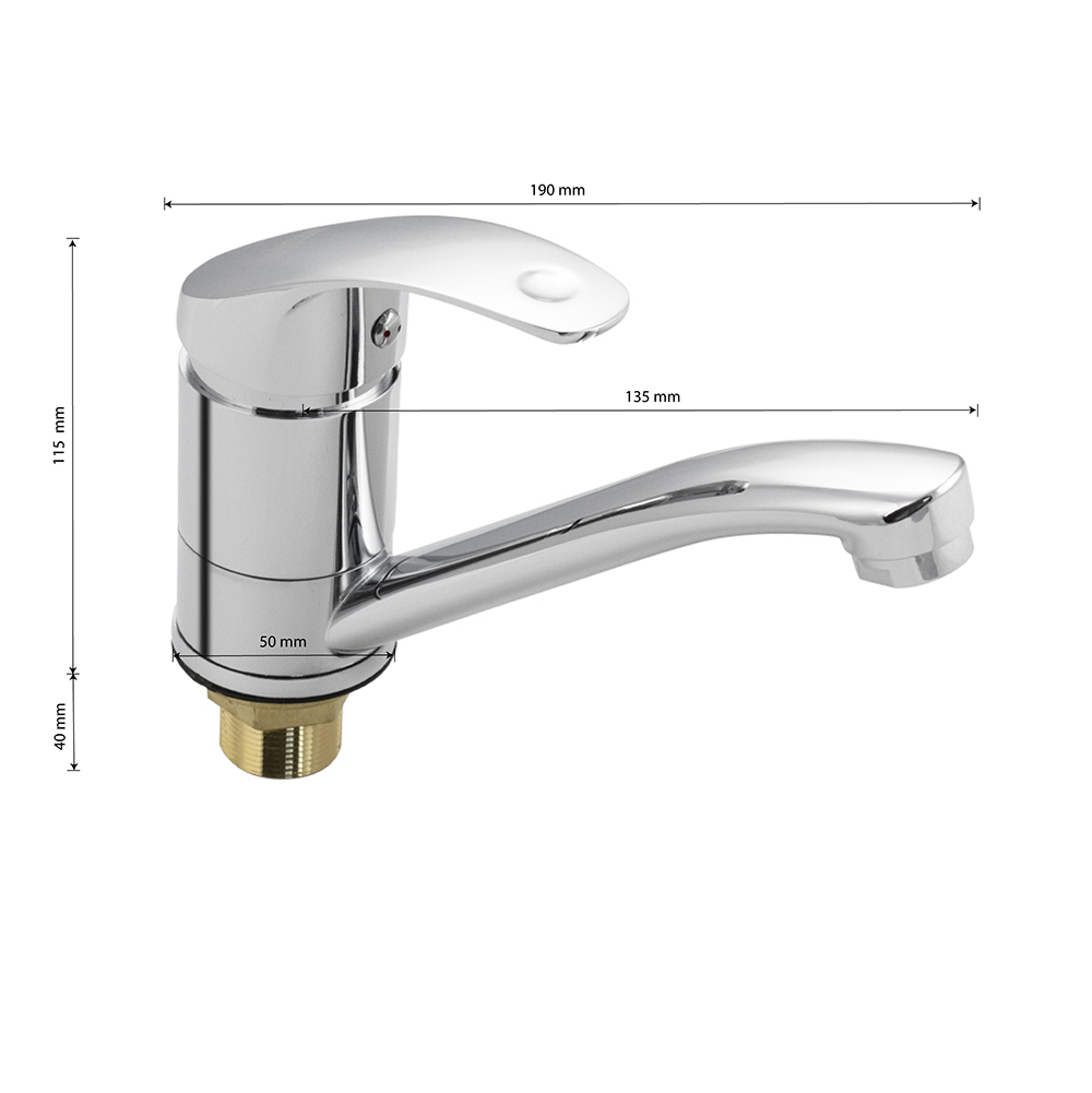 Смеситель для кухонной мойки и раковины, хромированный, с коротким, поворотным изливом, шаровый, литая ручка. Материал изготовления — ЦАМ (цинк-алюминий-медь) + нержавеющая сталь. Крепление резьба - гайка, картридж d = 40 мм. Аэратор для экономии воды. Габаритные размеры: высота 115 мм, длина 190 мм, длина излива135 мм, диаметр посадочного седла 50 мм, длина резьбы 40 мм, длина подводки 350 мм. Вес - 0,800 кг, объём - 0,00194 м3. В комплекте паспорт, корпус, подводка 1/2, крепеж, набор прокладок.