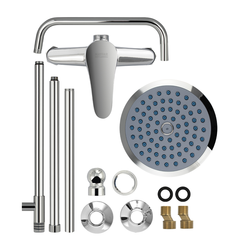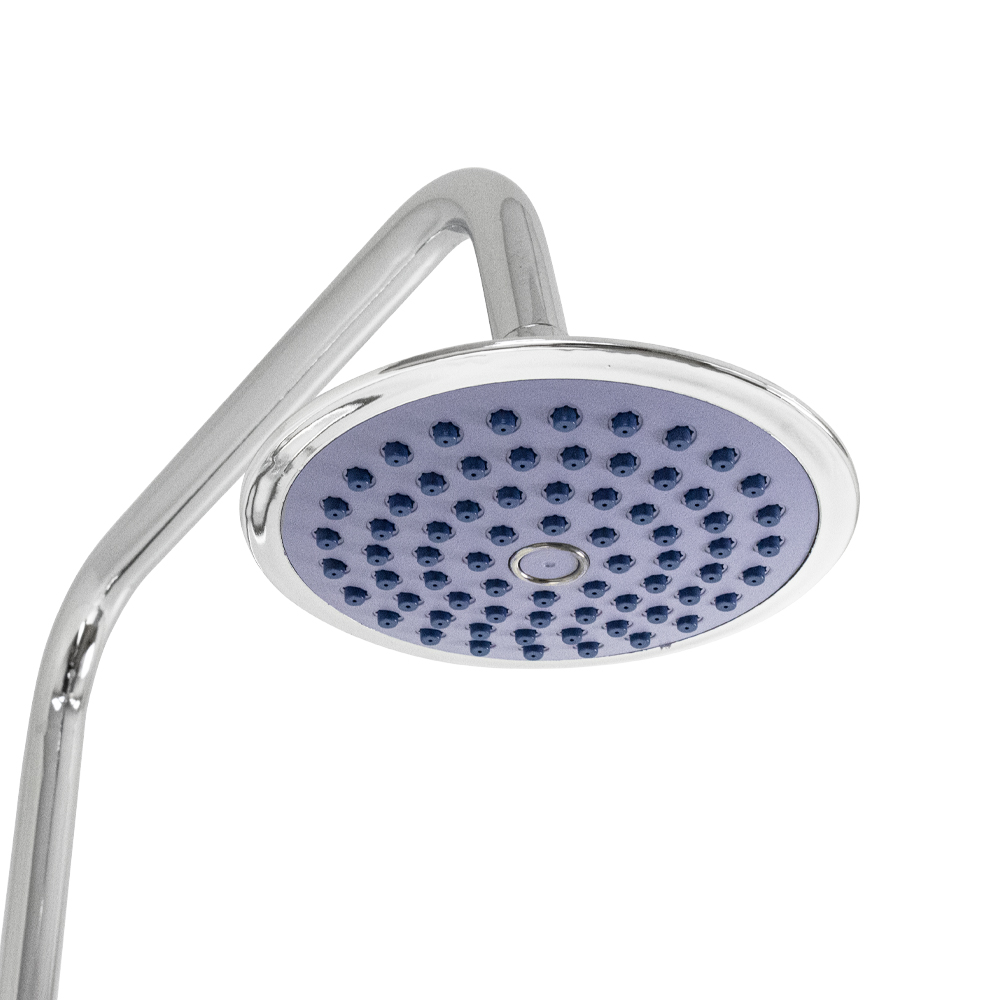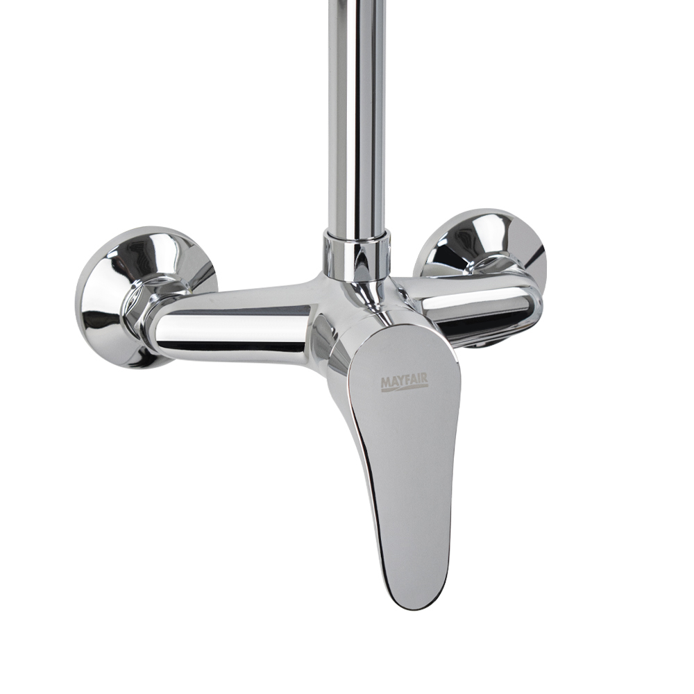Смеситель хромированный в ванную / душевую комнату с жёстким высоким изливом, шаровый, с большой лейкой "тропический душ". Материал изготовления — ЦАМ (цинк-алюминий-медь). Картридж d = 40 мм, литая ручка, крепление к стене, чашки, гайки и эксцентрики из нержавеющей стали. Габаритные размеры: высота 1200 мм, ширина смесителя 150 мм, высота смесители 120 мм, длина излива верхнего душа 330 мм, рассеиватель из нержавеющей стали d = 150 мм. Вес - 1.300 кг, объём - 0,01200 м3. В комплекте корпус, паспорт, рассеиватель, излив - штанга, крепеж.