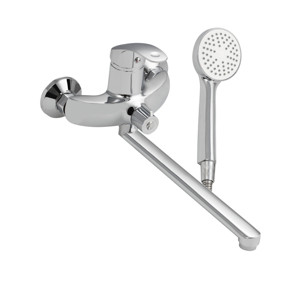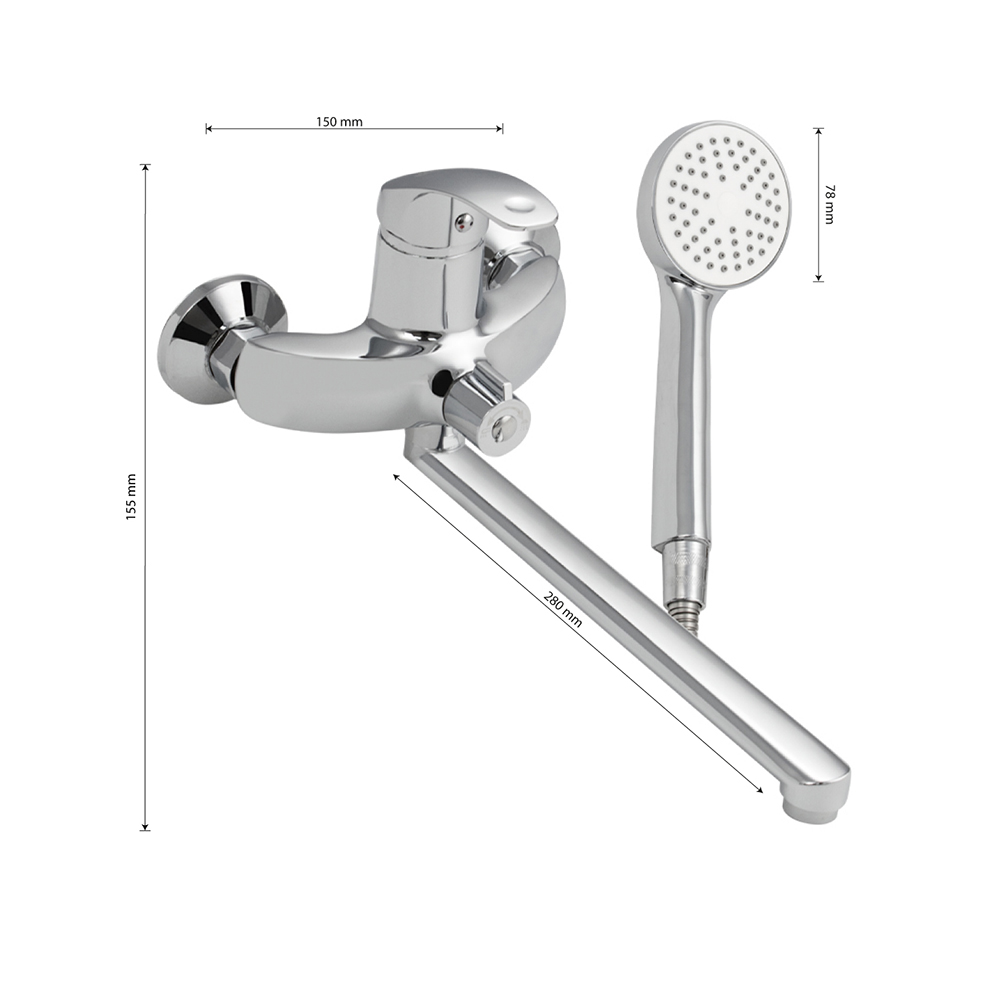 Смеситель хромированный в ванную / душевую комнату с длинным, плоским изливом, изогнутый дутый корпус, шаровый, с дивертором м/к на корпусе. Материал изготовления — ЦАМ (цинк-алюминий-медь) + нержавеющая сталь. Картридж d = 40 мм, ручка литая, аэратор для экономии воды, чашки и эксцентрики. Габаритные размеры: ширина 150 мм, высота корпуса 155 мм, длина излива 280 мм, трёхрежимная душевая лейка d = 78 мм, шланг 150 см. Вес - 1,500 кг, объём - 0,00435 м3. В комплекте паспорт, корпус с изливом, дивертор, душевая лейка, шланг, кронштейн, комплект крепежа и прокладок.