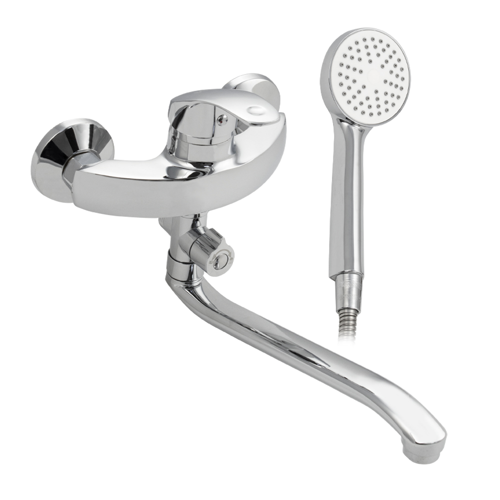 Смеситель хромированный в ванную / душевую комнату с длинным, плоским изливом, изогнутый дутый корпус, шаровый, с дивертором м/к. Материал изготовления — ЦАМ (цинк-алюминий-медь) + нержавеющая сталь. Картридж d = 40 мм, ручка литая, аэратор для экономии воды, чашки и эксцентрики. Габаритные размеры: ширина 150 мм, высота корпуса 190 мм, длина излива 300 мм, душевая лейка d = 78 мм, шланг 150 см. Вес - 1,400 кг, объём - 0,00435 м3. В комплекте паспорт, корпус с изливом, дивертор, душевая лейка, шланг, кронштейн, комплект крепежа и прокладок.
