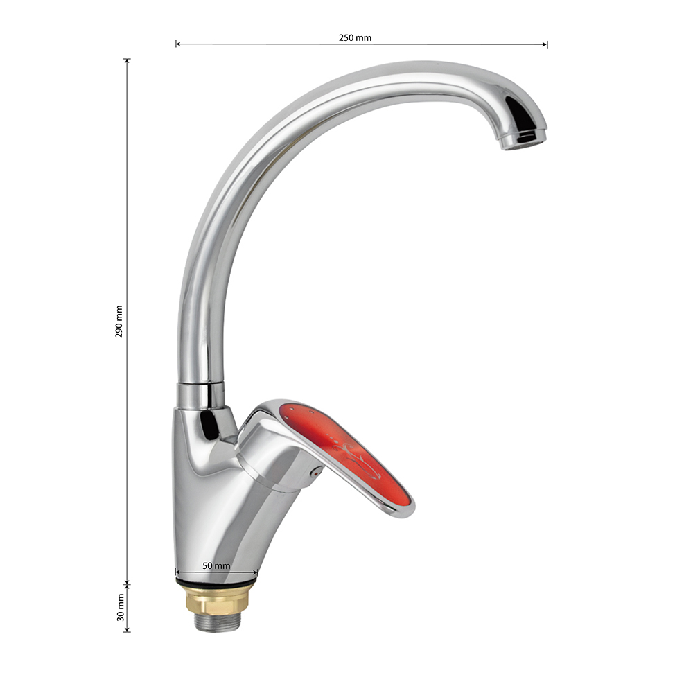 Смеситель для кухонной мойки и раковин, корпус хромированный, боковой, с высоким С-образным изливом, шаровый. Материал изготовления — ЦАМ (цинк-алюминий-медь) + нержавеющая сталь. Крепление резьба - гайка, картридж d = 40 мм, красная ручка с узором. Аэратор для экономии воды. Габаритные размеры: высота 290 мм, длина 250 мм, диаметр посадочного седла 50 мм, длина резьбы 30 мм, длина подводки 400 мм. Вес - 1,200 кг, объём - 0,00490 м3. В комплекте паспорт, корпус с изливом, подводка 1/2, крепеж, набор прокладок.