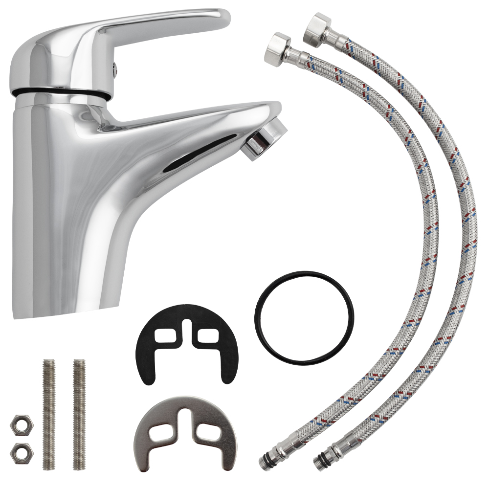 Смеситель для раковины, хромированный, с коротким изливом, литой корпус, сатеновая ручка с узором, шаровый. Материал изготовления — ЦАМ (цинк-алюминий-медь) + нержавеющая сталь. Крепление на шпильках, картридж d = 40 мм. Аэратор для экономии воды. Габаритные размеры: высота 150 мм, длина 140 мм, длина излива 90 мм, диаметр посадочного седла 50 мм, длина резьбы 40 мм, длина подводки 400 мм. Вес - 1,200 кг, объём - 0,00200 м3. В комплекте паспорт, корпус, подводка 1/2, крепеж, набор прокладок.